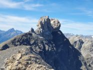 Der weitere Gratverlauf sieht schlimmer aus, als das was er ist. Sobald es auf dem Grat zu anspruchsvoll wird, komme ich in der W-Flanke über Bänder ziemlich gut bis zum Piz San Jon d'Immez voran (T5, I+).