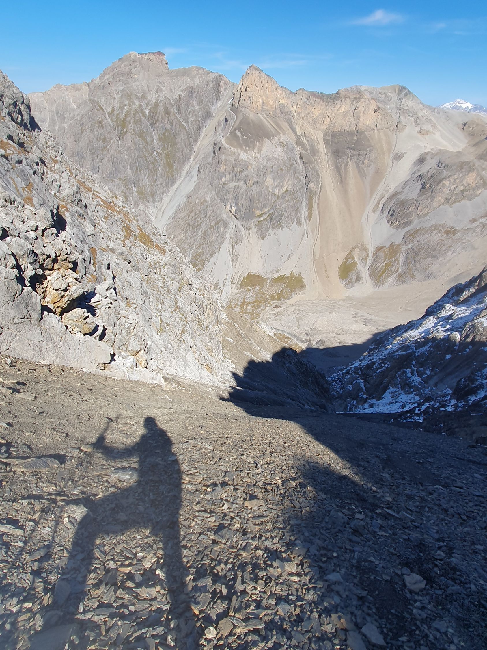Für den Abstieg wähle ich zuerst die Aufstiegsroute, steige jedoch das zweite SW-Couloir hoch zum Grat, quere nördlich hinüber zum Sattel, wo das NE-Couloir anfängt.