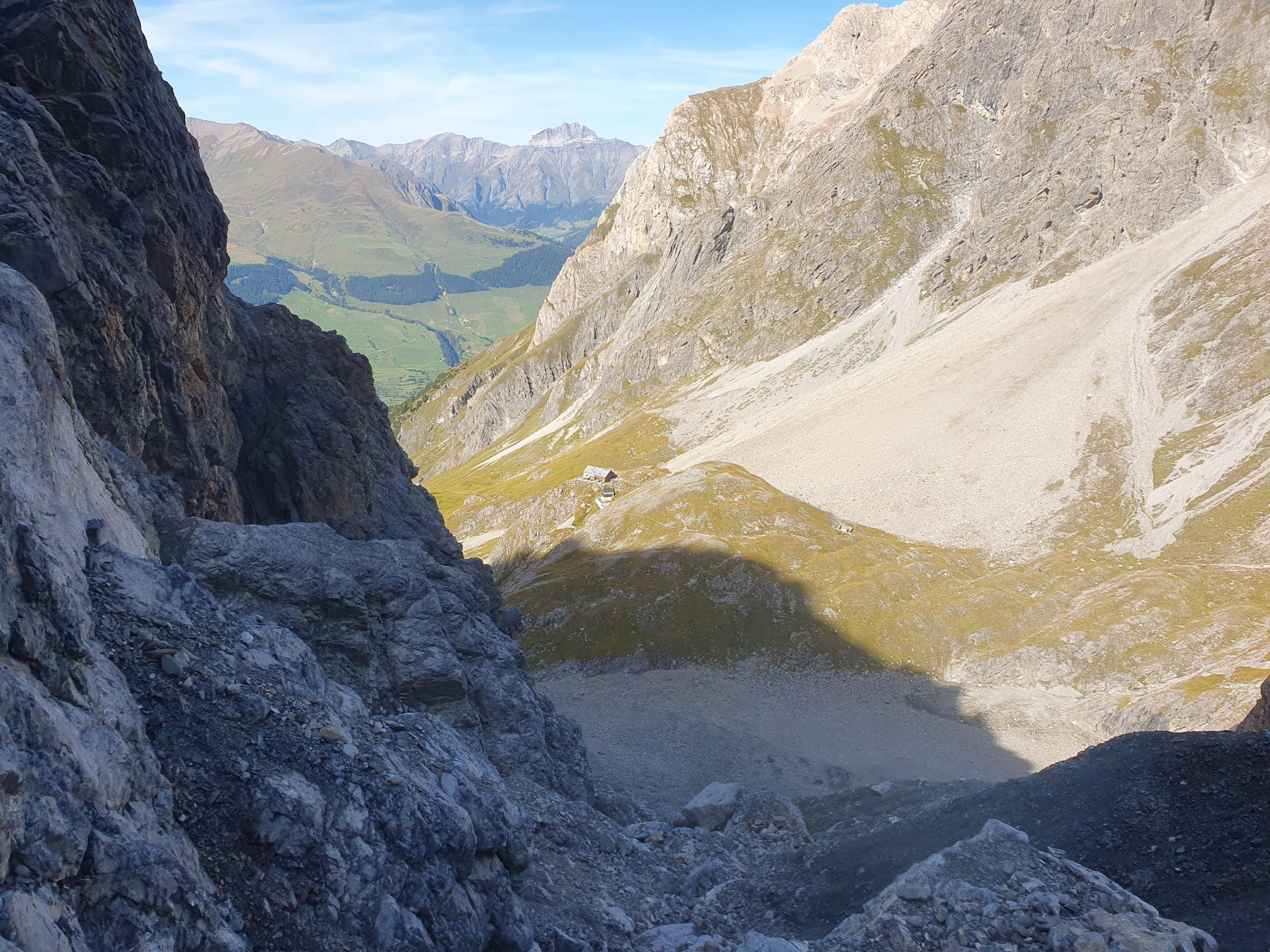 Der weitere Gratverlauf wird leicht etwas anspruchsvoller. Zuerst steigt man auf dem Grat oder südlich davon mühsam über losen Schutt hinab zum flacheren Gratverlauf, und wo dieser abrupt endet, suche ich südlich davon den nächst besten Band, um zum Sattel zu gelangen, wo das grosse NE-Couloir zur Chamonna Lischana hinabzieht. Ich steige diesen jedoch nicht hoch, sondern traversiere unterhalb in sehr steilem Gelände das erste erdige und nasse SW-Couloir, klettere über einen Felsausläufer, traversiere das zweite etwas angenehmere SW-Couloir und steige weiter in der SW-Flanke steil über Schrofen zum Piz San Jon Dadora (T5+, I) mit Steinmann und ohne Gipfelbuch und besuche noch kurz den W-Gipfel mit Stock. Hier eine schöne Sicht zum anspruchsvollen NW-Grat der Biblioteca. Hier oben wieder eine halbstündige Pause genossen.