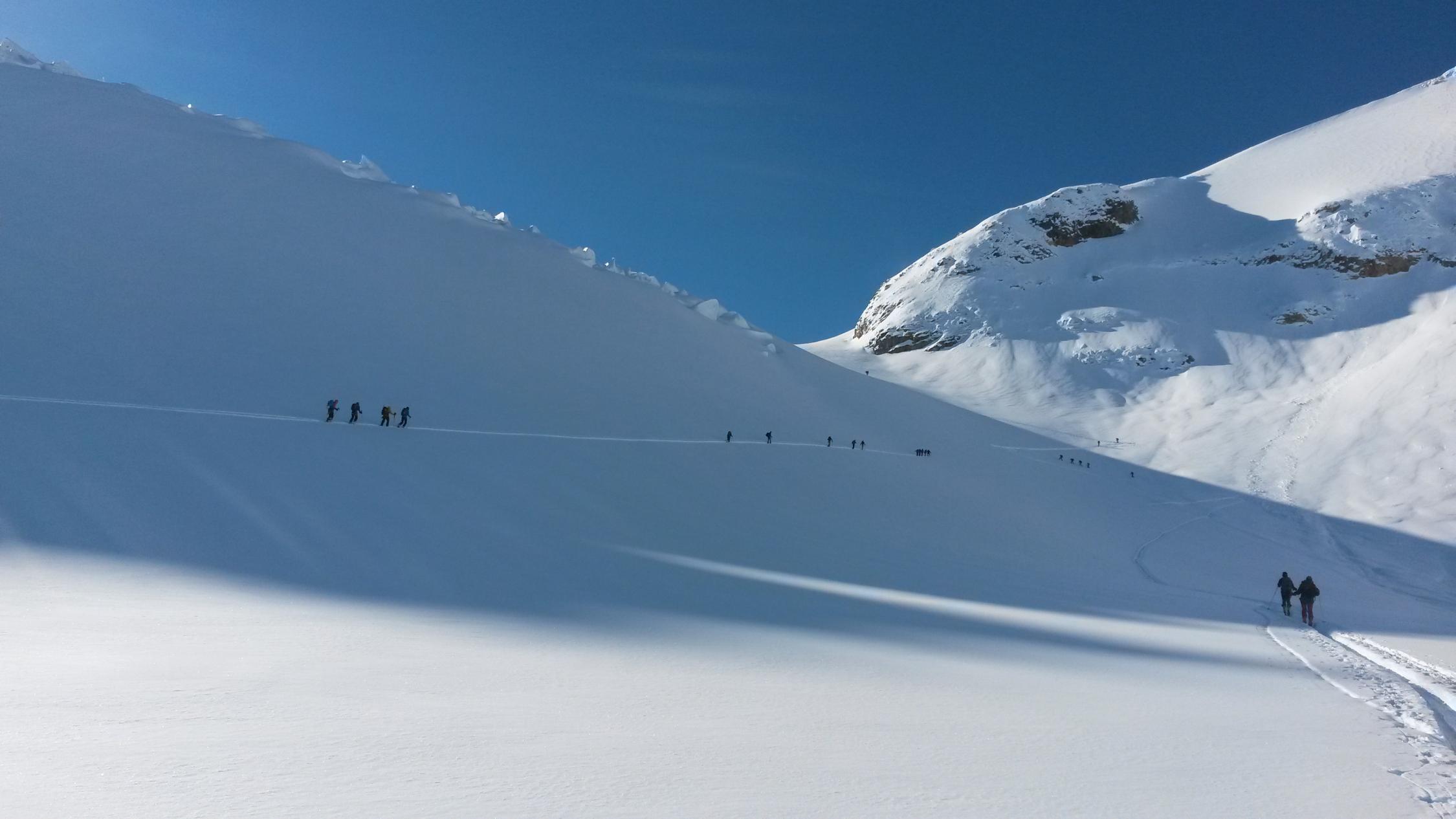 Es herrschte heute gosser Andrang am Gwächtenhorn und Sustenhorn. Schwer zusagen, wie viel Neuschnee es die letzten Tage in der Gegend gegeben hat, aber es hat reichlich. Wir konnten ab dem Parkplatz loslaufen. Im Tagesverlauf wurde der Schnee in den unteren Partien doch recht schwer. Konnten die ganze Tour ohne Harscheisen gehen. Der Wind war unser ständiger Begleiter, dementsprechend viele Spontanlawinen, die zum Teil bis an diverse unüberlegt angelegte Aufstiegsspuren herankamen. Vorsicht ist geboten und vielleicht auch mal alte Lawinenkegel etwas genauer in Augenschein nehmen!