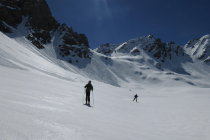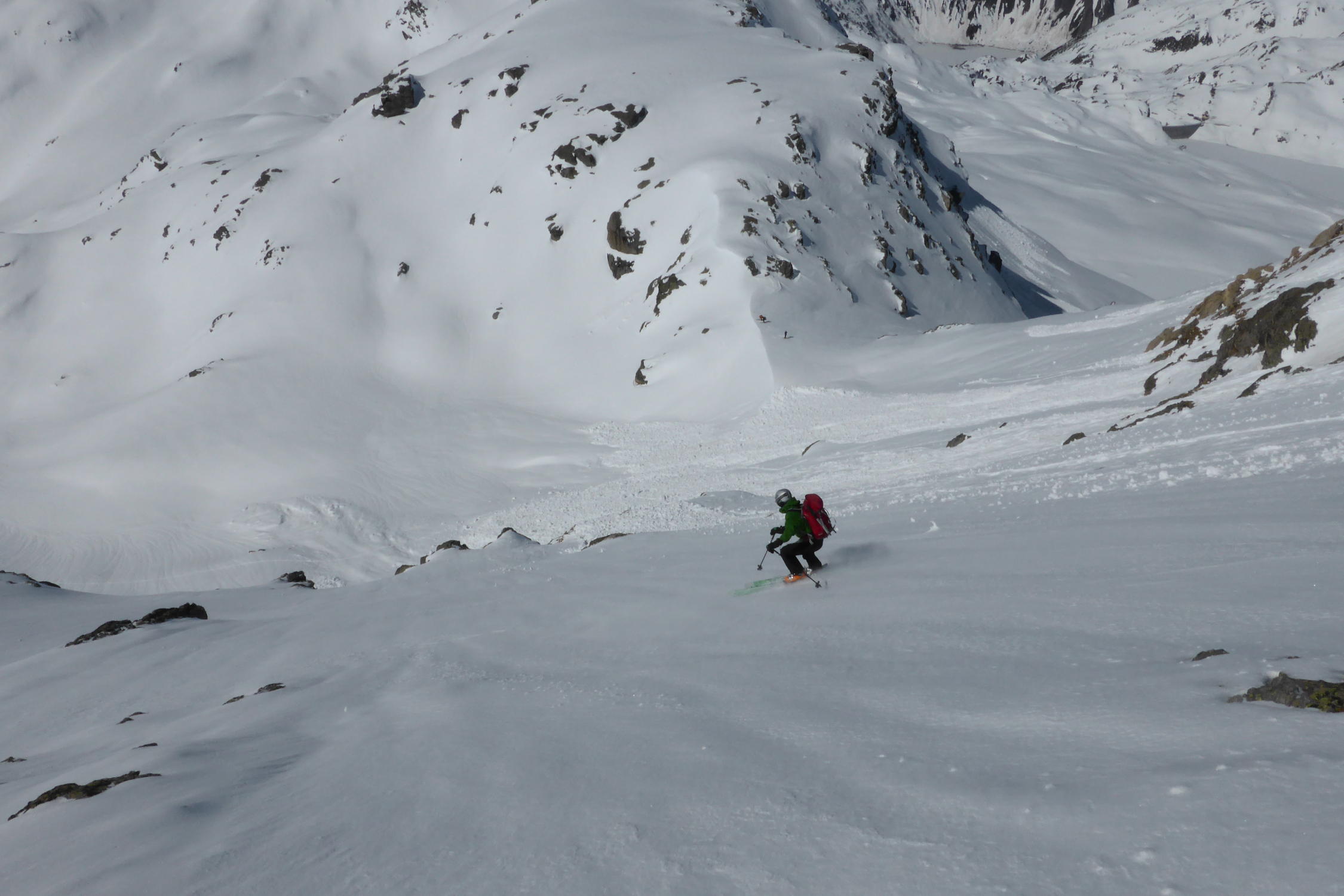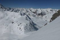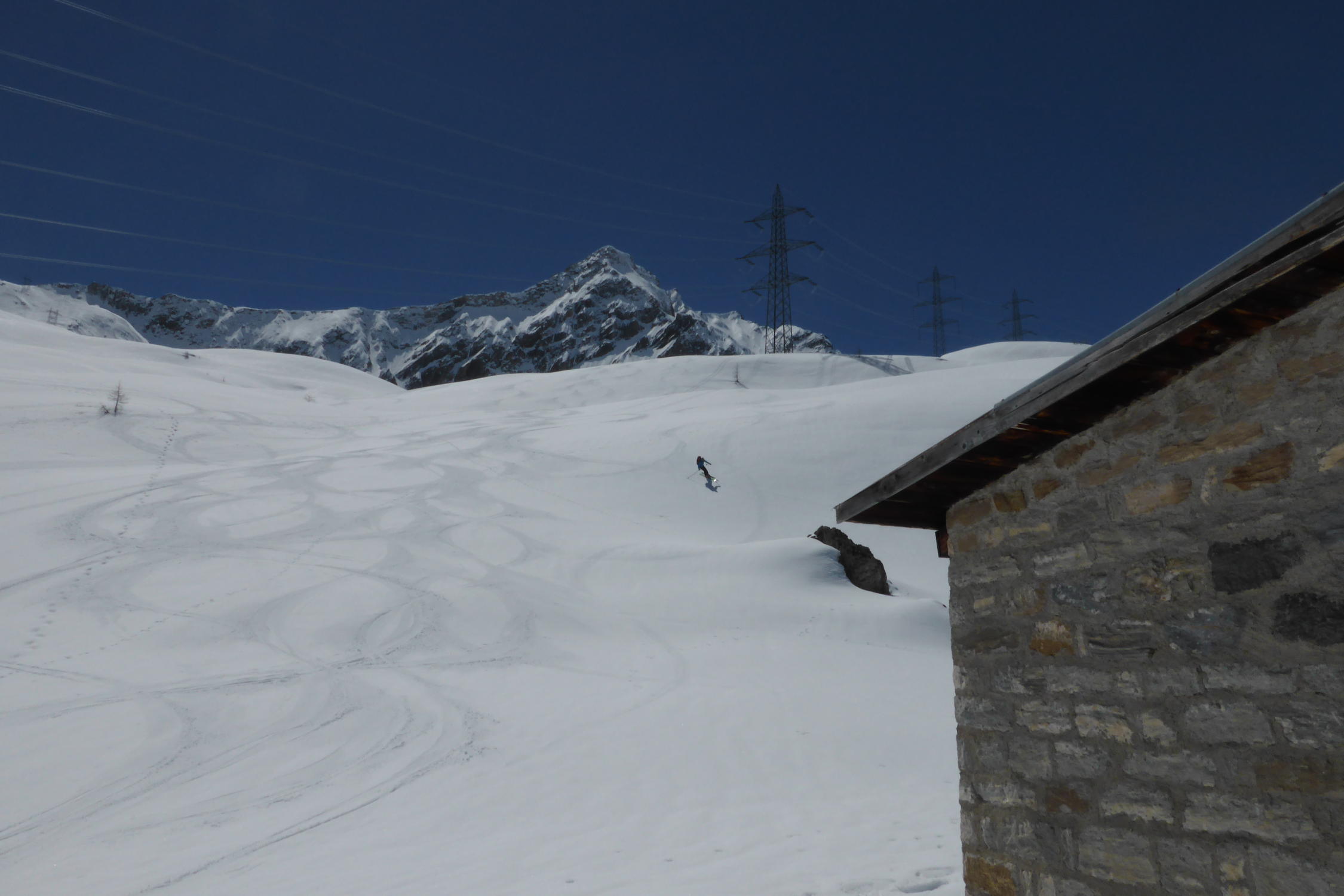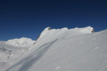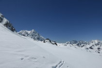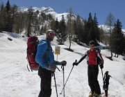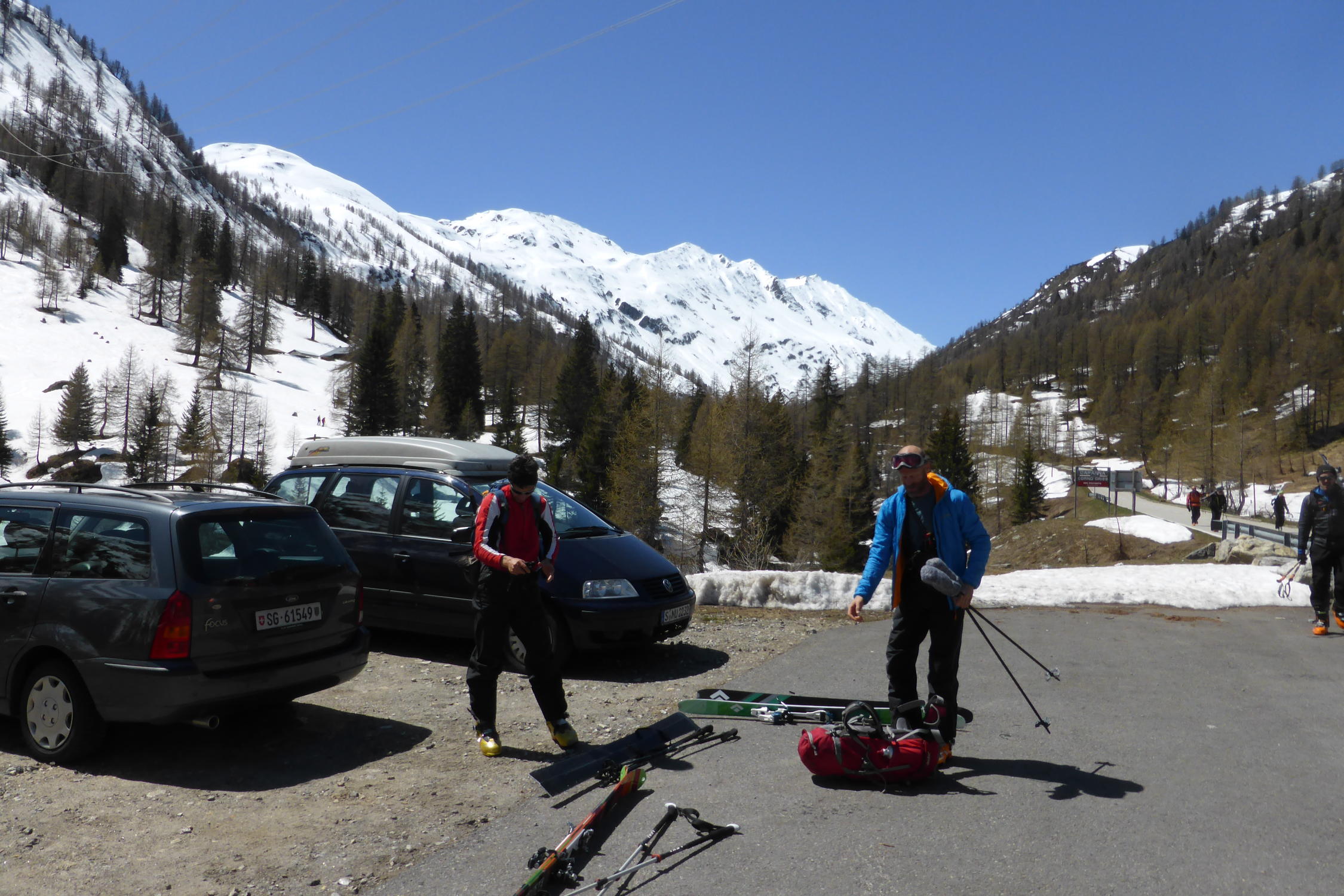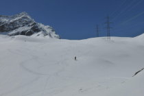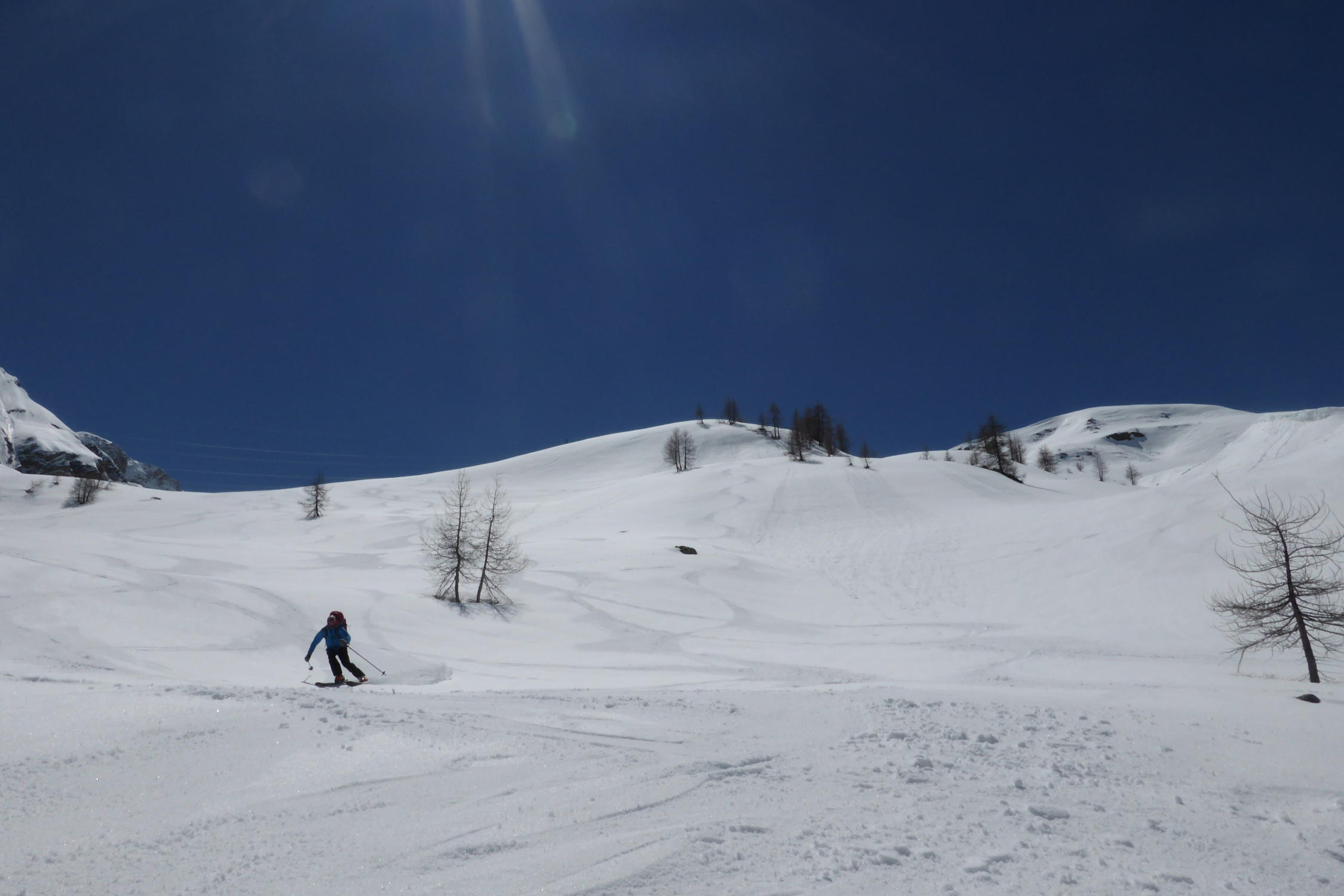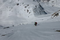 Nach einer Sternennacht am Morgen hart, in Gipfelnähe etwas Pulver, später Sulzschnee unterhalb vom Passo San Giacamo
