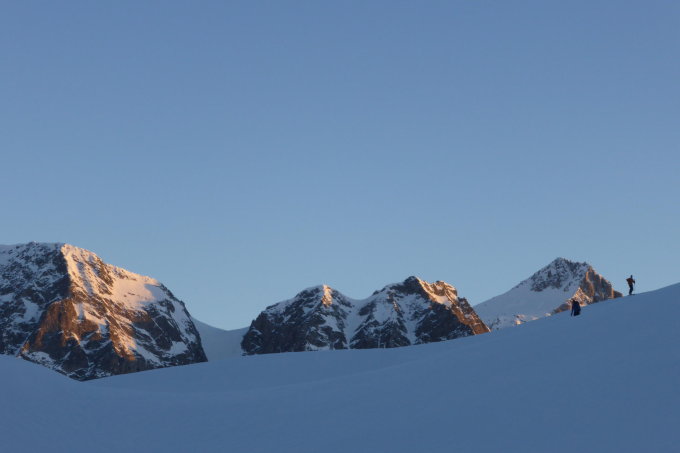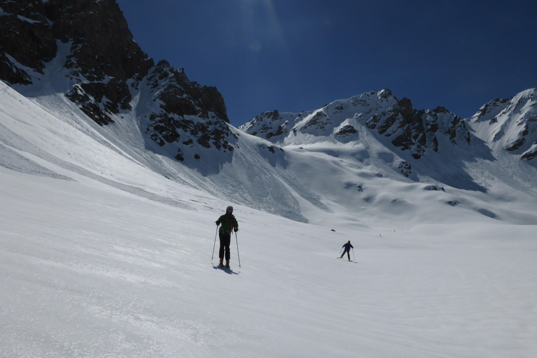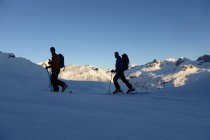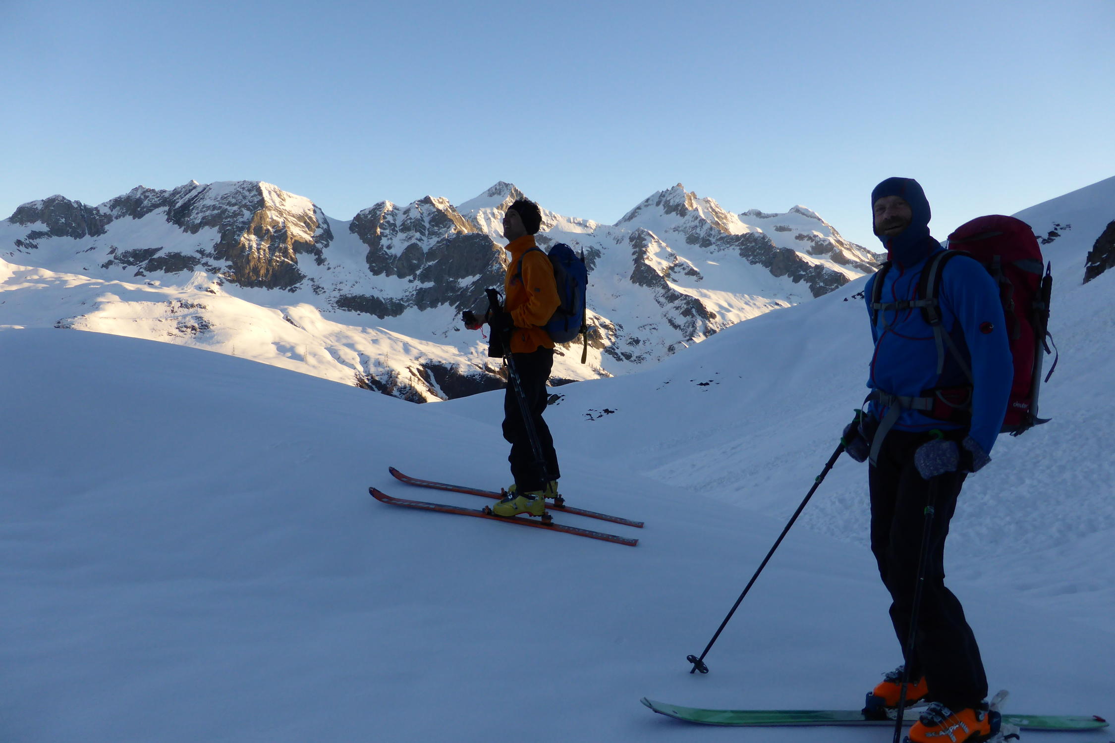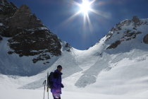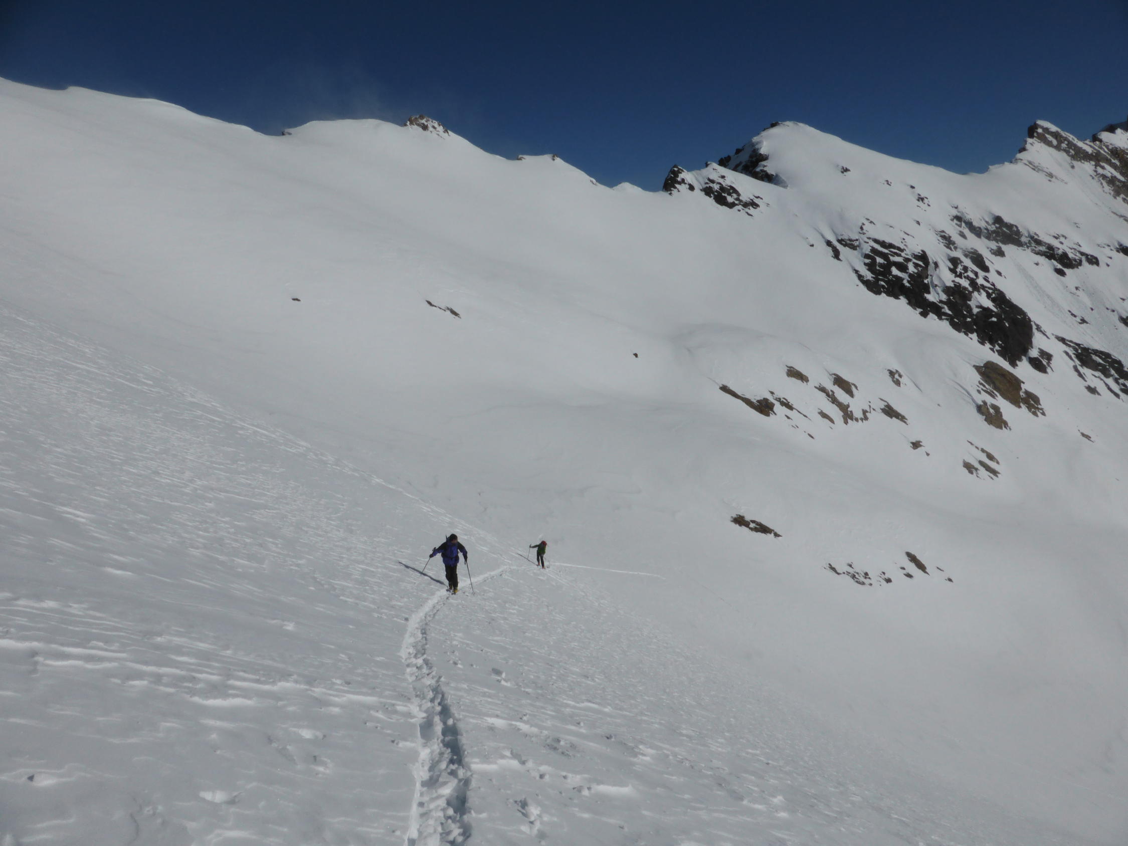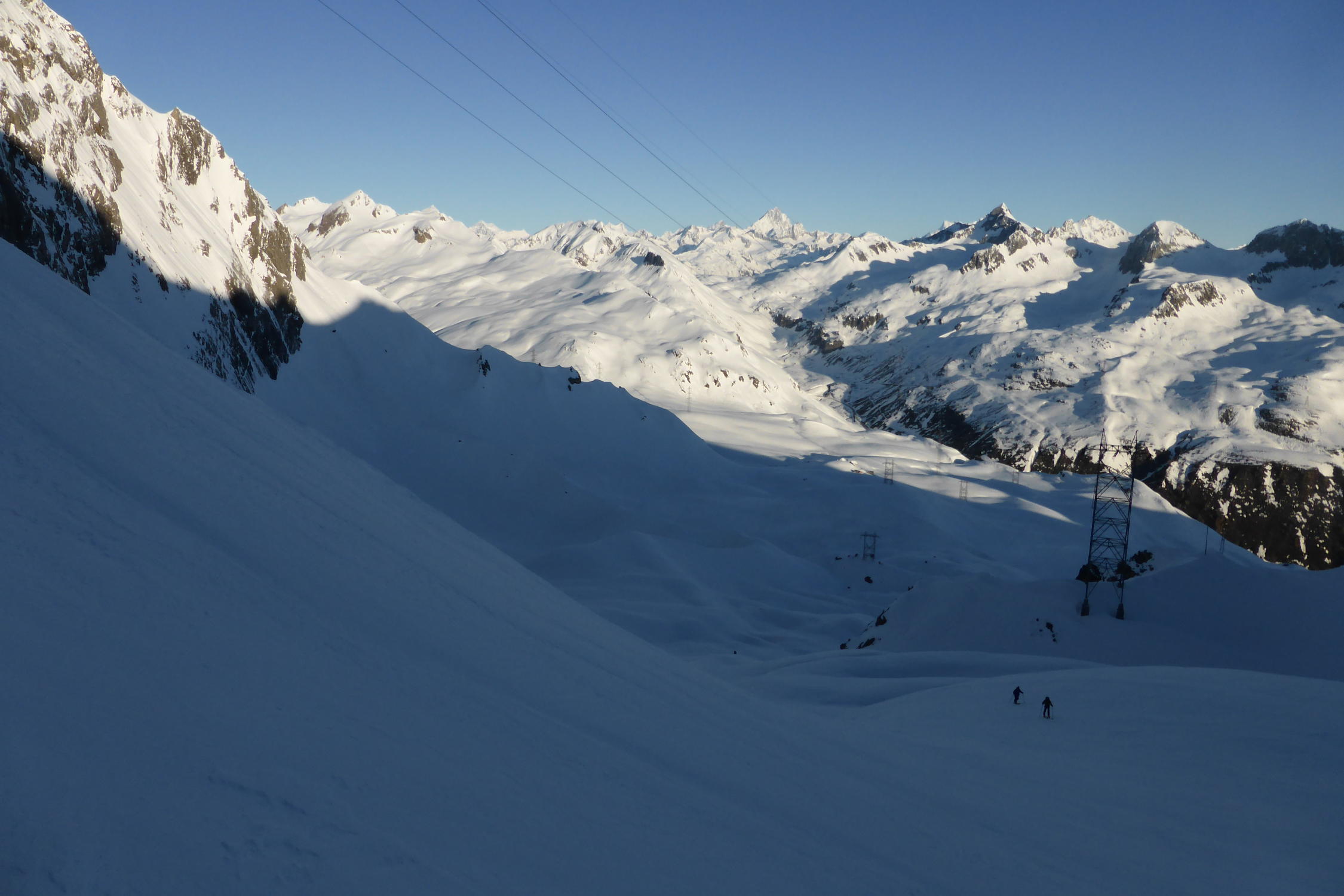 Nach einer Sternennacht am Morgen hart, in Gipfelnähe etwas Pulver, später Sulzschnee unterhalb vom Passo San Giacamo