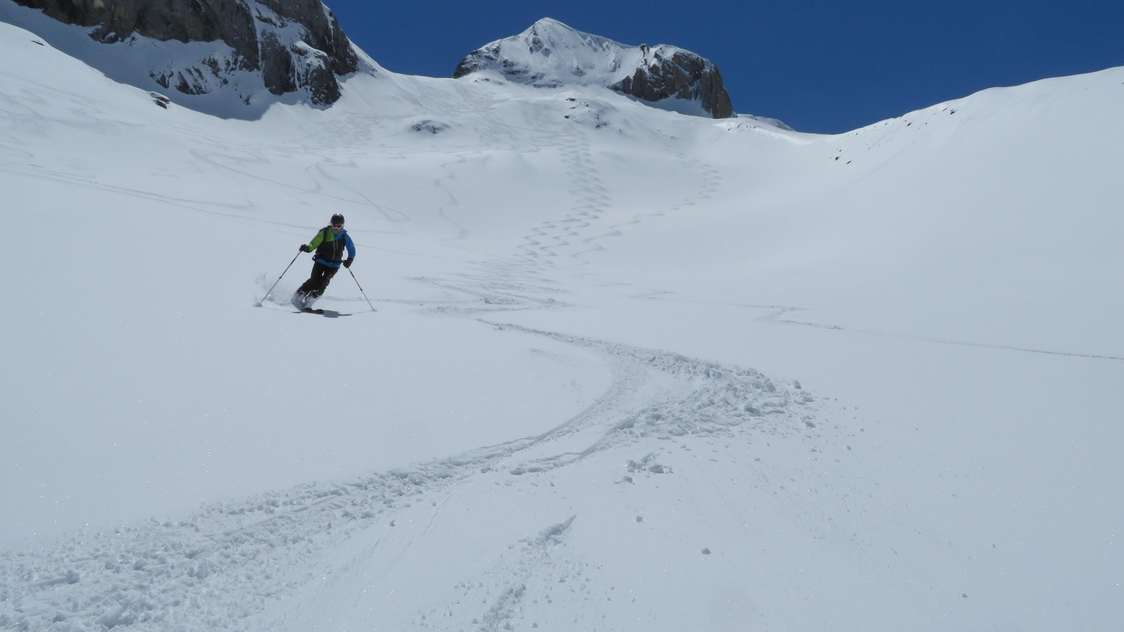 Bei Abfahrt oberhalb 2000m immer noch Super Pulver und darunter ganz klebriger Nassschnee bis Iffigenalp.