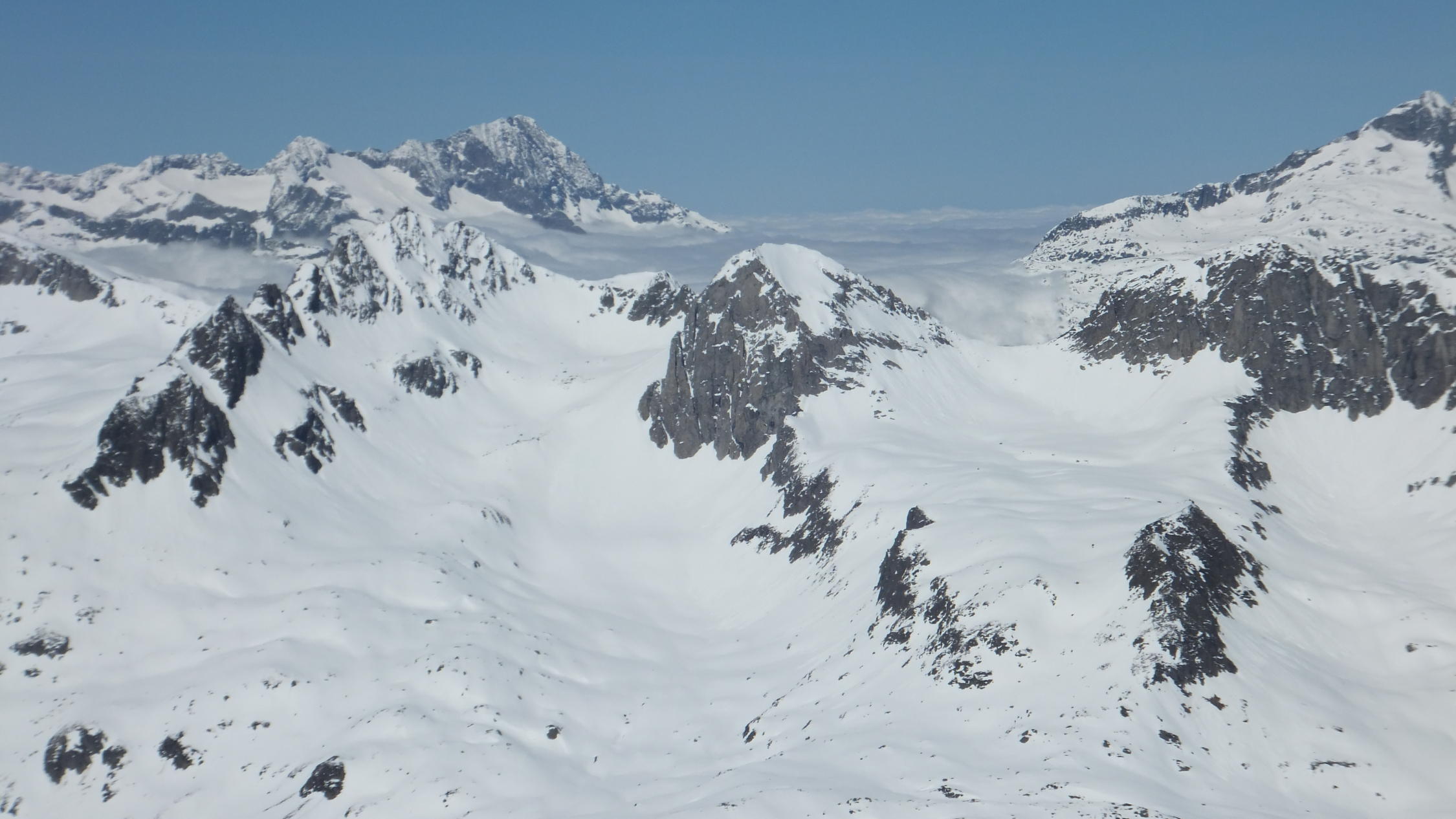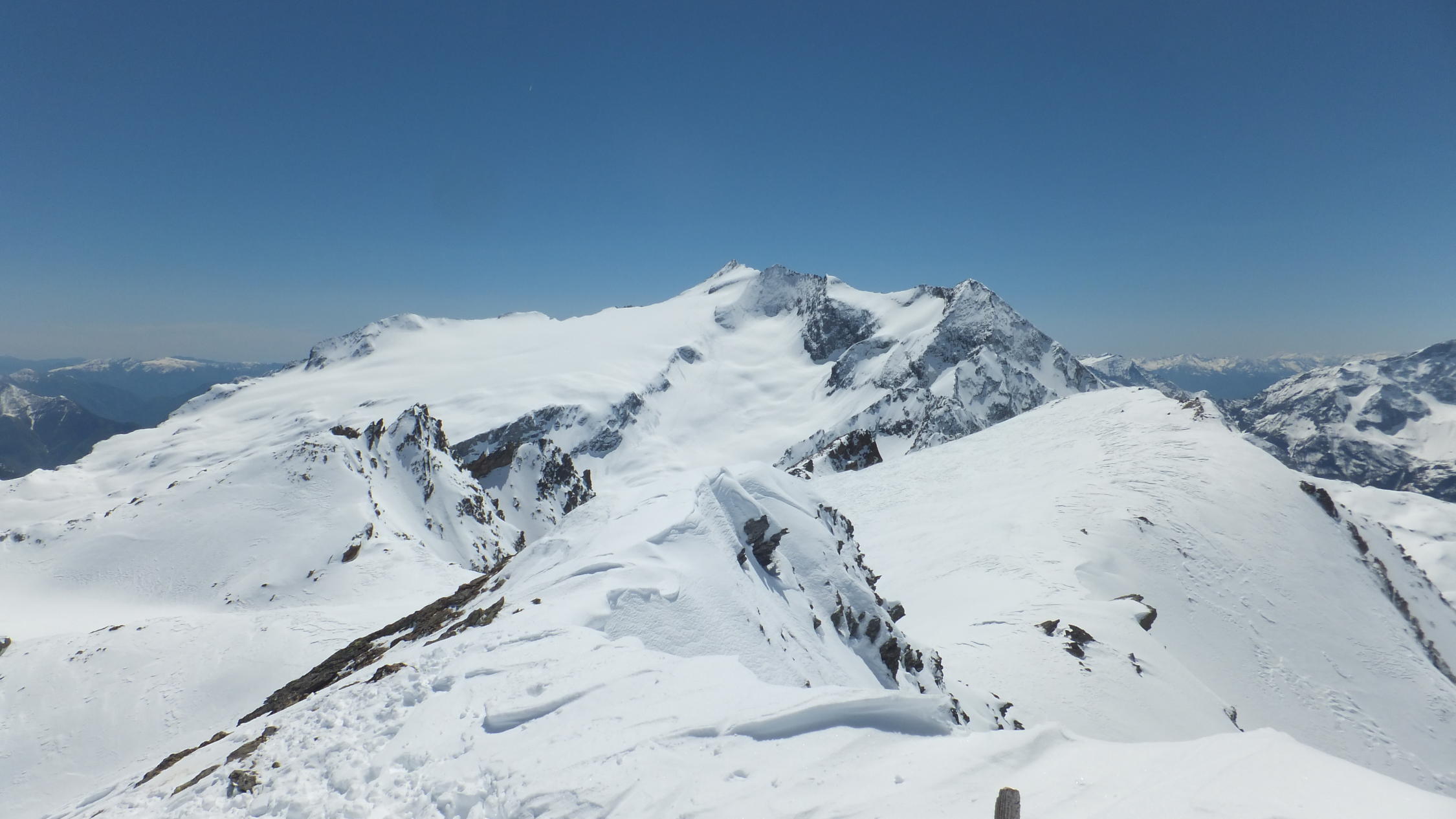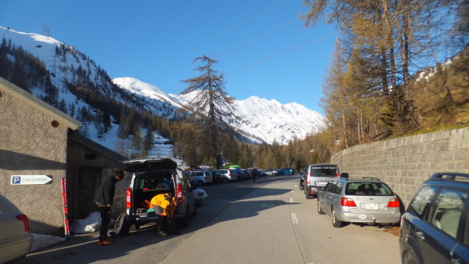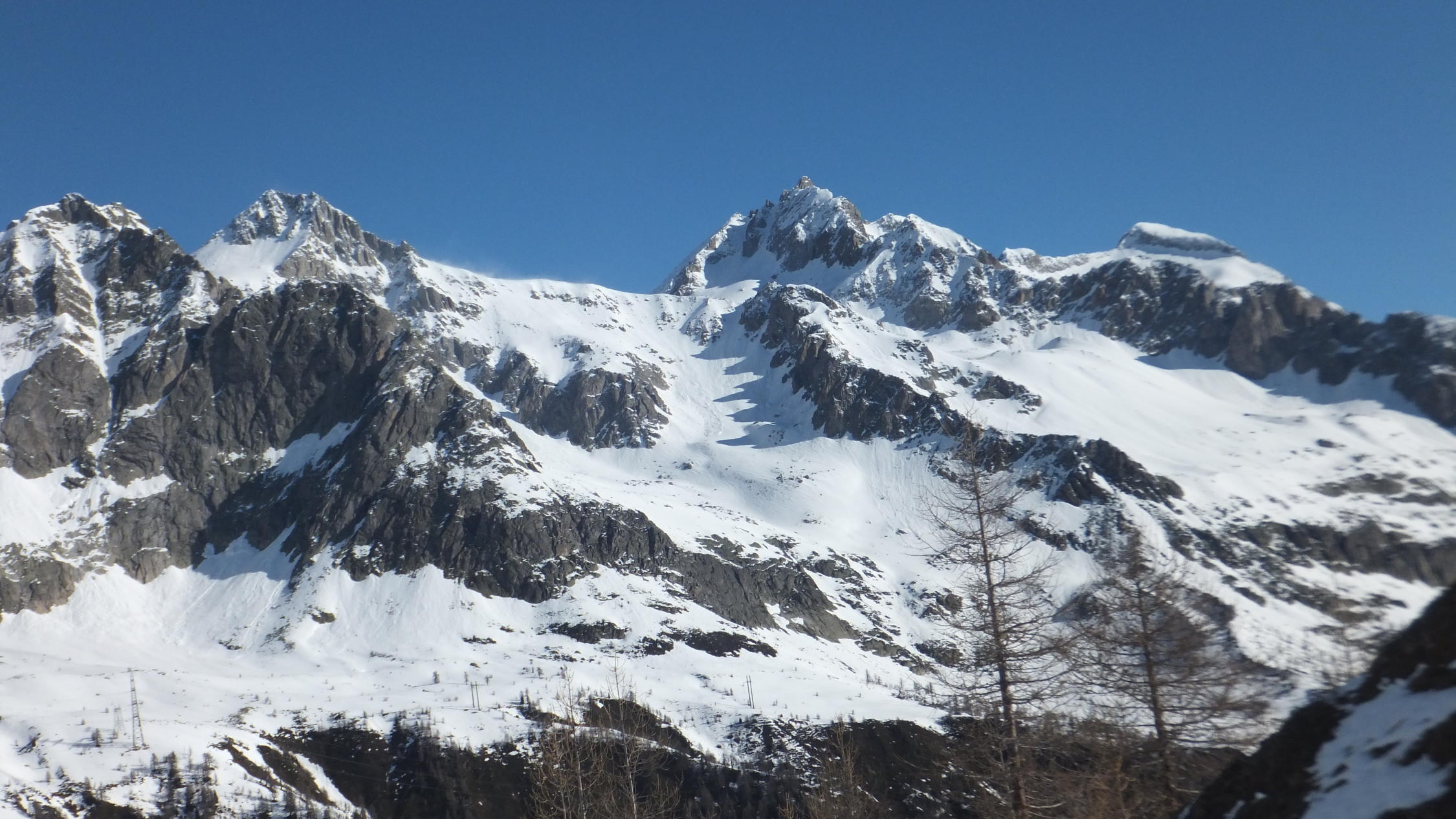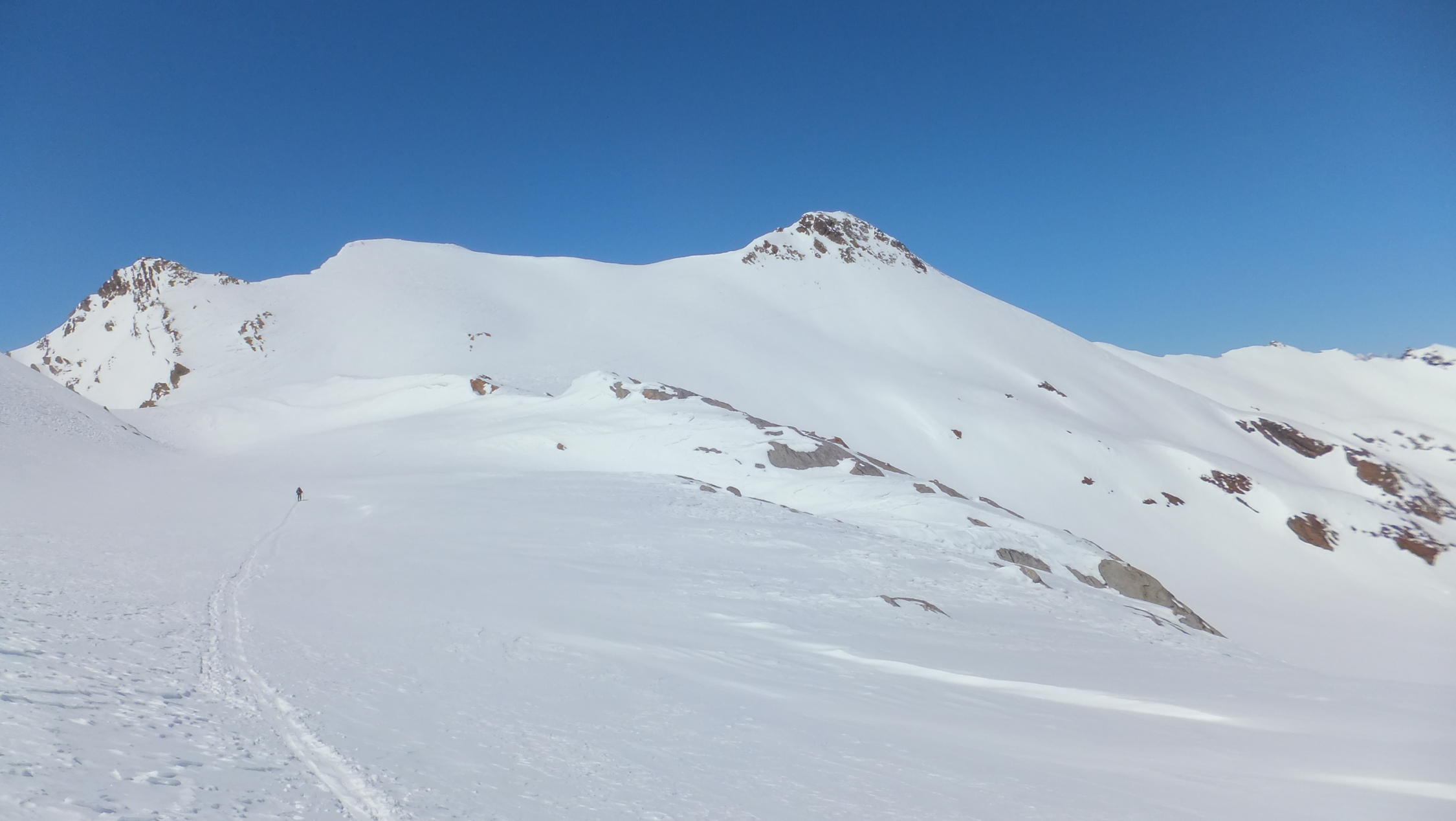 Sehr gute Verhältnisse mit kaltem Wind. Querung in der Ostflanke und Anstieg von Norden. Mit Ski fast bis zum Gipfel. Abfahrt durch Canalone del Marchhorn mit den unterschiedlichsten Schneearten.