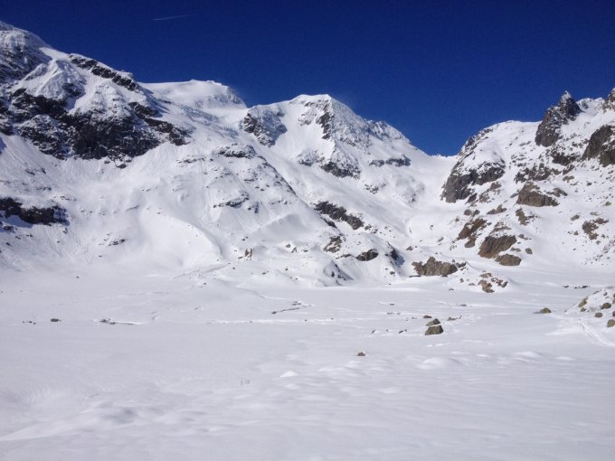 Ab cirka 2'400m hat es derzeit mehr Schnee als letztes Jahr im Mai. Darunter hat es weniger als letztes Jahr im Mai... Der Neuschnee, der letzte Woche gefallen war, hatte sich gestern noch ungenügend gesetzt. So waren aus meiner Sicht die n/o-Wände des Gwächtenhorns und der beiden Tierberge noch nicht sicher genug, um befahren zu werden.