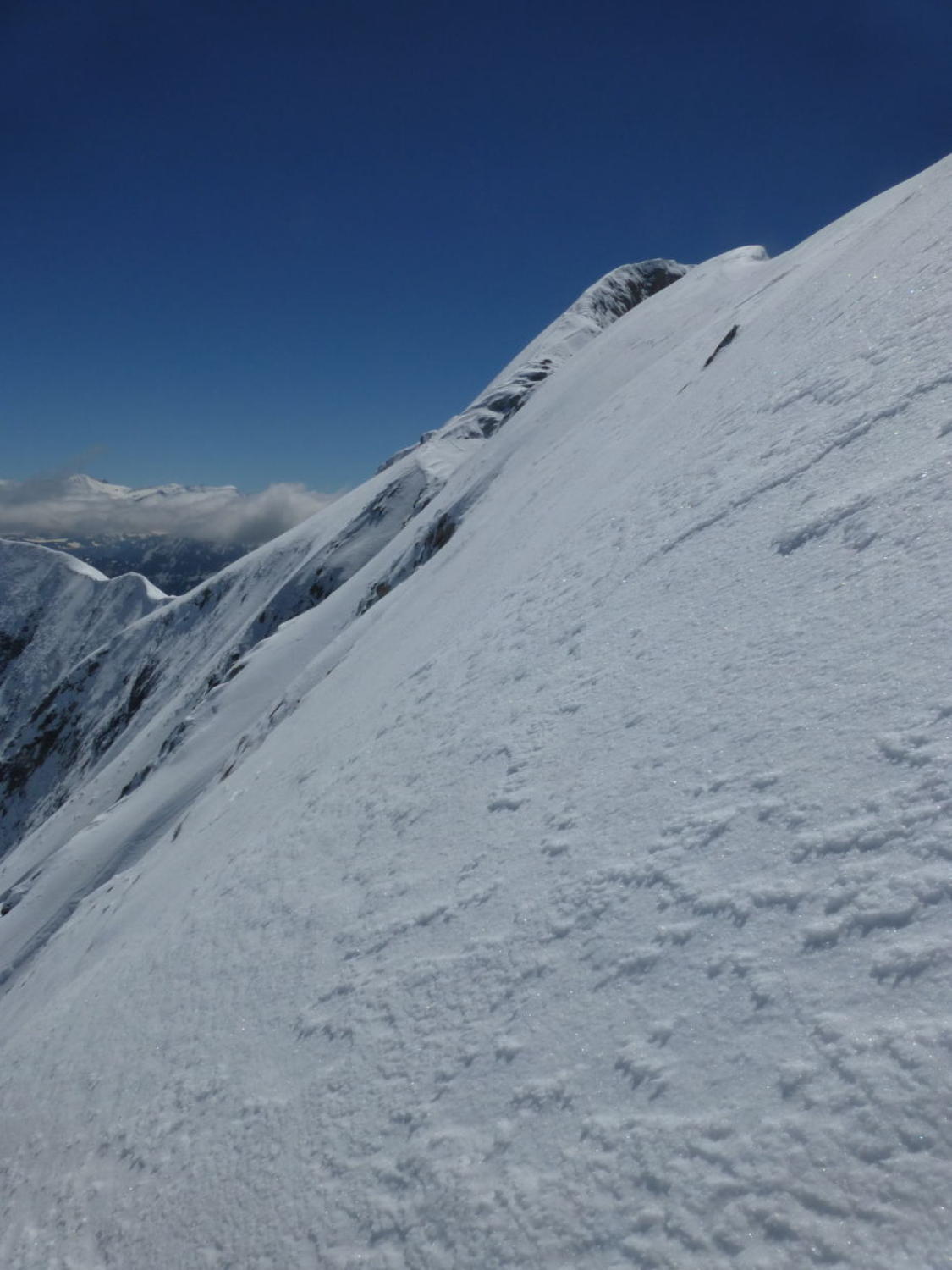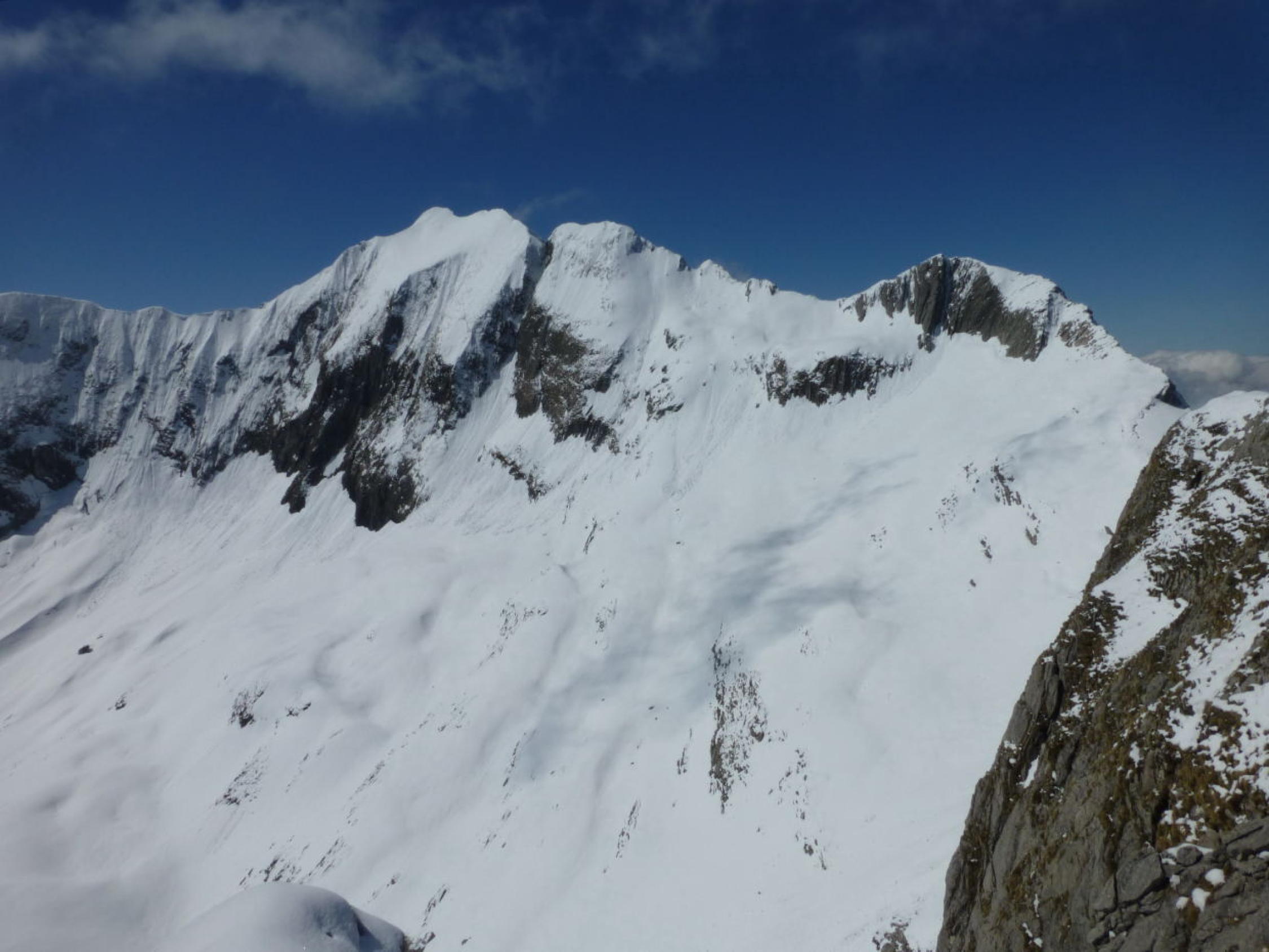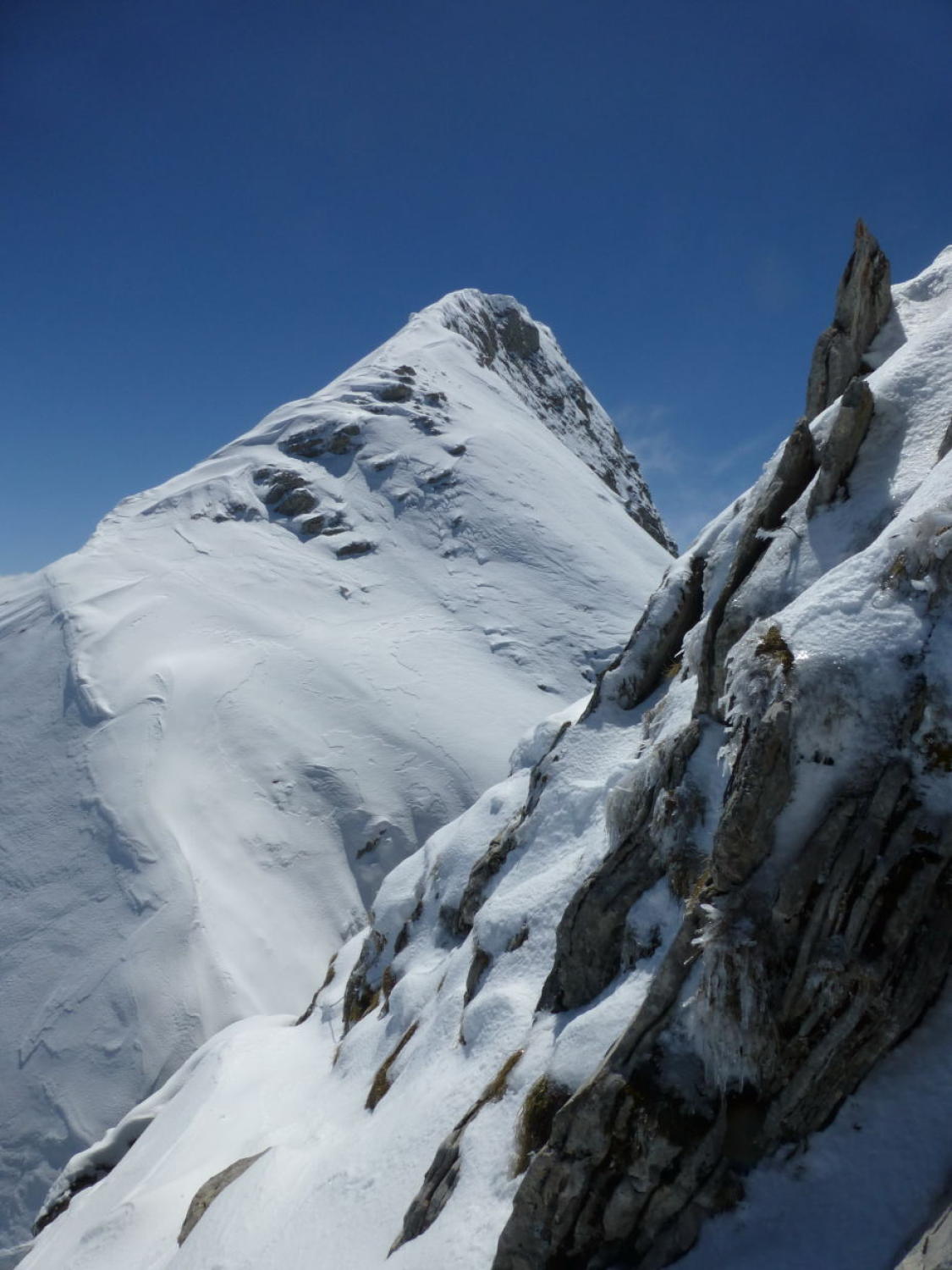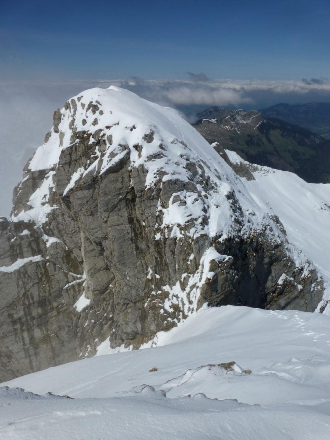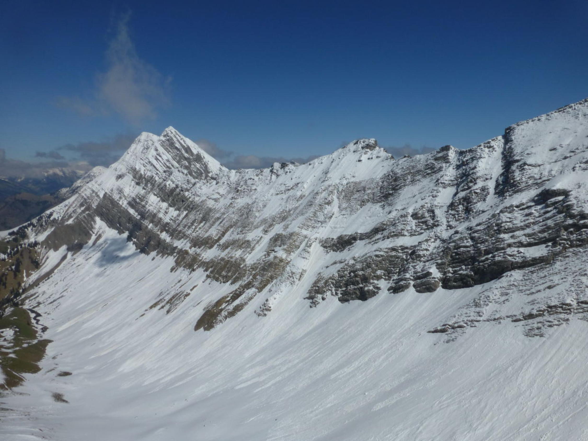 Morgen Restwolken, dann mit Bise sonnig und kühl. Ski unterhalb 1500m getragen. Schneedecke durchnässt, morgens tragend gefroren, gegen Mittag v.a. bei Fusspassagen einbrechend. In der NW-Flanke zur Selle des Morteys z.T. pickelharte Lawinenzüge. Am NE- und NNW-Grat bis 30cm feuchter Pulver, ENE- und NW-Flanke abwechselnd hart und griffig oder abrutschender angefeuchteter Pulver auf nass-harter Unterlage (zweifelhafter Grip, bin deshalb zwischen Vorgipfel und Pas de la Borrière kontrolliert abgerutscht).