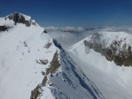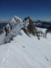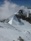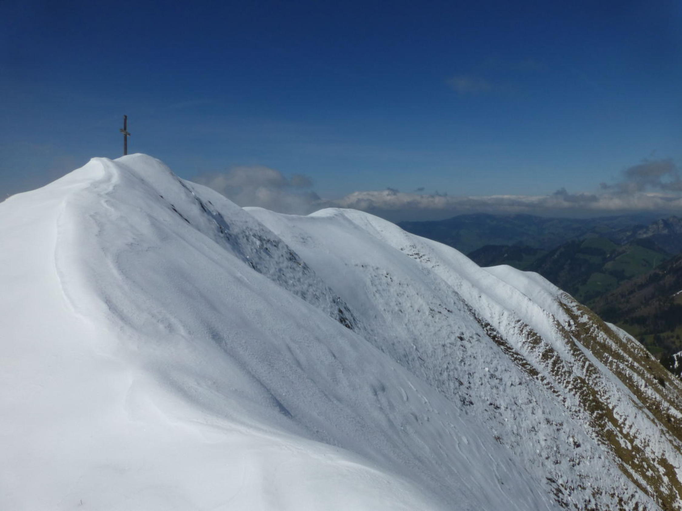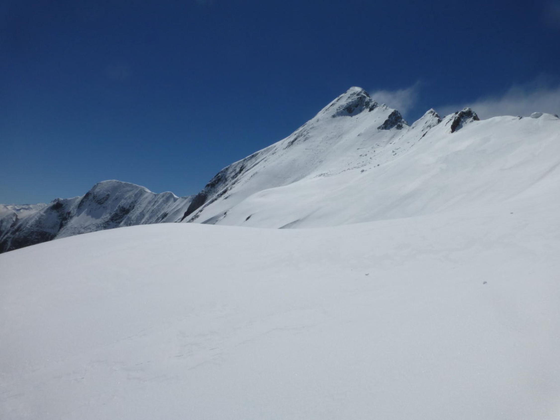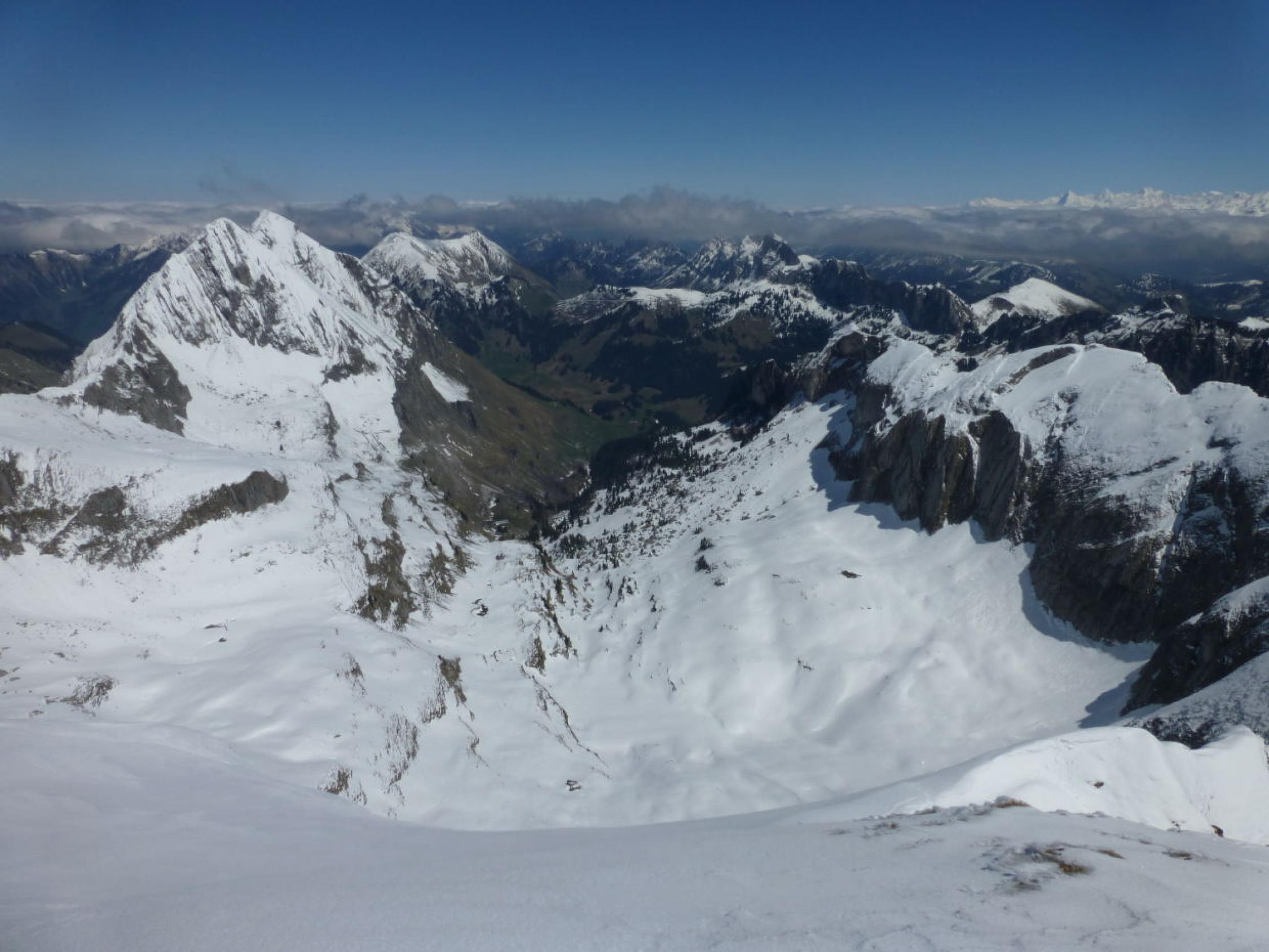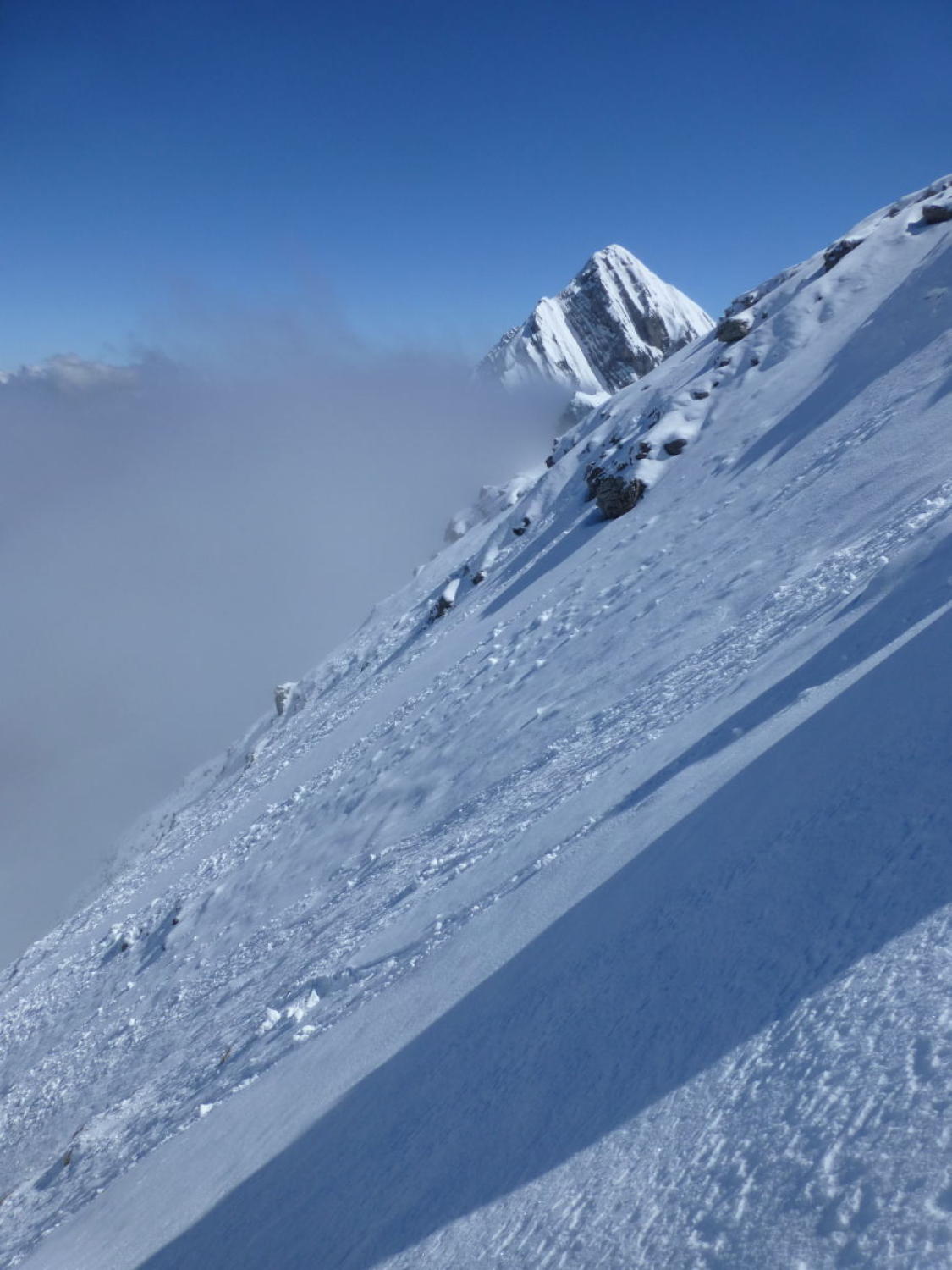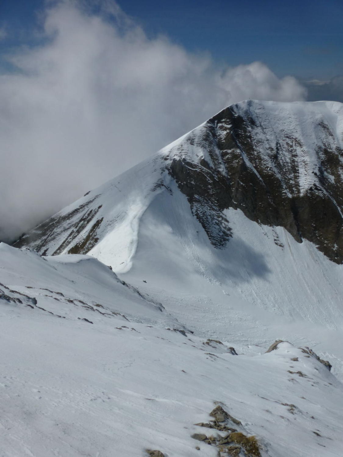 Morgen Restwolken, dann mit Bise sonnig und kühl. Ski unterhalb 1500m getragen. Schneedecke durchnässt, morgens tragend gefroren, gegen Mittag v.a. bei Fusspassagen einbrechend. In der NW-Flanke zur Selle des Morteys z.T. pickelharte Lawinenzüge. Am NE- und NNW-Grat bis 30cm feuchter Pulver, ENE- und NW-Flanke abwechselnd hart und griffig oder abrutschender angefeuchteter Pulver auf nass-harter Unterlage (zweifelhafter Grip, bin deshalb zwischen Vorgipfel und Pas de la Borrière kontrolliert abgerutscht).