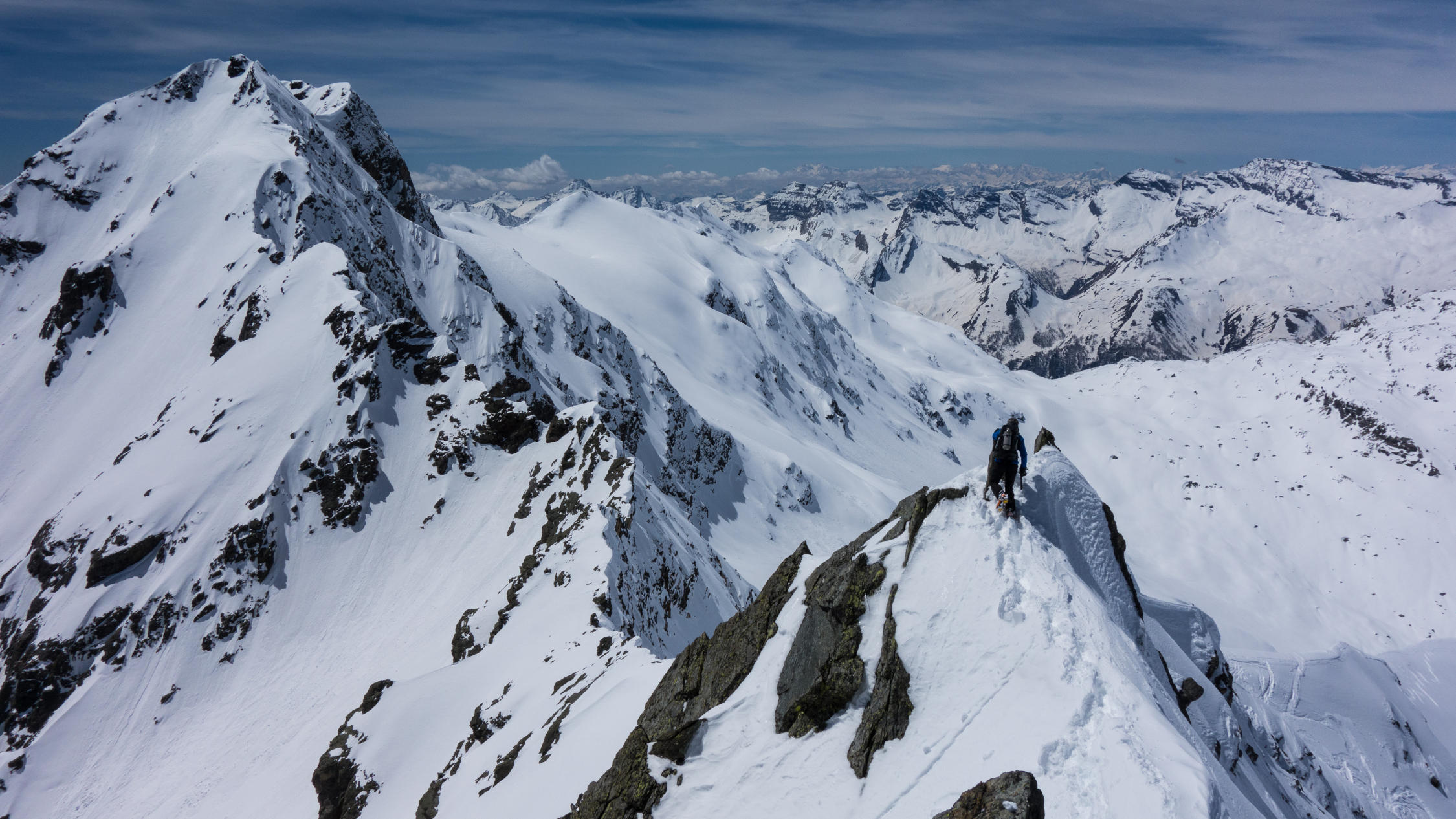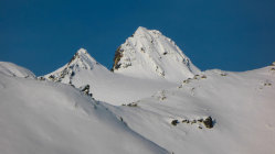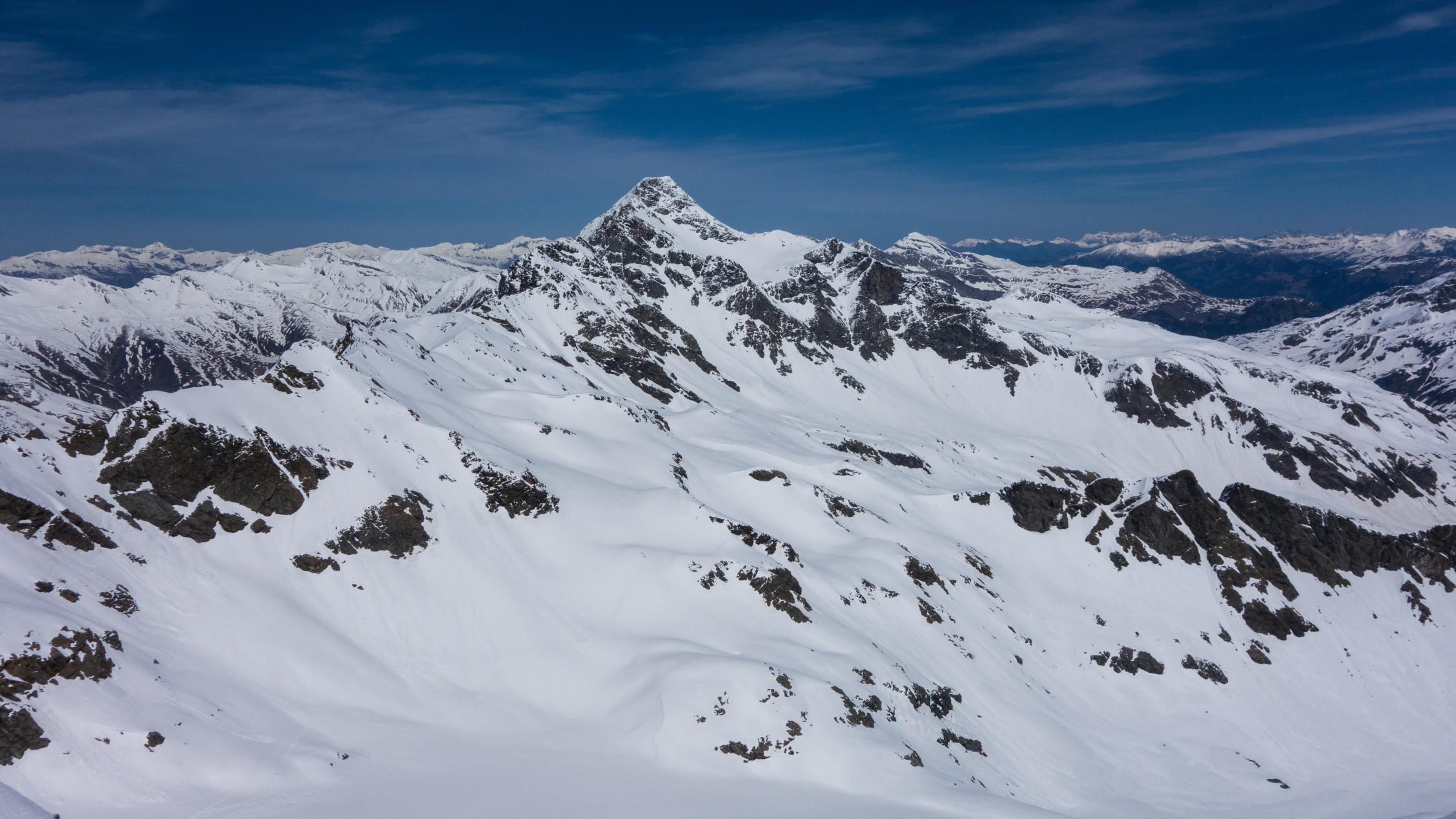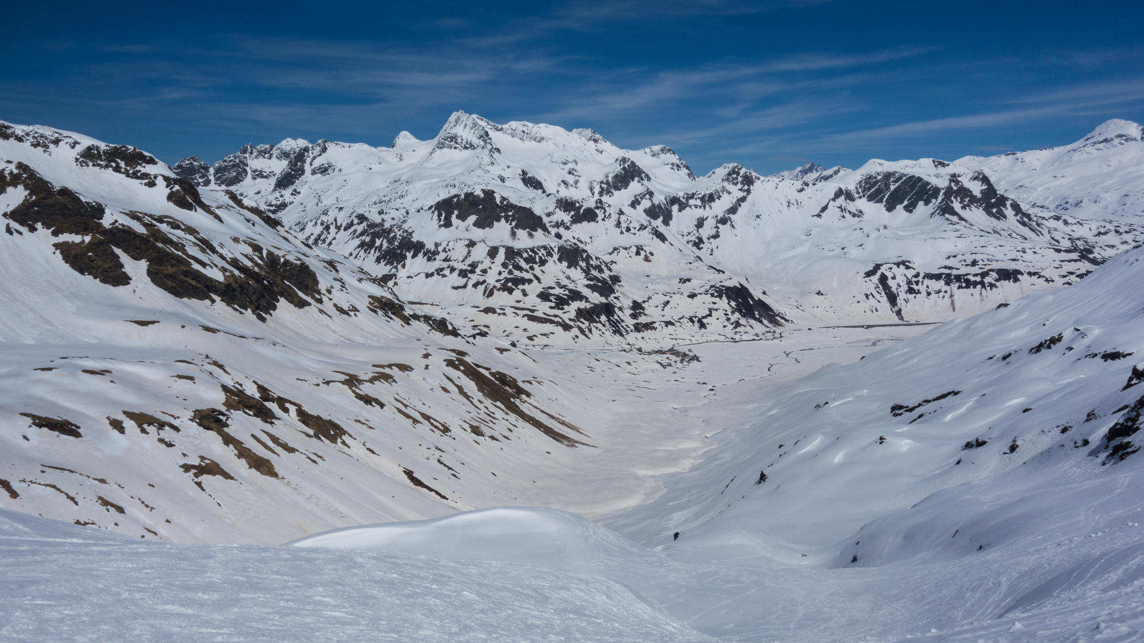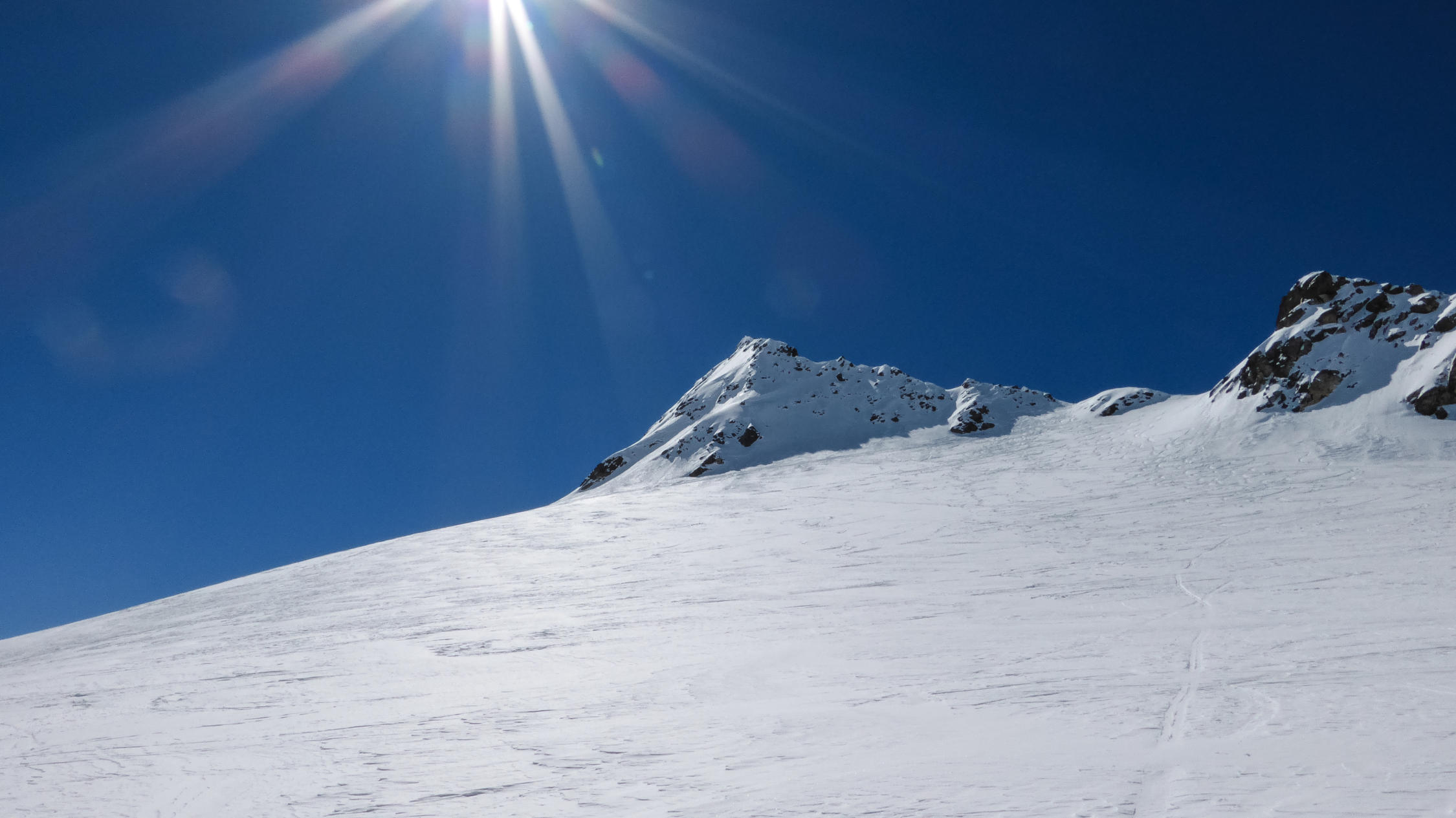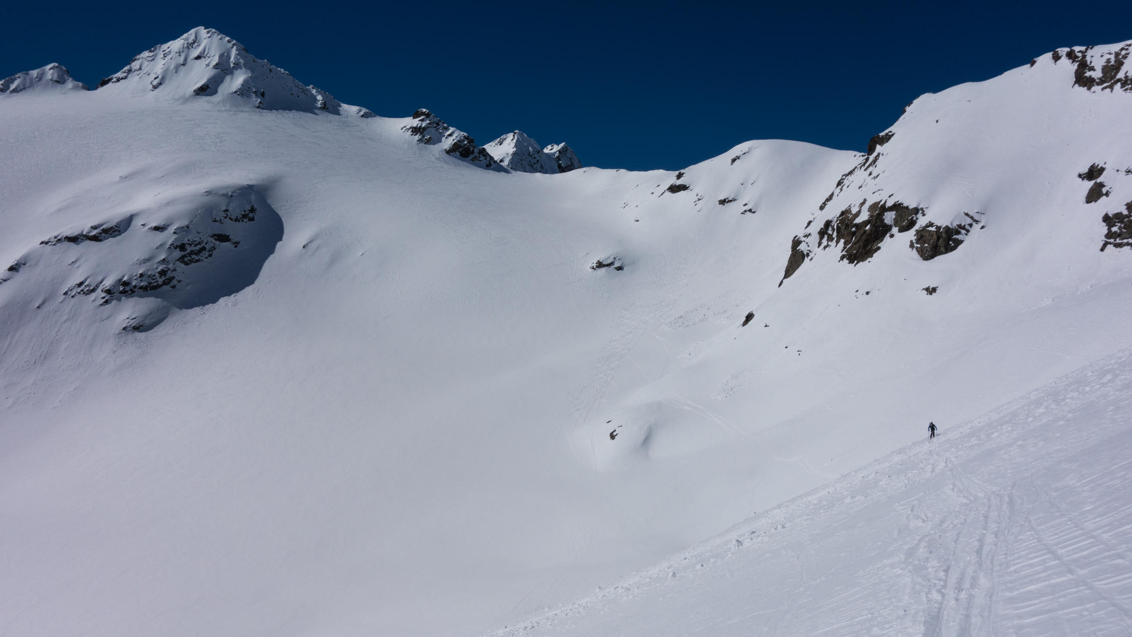 Perfekte Verhältnisse, Start um 7.30 Uhr, gefrorene Schneedecke. Aufstieg ab Skidepot über den sehr exponierten Gipfelgrat mit Steigeisen und Pickel, guter Trittschnee. Abfahrt ca. 14 Uhr, auf dem Gletscher windgepresster Pulverschnee, dann anfellen und kurzer Gegenaufstieg zum Bivacco Cecchini. Von hier auf steilen Hängen bei gutem Sulzschnee zurück nach Monte Spluga.