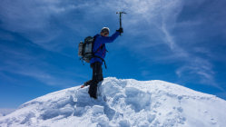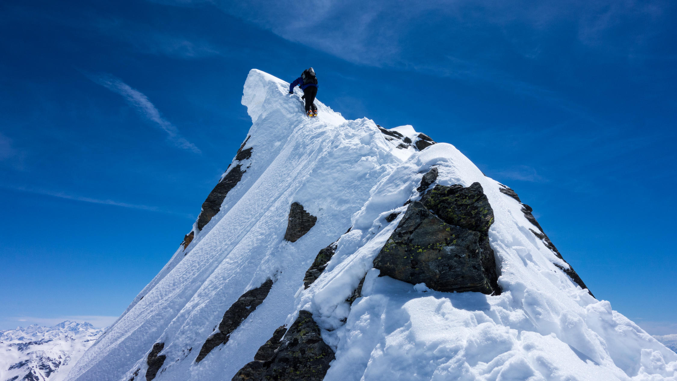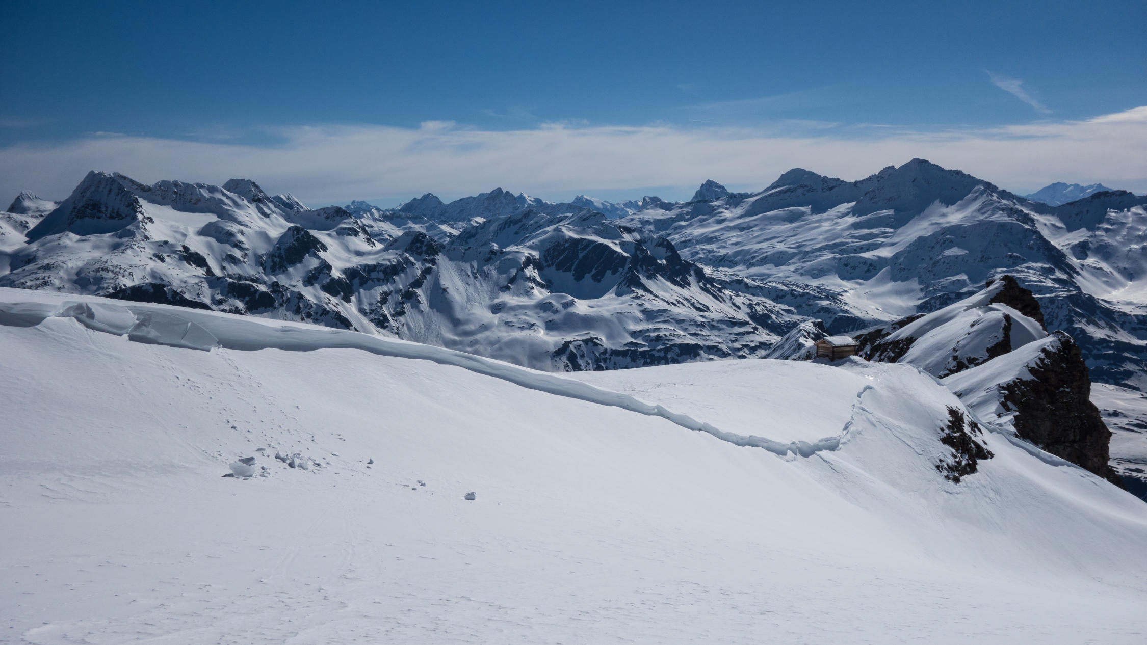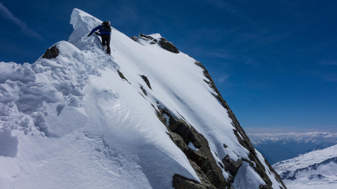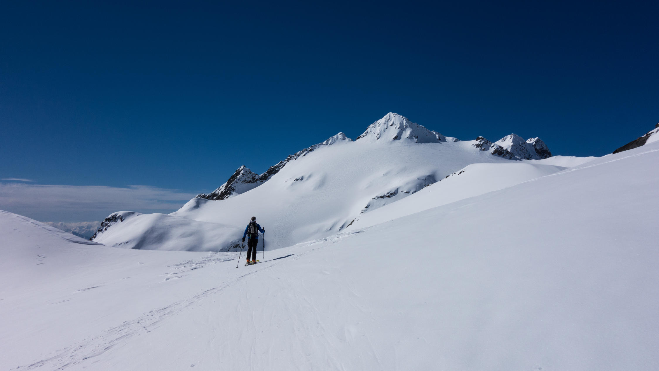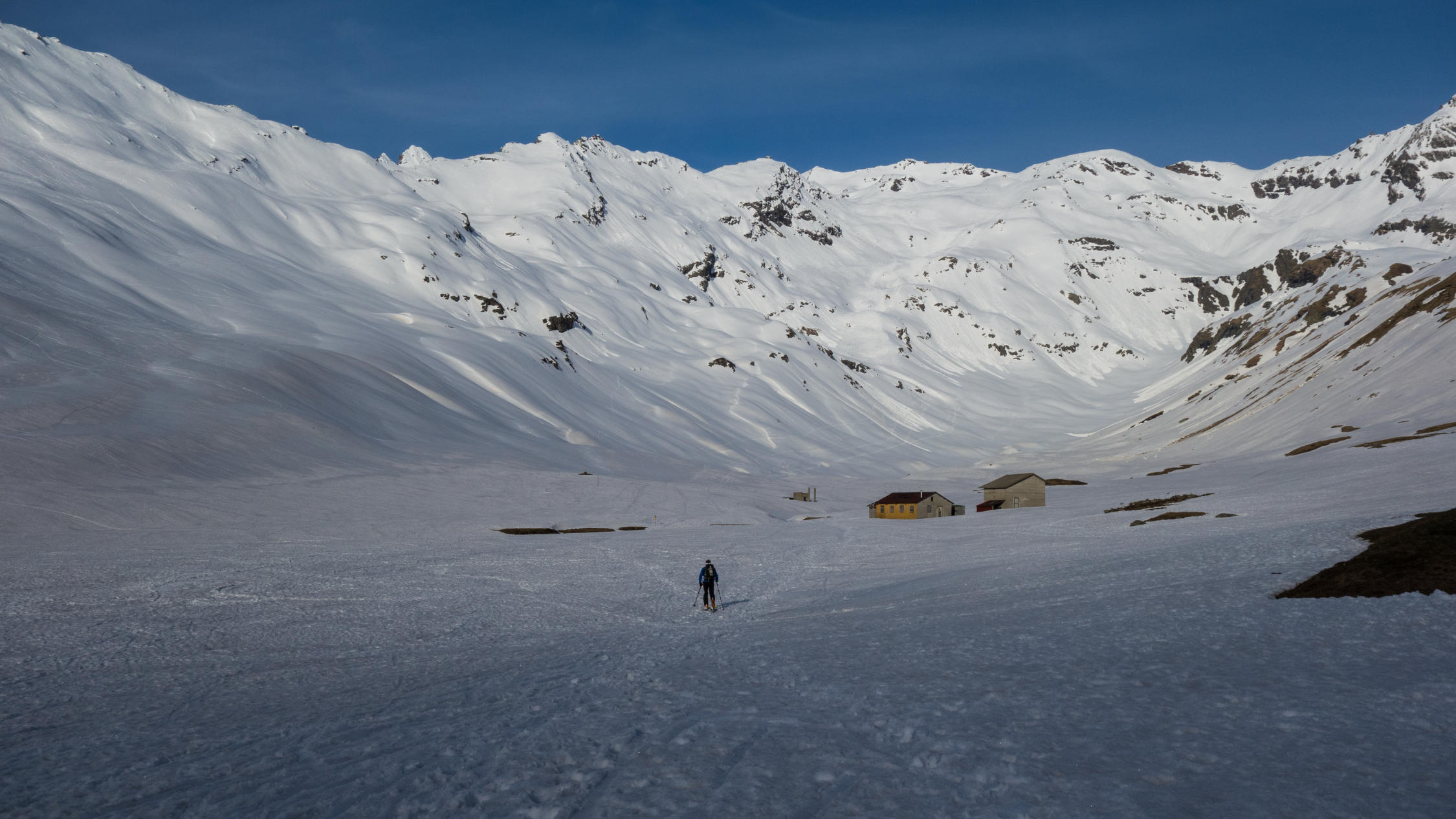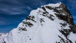 Perfekte Verhältnisse, Start um 7.30 Uhr, gefrorene Schneedecke. Aufstieg ab Skidepot über den sehr exponierten Gipfelgrat mit Steigeisen und Pickel, guter Trittschnee. Abfahrt ca. 14 Uhr, auf dem Gletscher windgepresster Pulverschnee, dann anfellen und kurzer Gegenaufstieg zum Bivacco Cecchini. Von hier auf steilen Hängen bei gutem Sulzschnee zurück nach Monte Spluga.