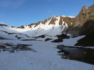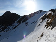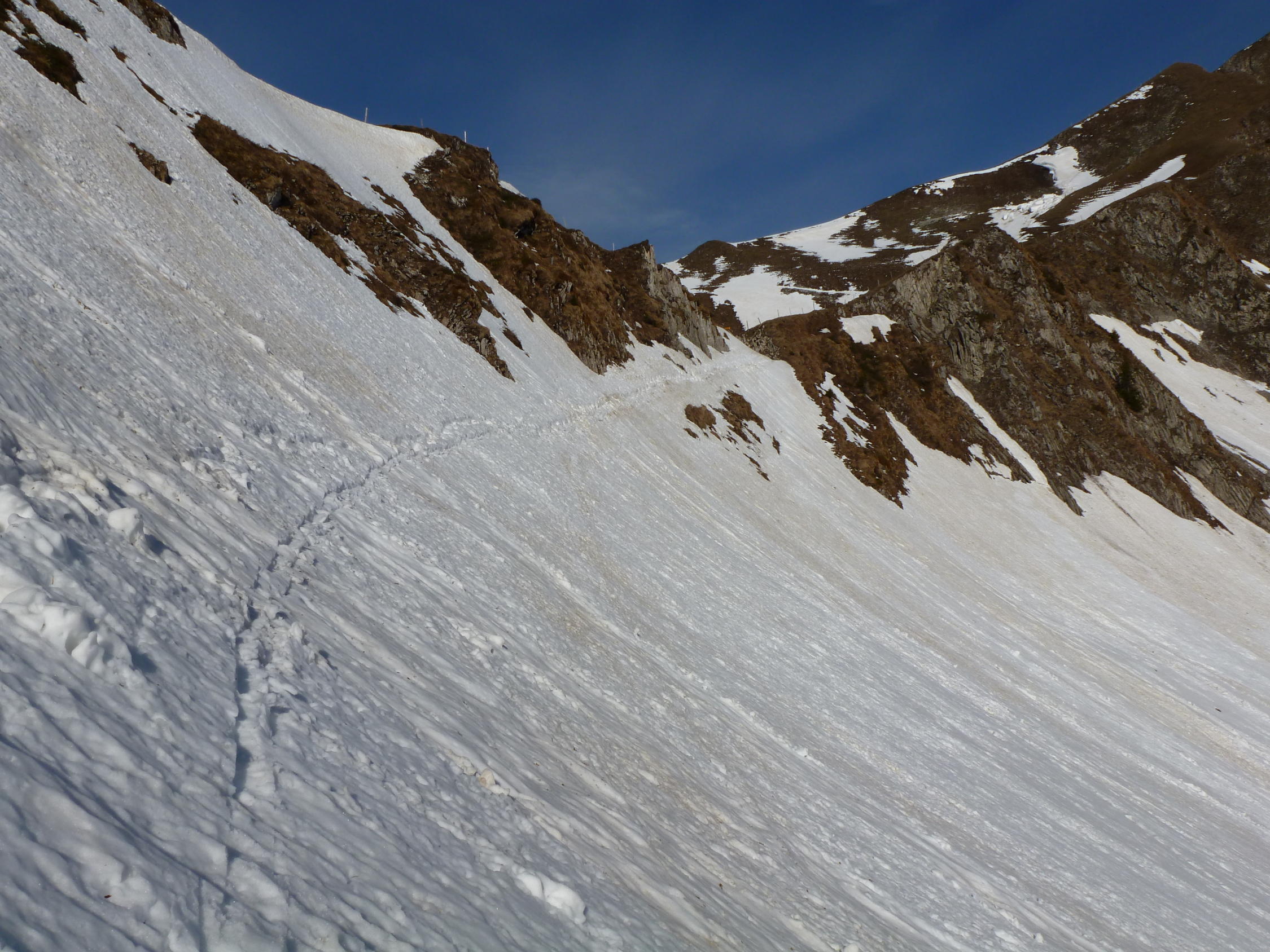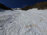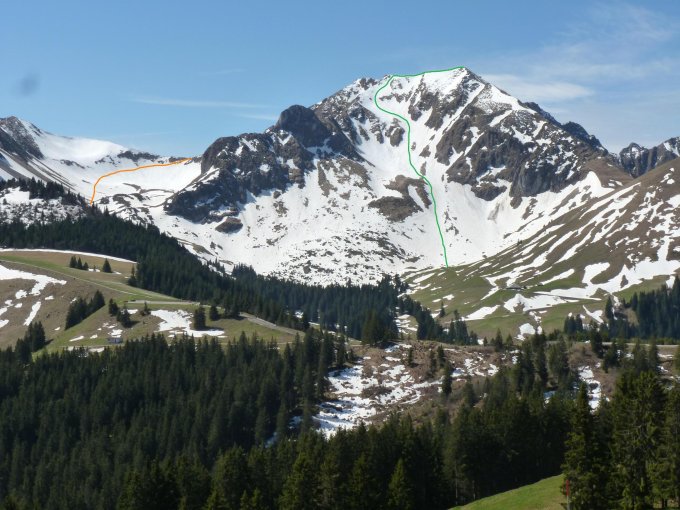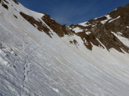 Abfahrt Nordflanke: erstes Drittel, nasser, tiefer schlecht zu fahrender Schnee. Zweites Drittel, nicht so schlecht. Letztes Drittel, sehr gut zu fahrender Frühlingsschnee.