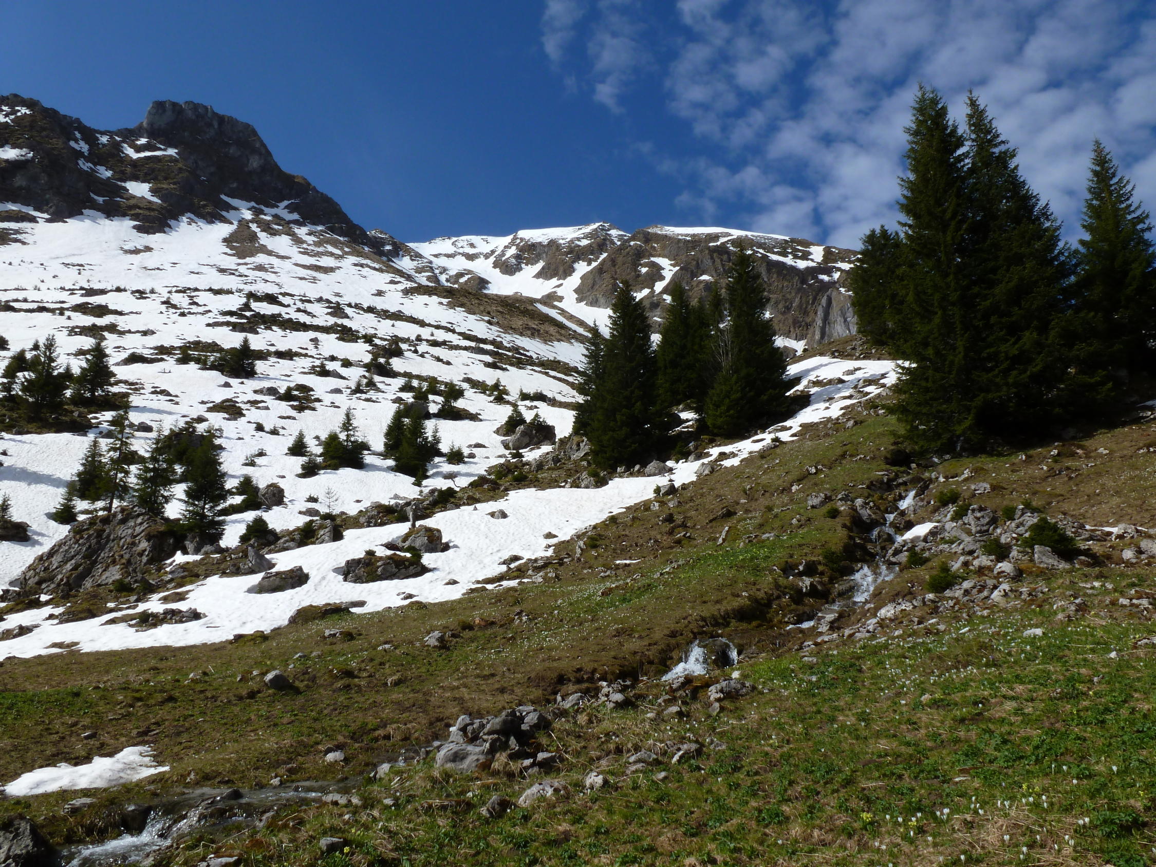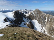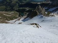 Ja das Ende der Skitourensaison in den Voralpen ist nahe. Zudem war die Abstrahlung in der Nacht nicht überwältigend. Habe die Skis bis kurz vor der Chummlihütte getragen. Danach gute Verhältnisse bis Morgetenpass (Spur ist gut angelegt). Erneut Tragstrecke bis zum Südostrücken. Wieder mit Skis zur Gemsflue 2139m. Schöne,kurze aber normalerweise dankbare Abfahrt zum Südhang der Bürglen(Heute sehr nasser, tiefer Schnee. Schlecht zu Fahren). Südhang an der Bürglen, typisch für diese Jahreszeit, praktisch Schneefrei.