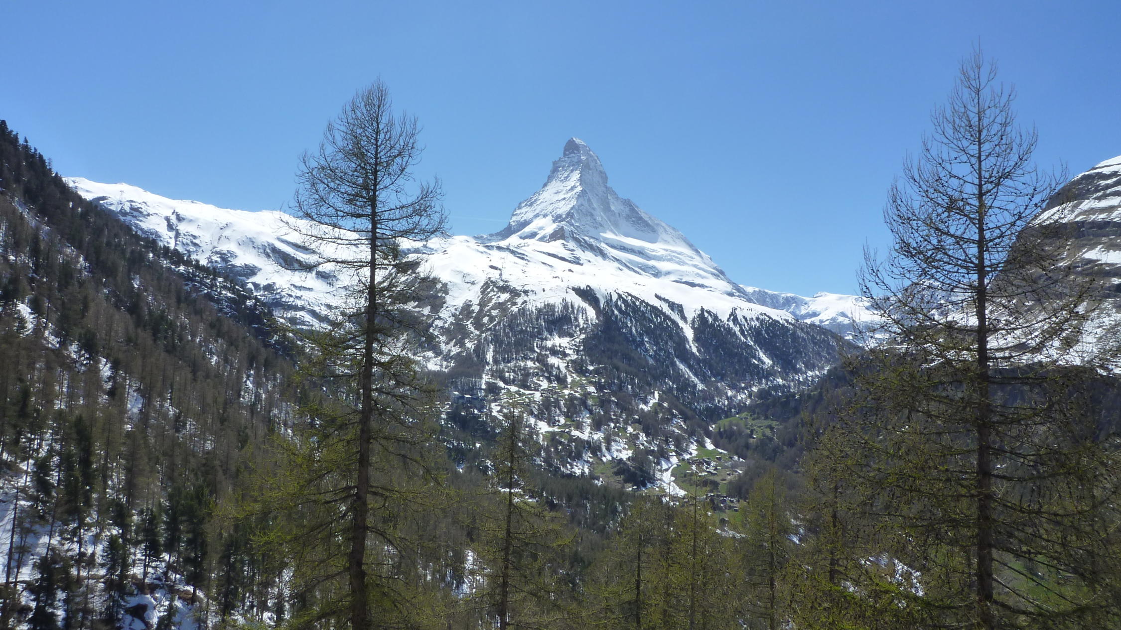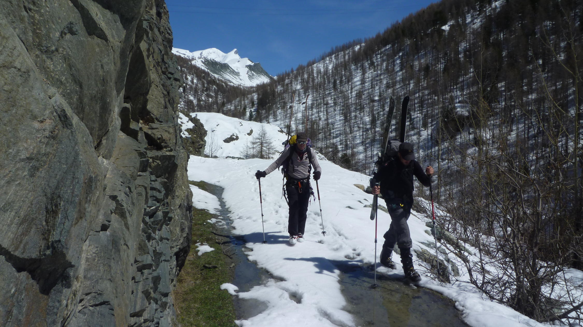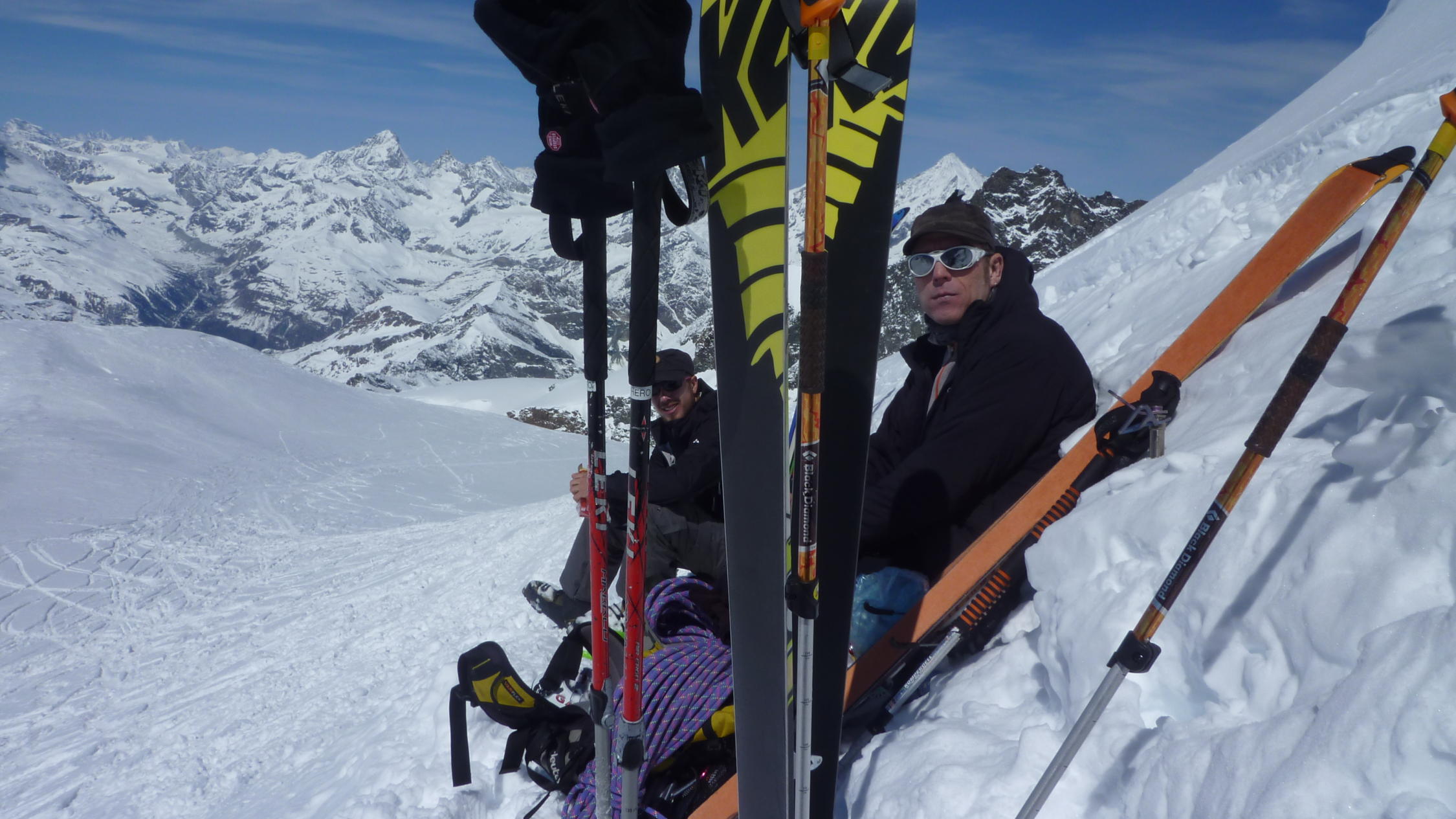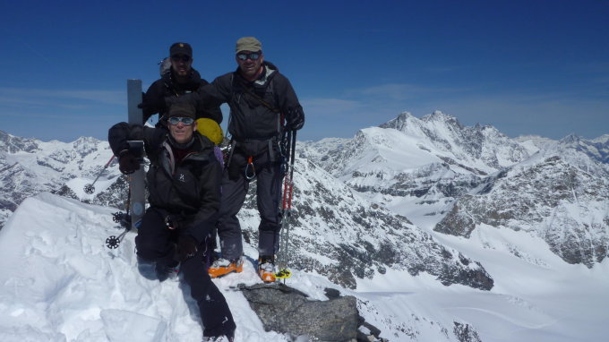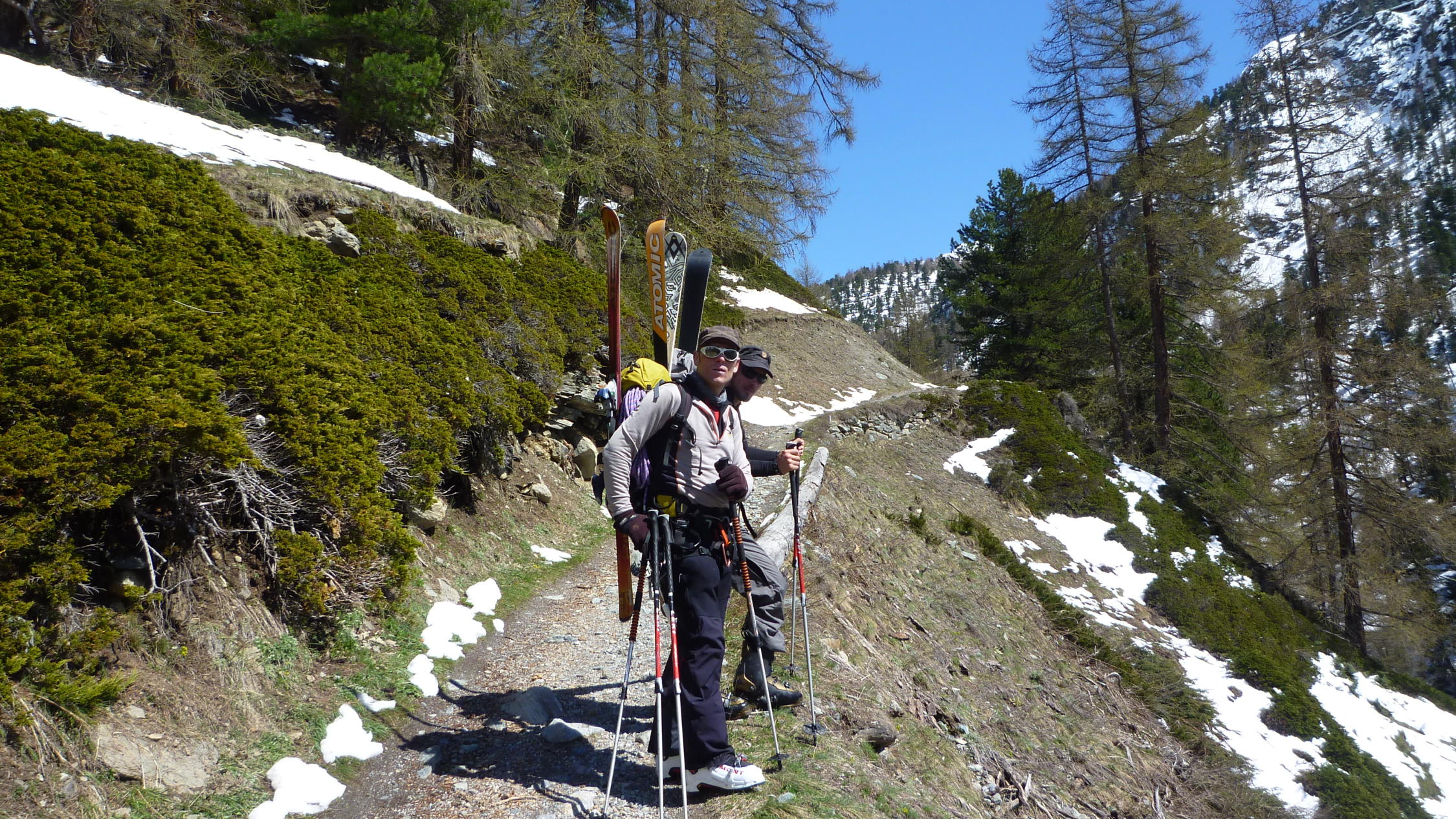 Abfahrt vom Adlerpass nach Zermatt. Schnee bis zum Moosjisee 2140 m, danach zu Fuss den Rest hinab.