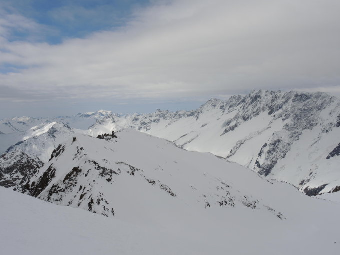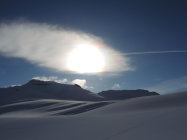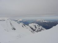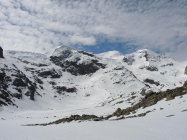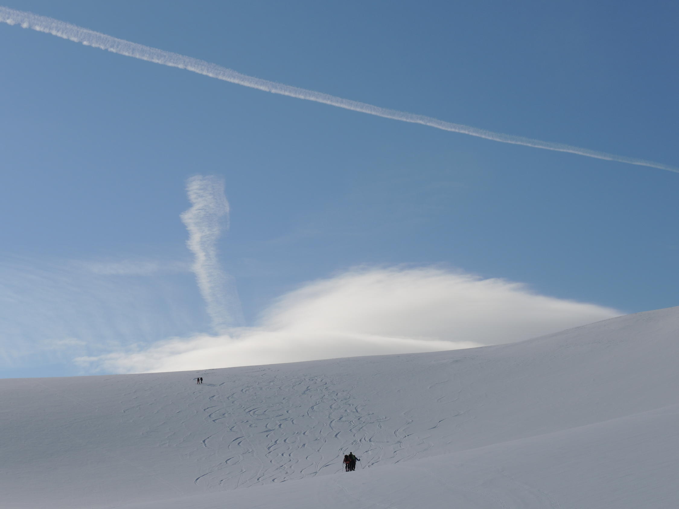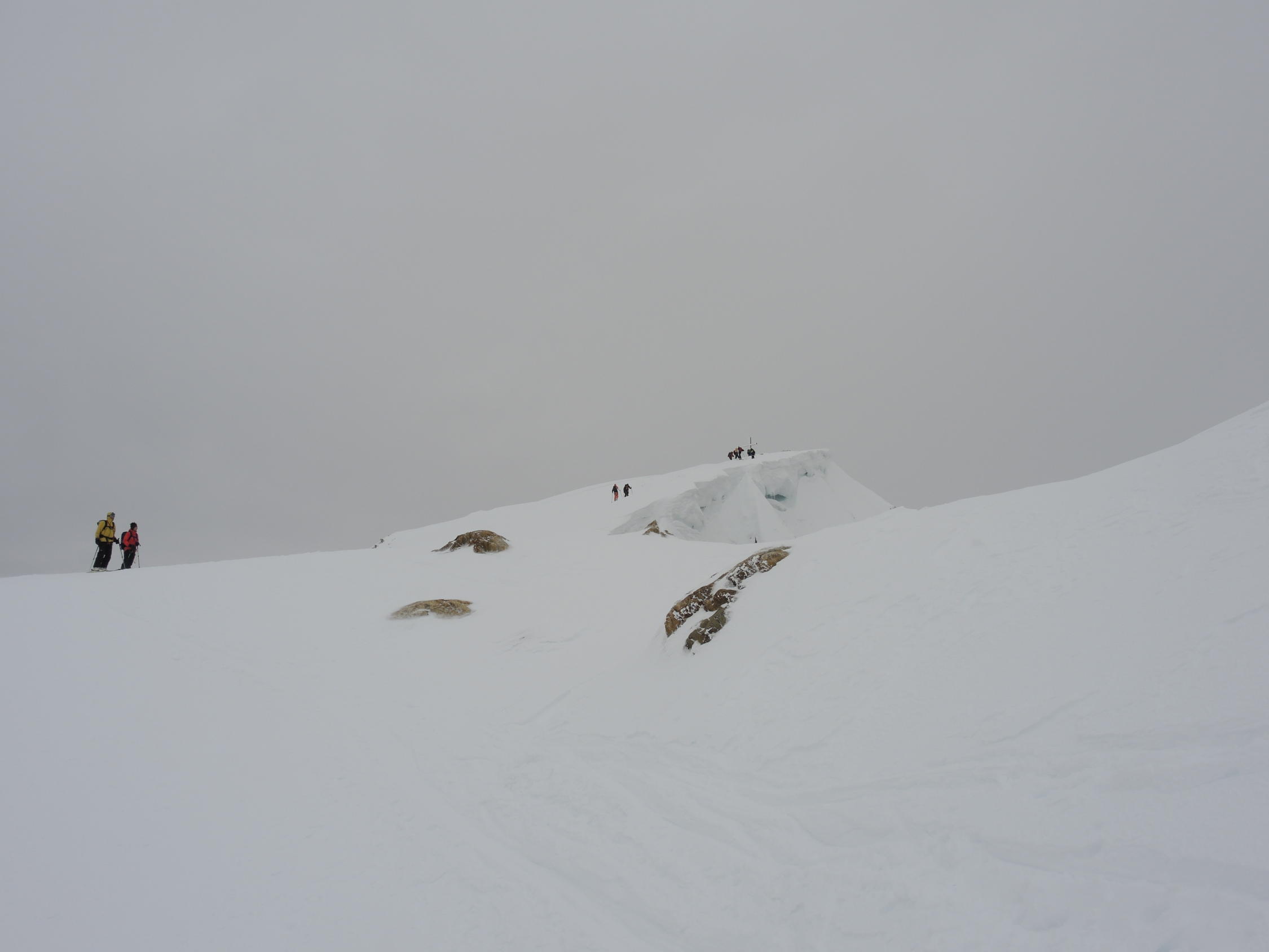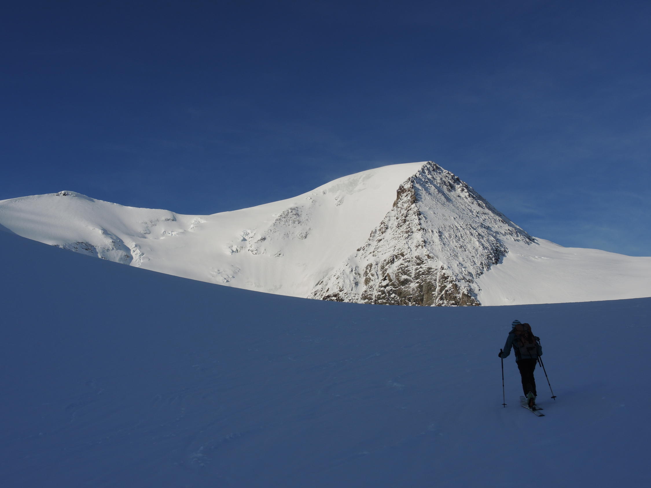 ab 2300 m gefroren mit feiner Graupelauflage, super Abfahrtsverhältnisse, im unteren Teil eher sumpfig schon um 11 Uhr. Am Gipfel starker Wind. Gletscher wirkt von Jahr zu Jahr harmloser. Zur Zeit sind kaum Spalten sichtbar.