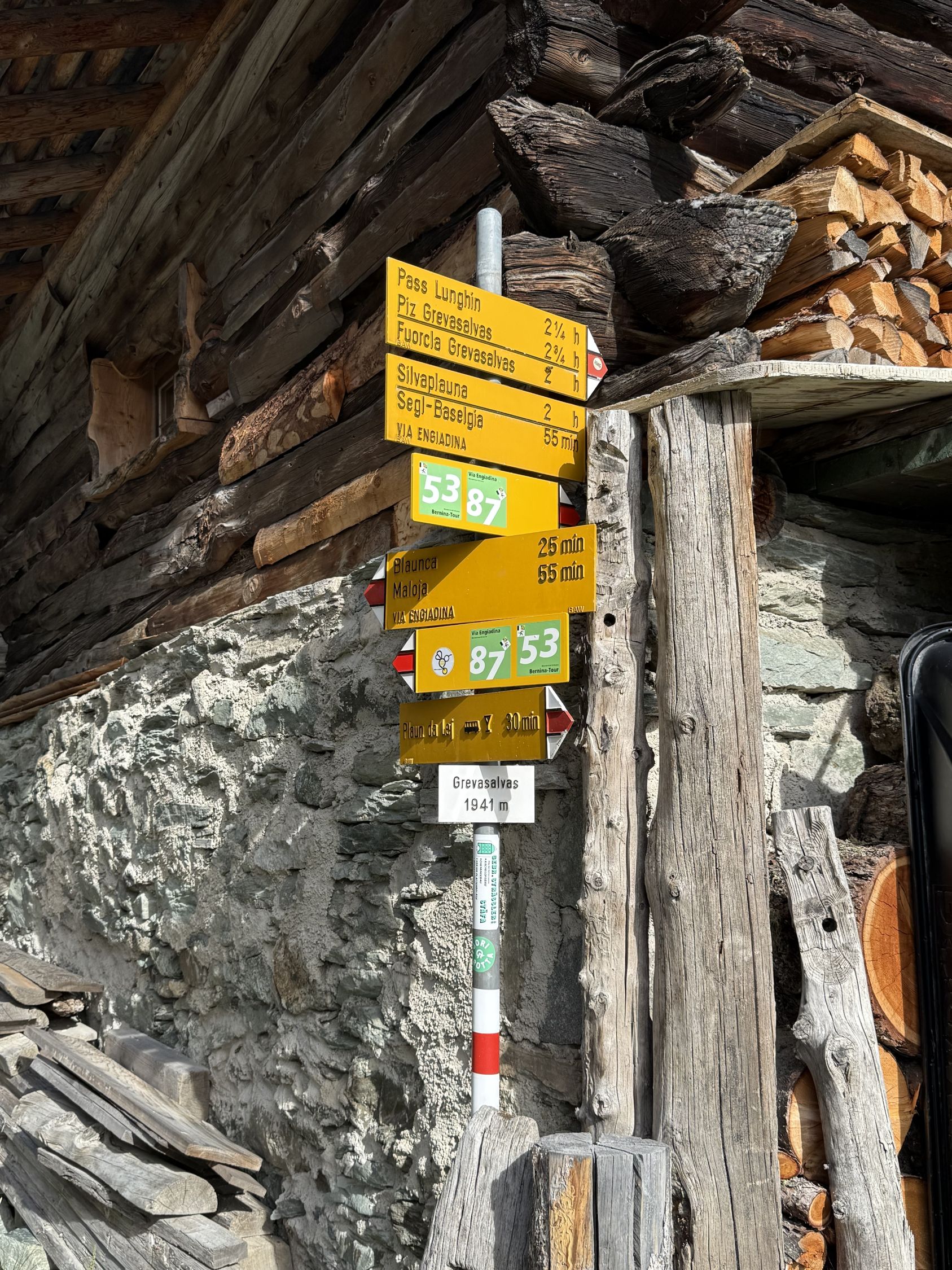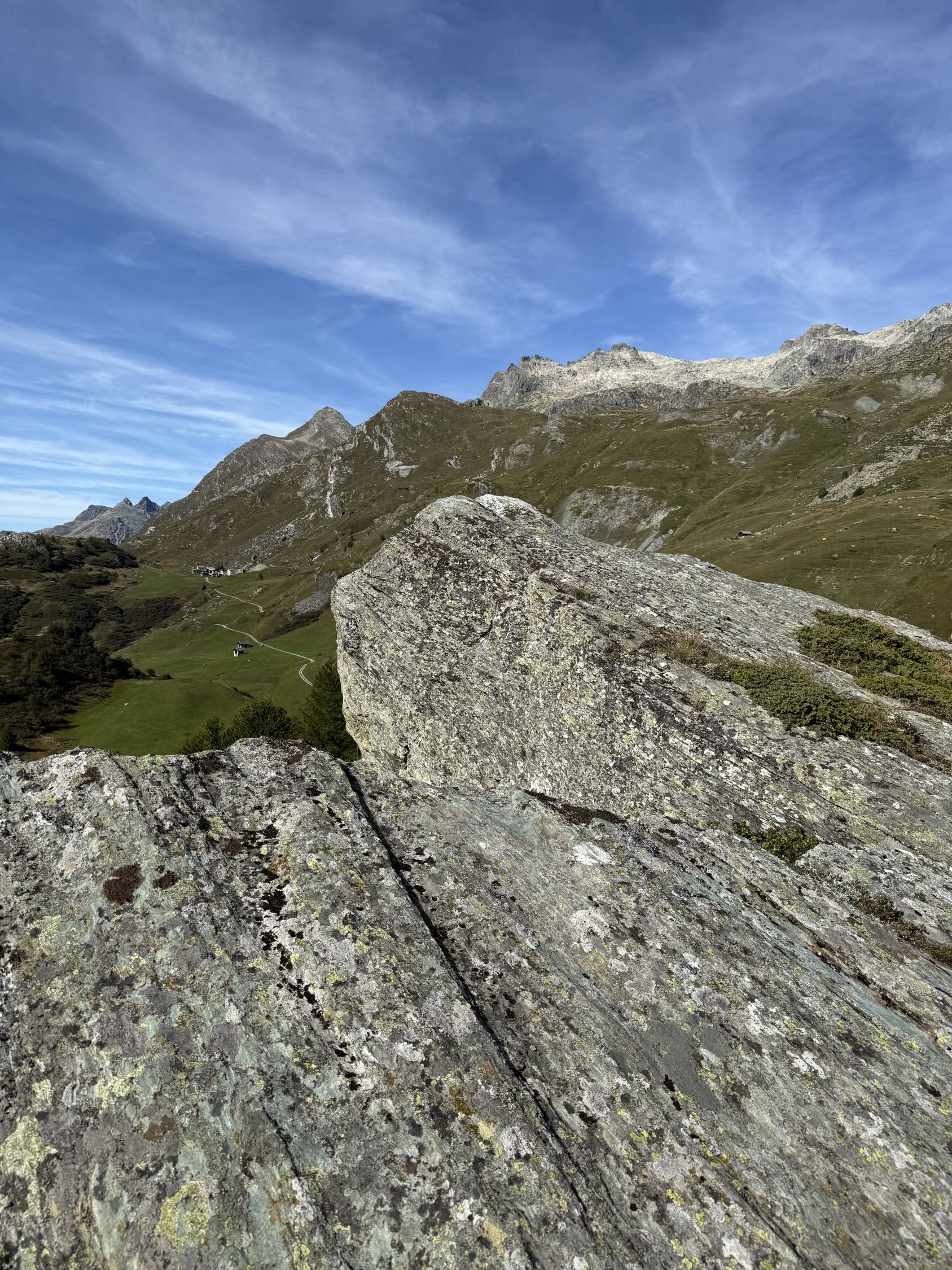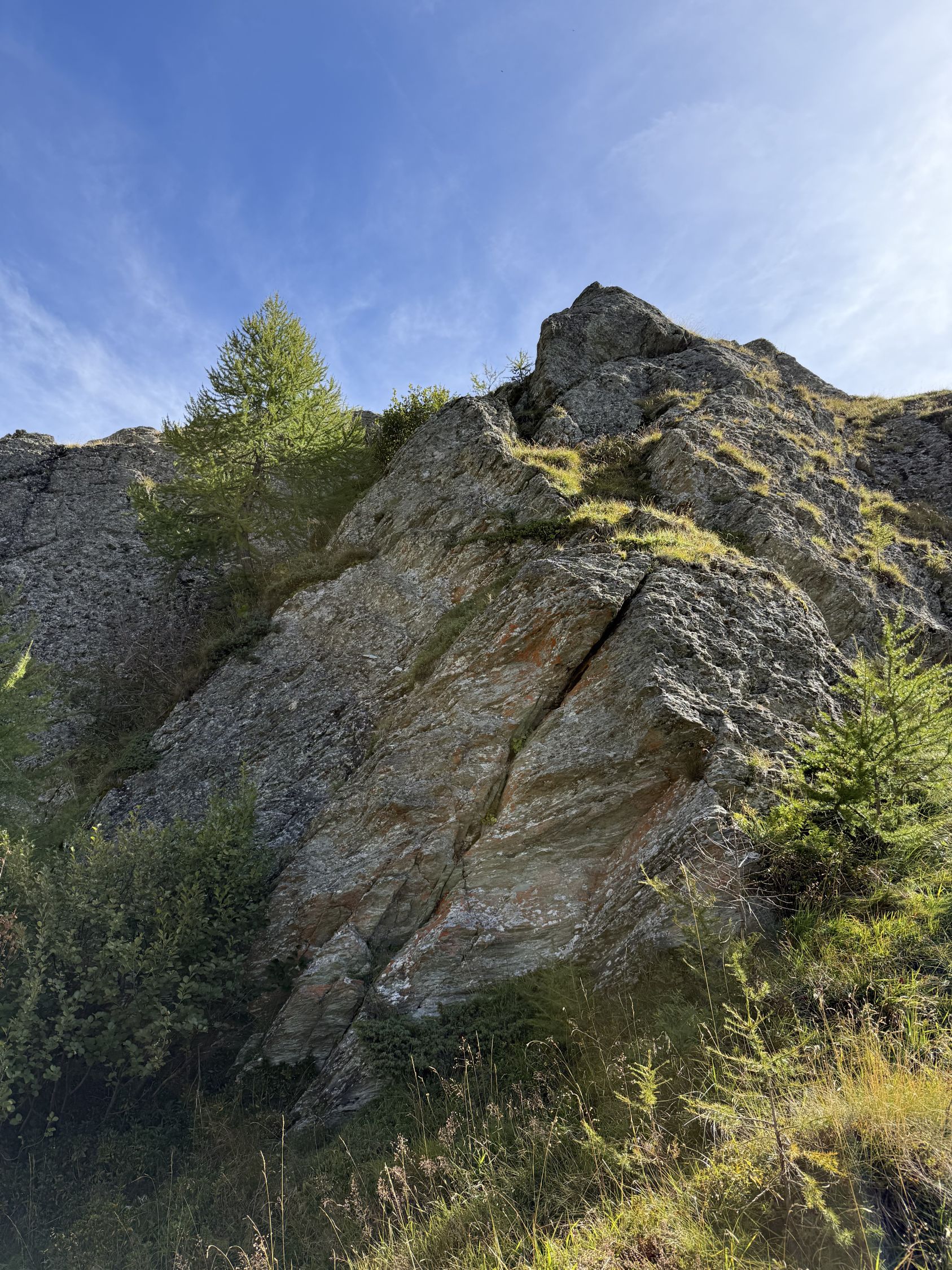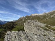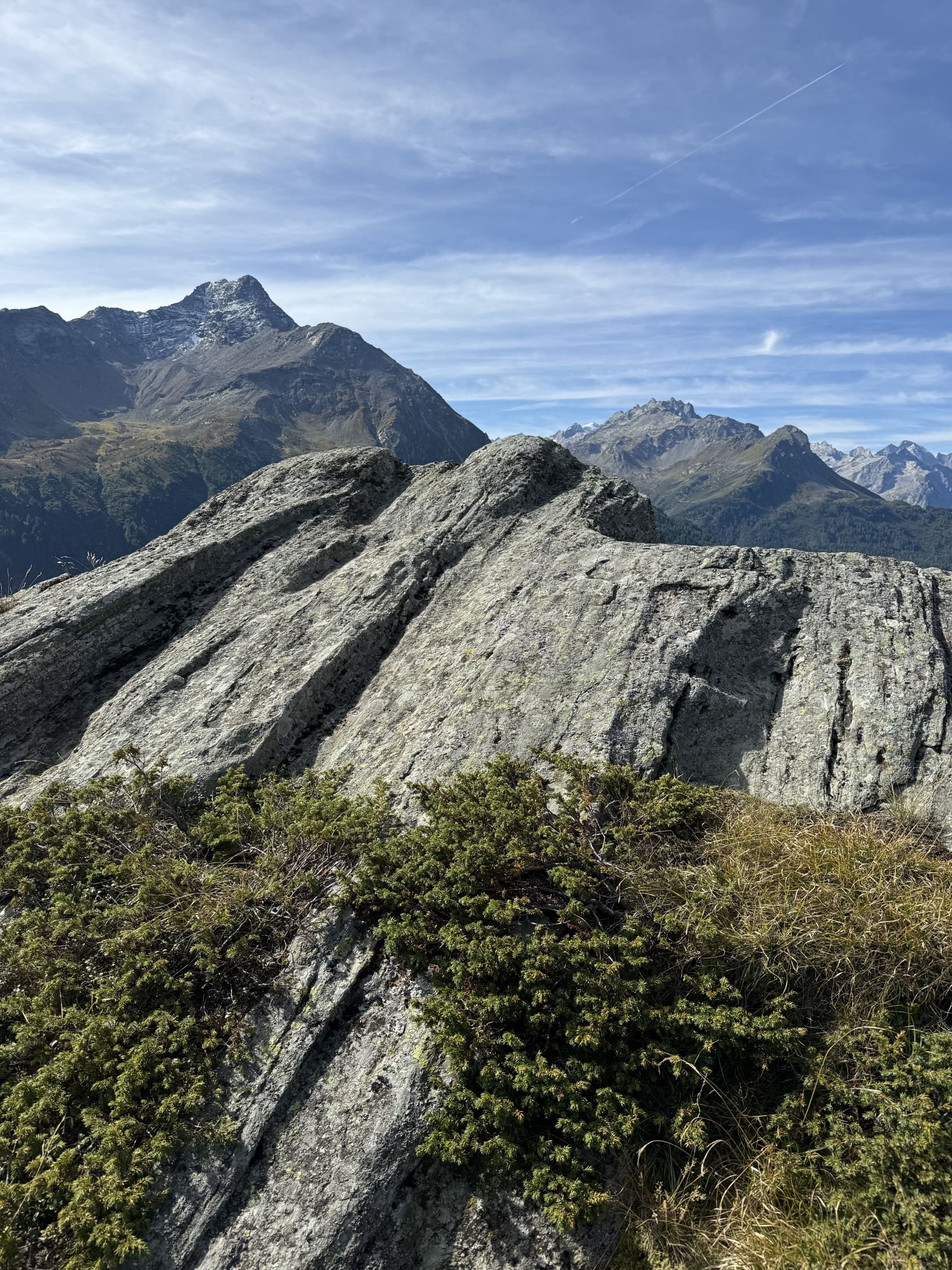 Kurze Morgentour auf den markanten Pfeiler östlich Grevasalvas mit toller Aussicht, T4-II. Start Grevasalvas 9 Uhr, 8 Grad, windstill, Zirruswolken. Ohne Probleme bis zum Pfeiler, die steile Grasflankenhoch, im oberen Teil Weglein bis Plateau. Nun kurze Klettereinlage, 2. Grad, etwas ausgesetzt zum felsigen Gipfel P. 2055. Abstieg wie Aufstieg.