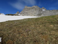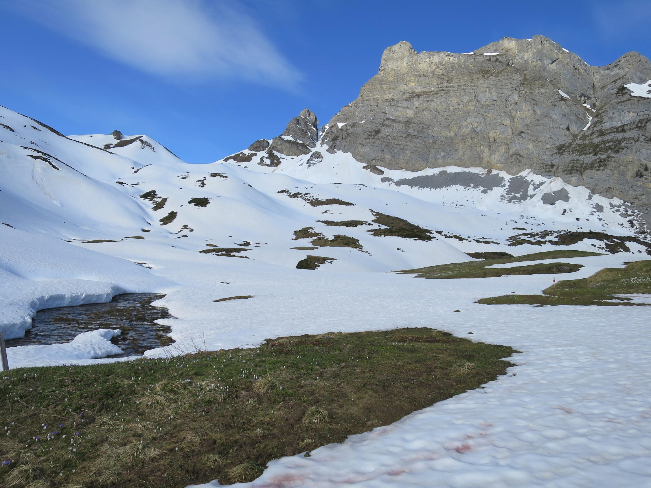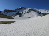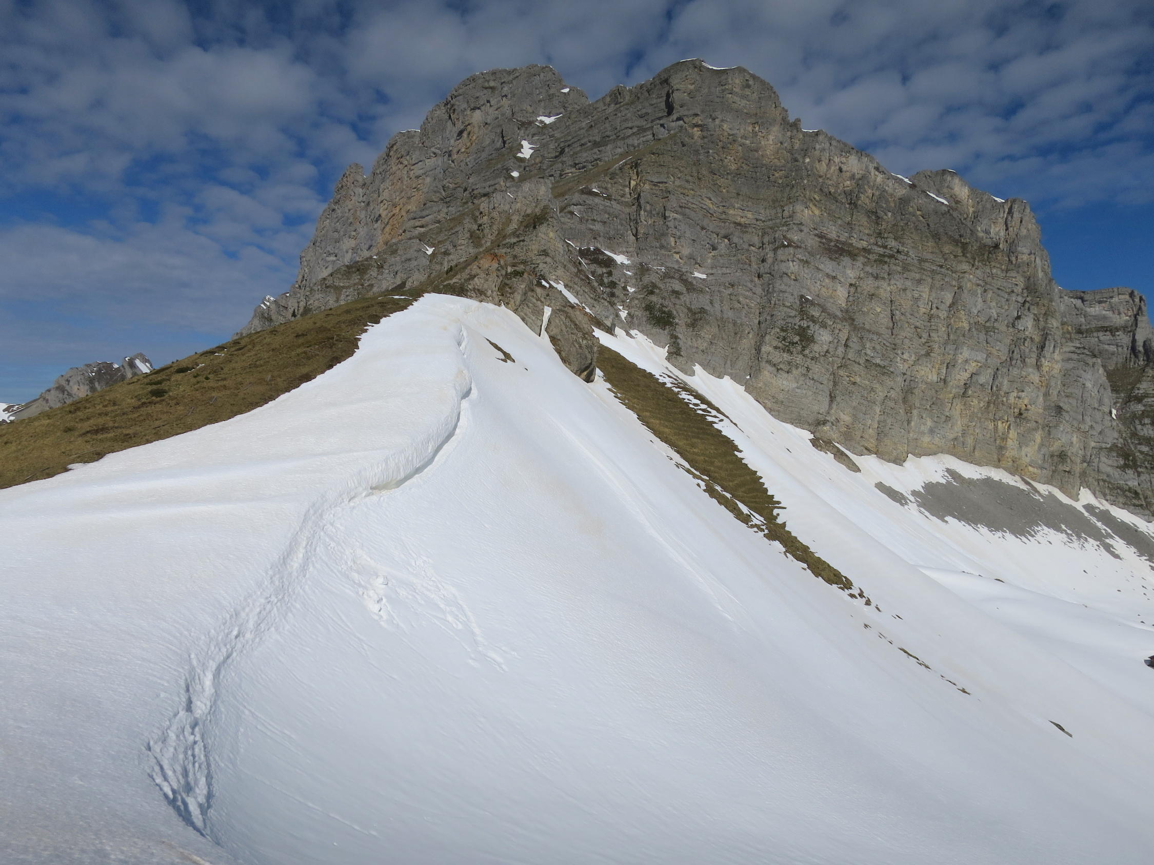 Ab Alp Grimmi bis Grimmifurggi noch eine Weile mit Skis machbar. Der Gipfelhang ist bereits stark ausgeapert.