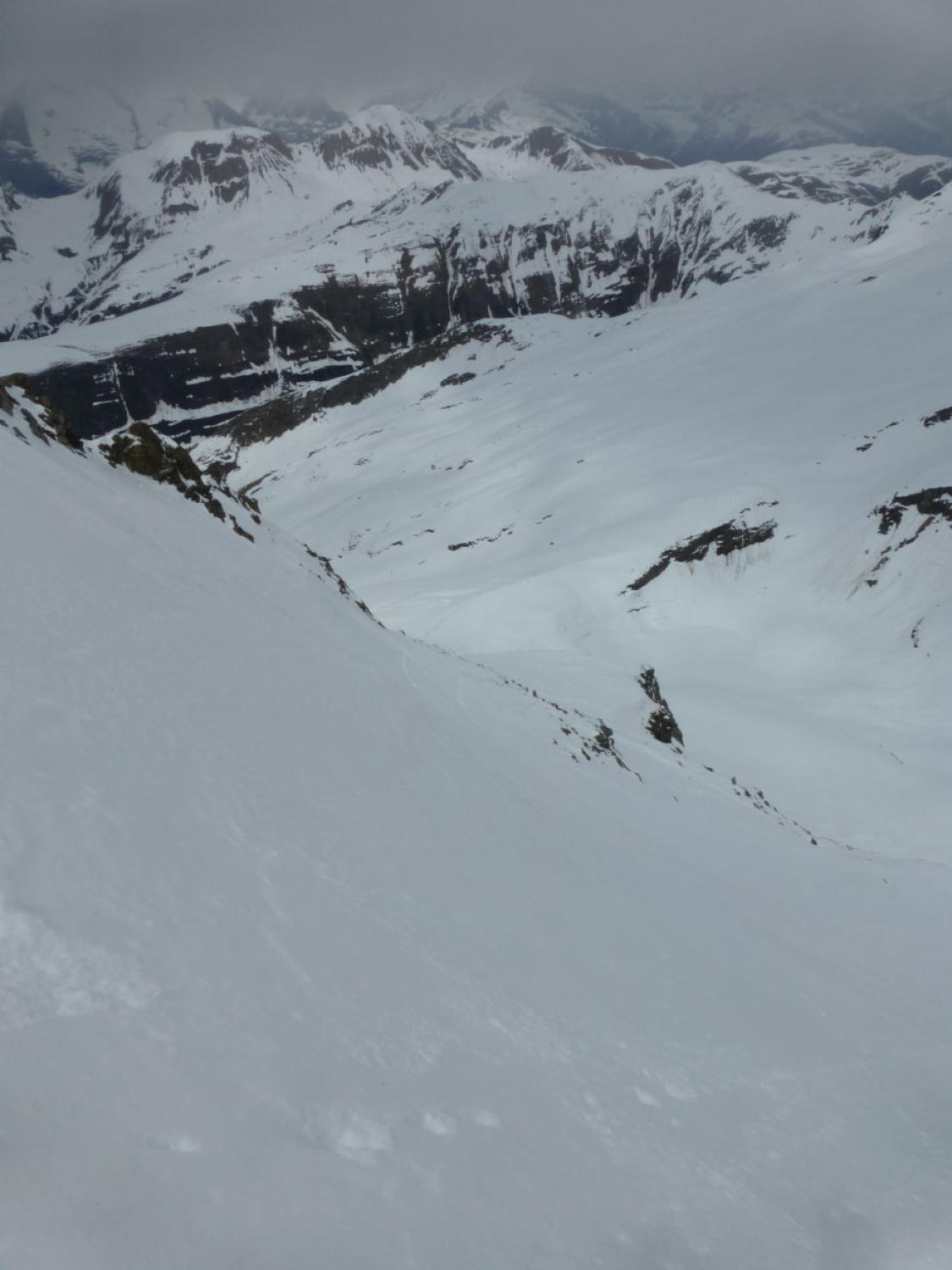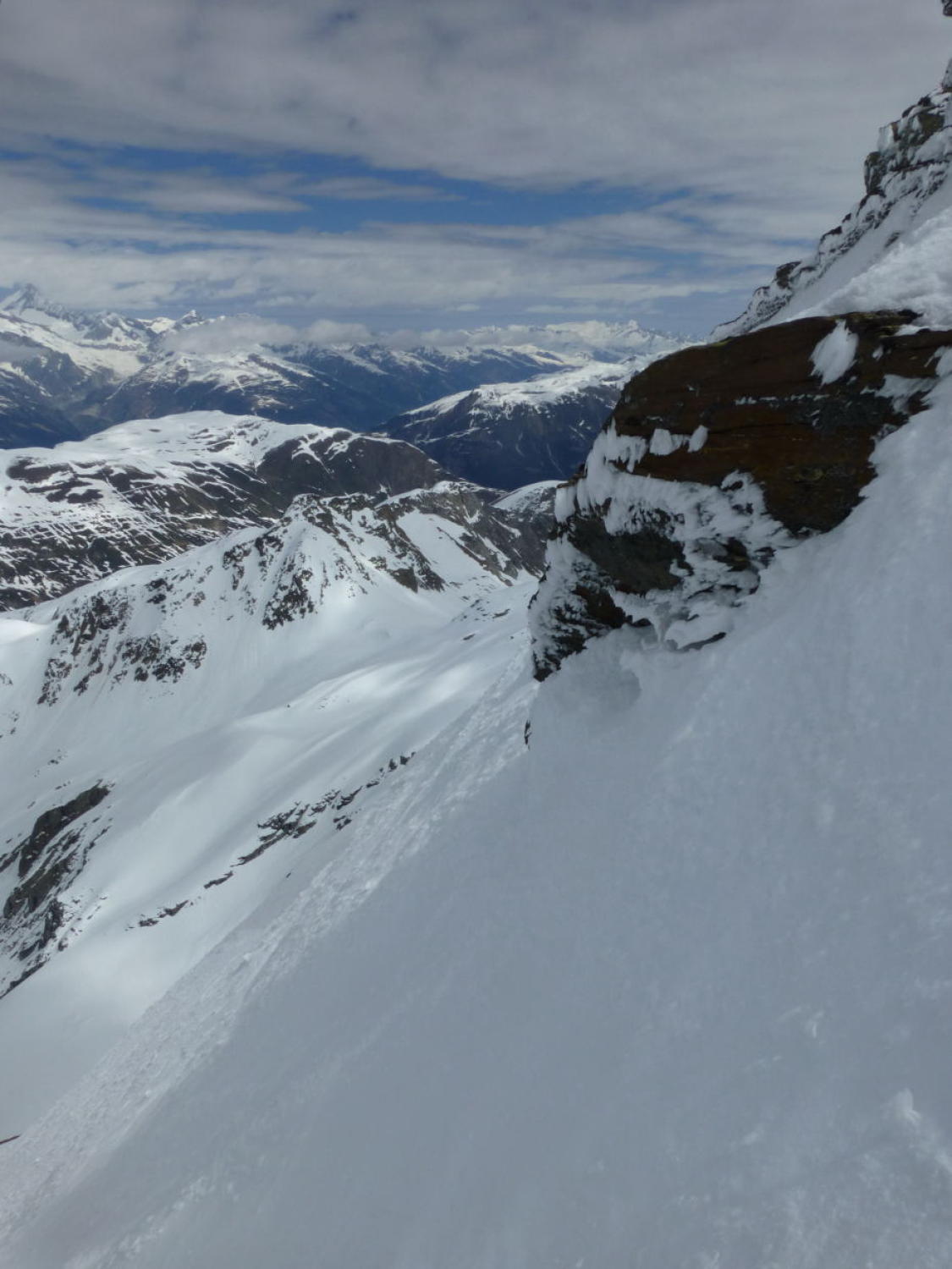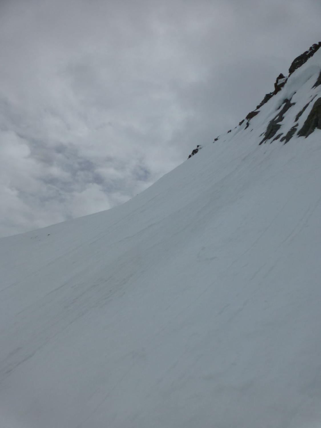 Zahlreiche ältere Locker- und Nassschneelawinen. In der NE-Flanke einige oberflächliche Nasschneerutsche ausgelöst (Sluff-Management).