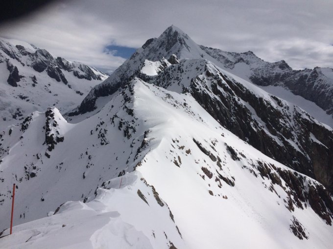 Aufstieg bis Beichpass: Start 6:30 gletscherstafel, bis 2000m Ski getragen. Dischliggletscher und östlicher Seitenarm harte, tragende Schneedecke, zT. mühsam über Lawinenbollen, immer steil. Letzte 50 hm unterhalb Beichpass nordseitig schlecht verfestigter Lockerschnee, sicherungstangen frei, wurden nicht gebraucht, Umgehung im Schnee einfacher. Abfahrt Beichpass südseitig um 9:30 schöne sulzhänge. Aufstieg Beichgletscher bis ca. 3500 m ideal tragende Schneedecke, sehr griffig. 3500-3600 m Klebschnee vom Feinsten, Oberschenkelbrennen garantiert! Aufstieg Ostgipfel Lockerschnee, mühsam. Gipfelabfahrt Start 13:30, bereits stark bedeckter Himmel, dadurch noch nicht zu weich, bis 3200 m schöne Sulzbedingungen. 3200 - 3050 m angeseilt abgefahren, weicher Schnee, heikle Spalten. Abfahrt Beichpass gegen 15 Uhr, oben tragend, dann tiefer, aber einigermassen fahrbarer Nassschnee. 16 Uhr Parkplatz, gerade noch vor Einsetzen von kräftigem Regen.