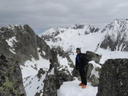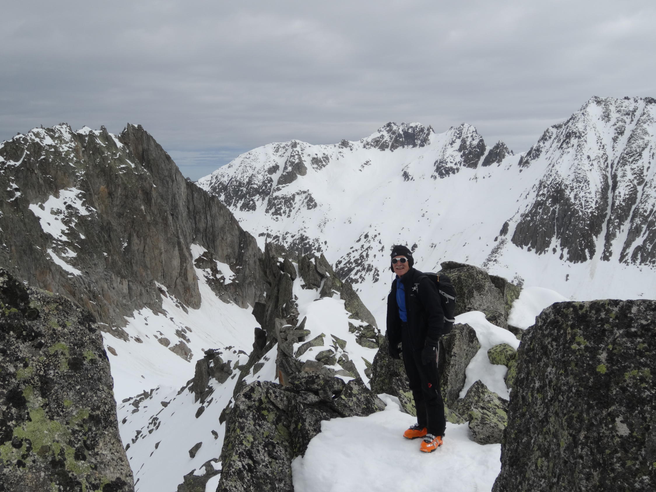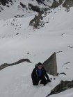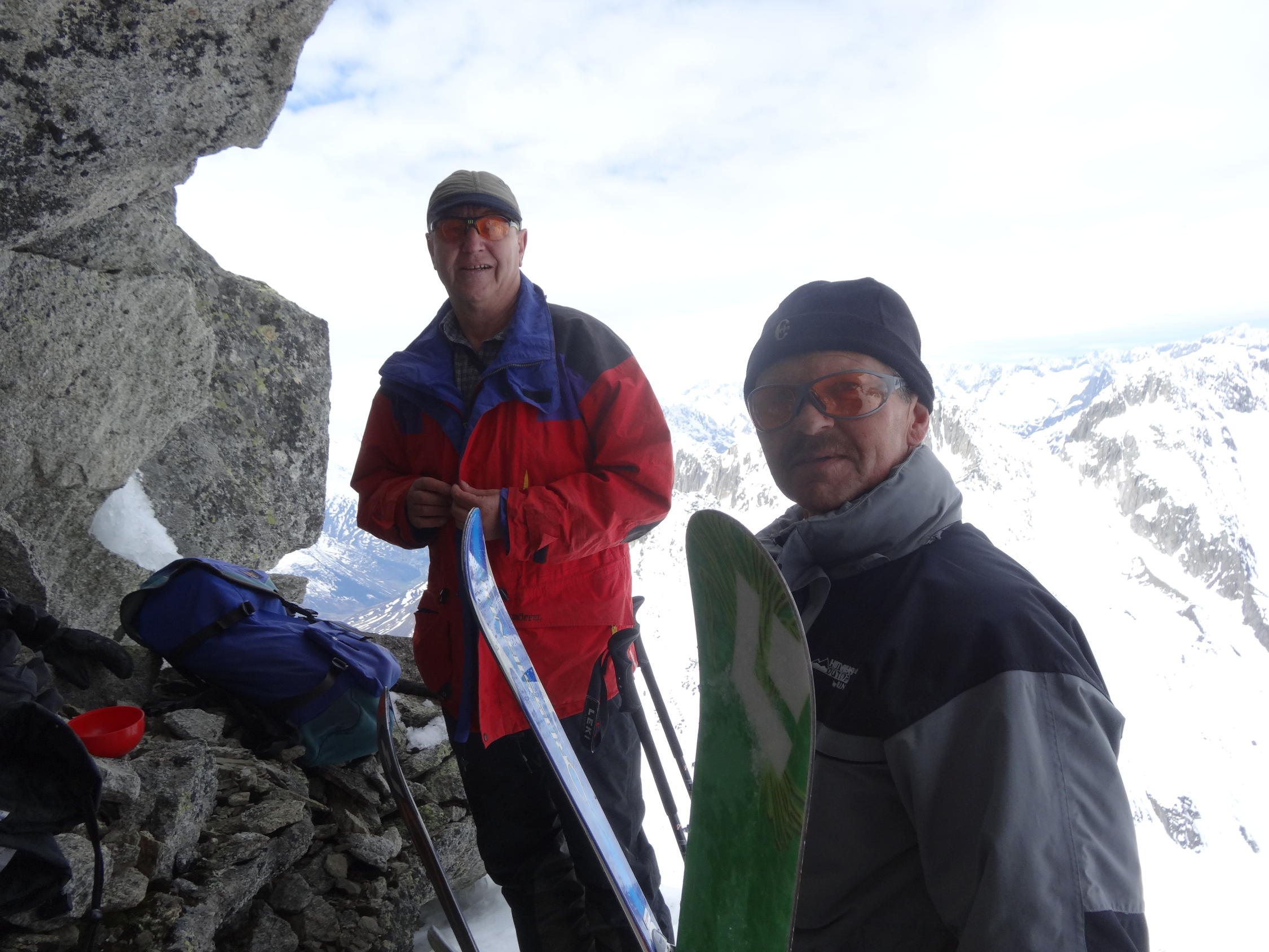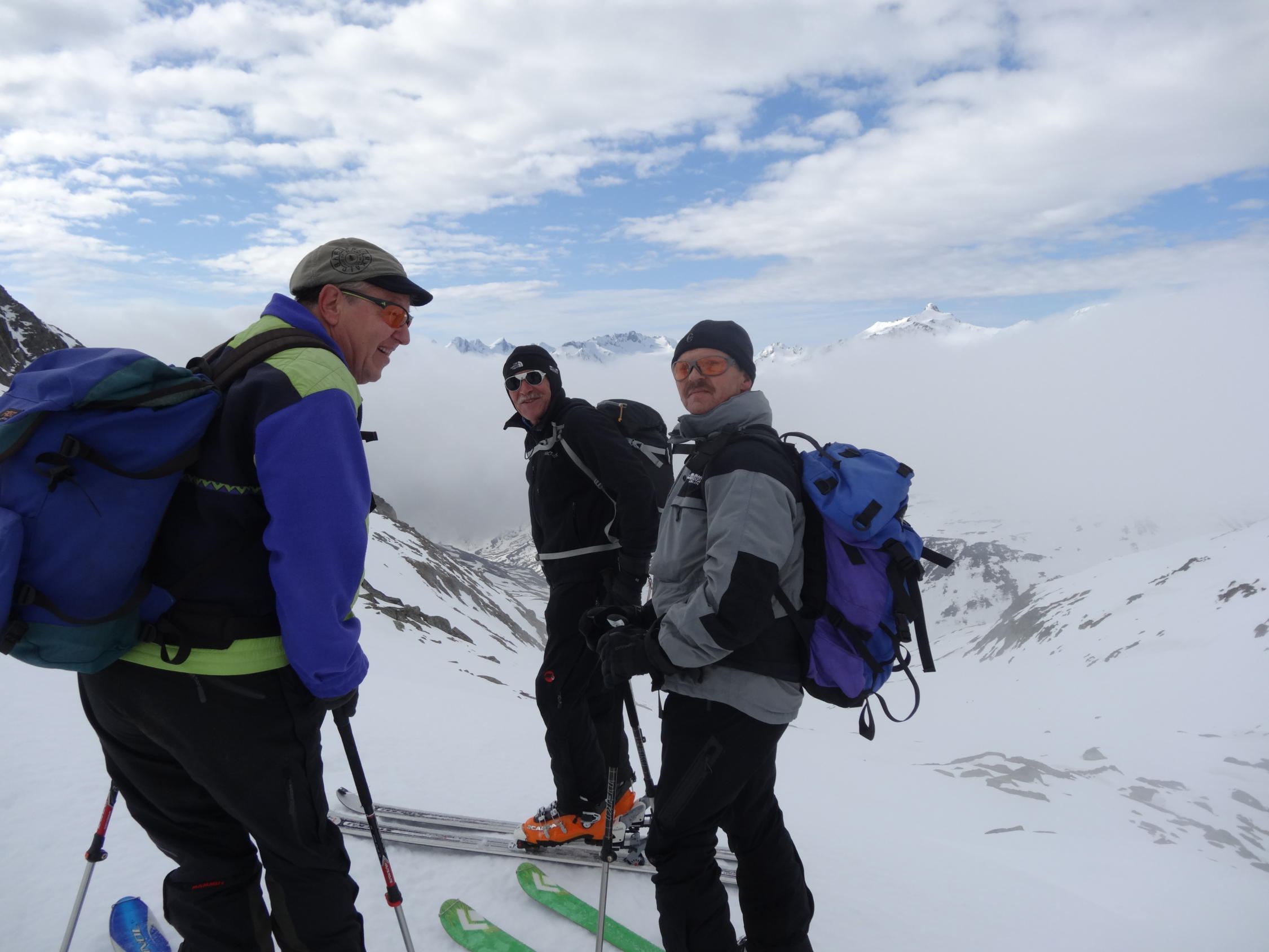 Bis auf eine Stelle in der ersten Steilstufe noch geschlossene Schneedecke. Bei der Abfahrt Schnee sehr weich. Zu Beginn stockdicker Nebel. Dank an die beiden mit dem GPS.