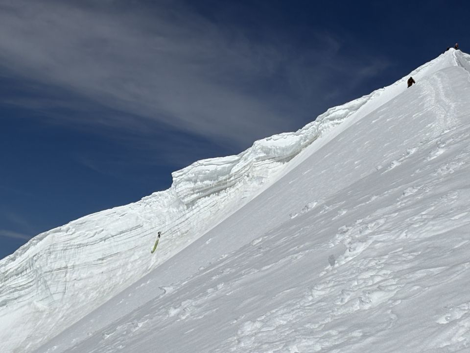 Als wir in den Schnee nach den ersten Kletterstellen kamen, beobachtete eine Gruppe bereits einen Gleitschirmflieger der mit Pickel die Südwand an steiler Stelle im oberen Teil hochstieg, und seinen Gleitschirm hinter sich hochzog. Alle hofften, dass er wieder gut starten konnte von dort. Ein Helikopter kam schon für einen Kontroll/Rettungsflug, aber es schien dass der Gleitschirmflieger wohl wieder selber abfliegen konnte.