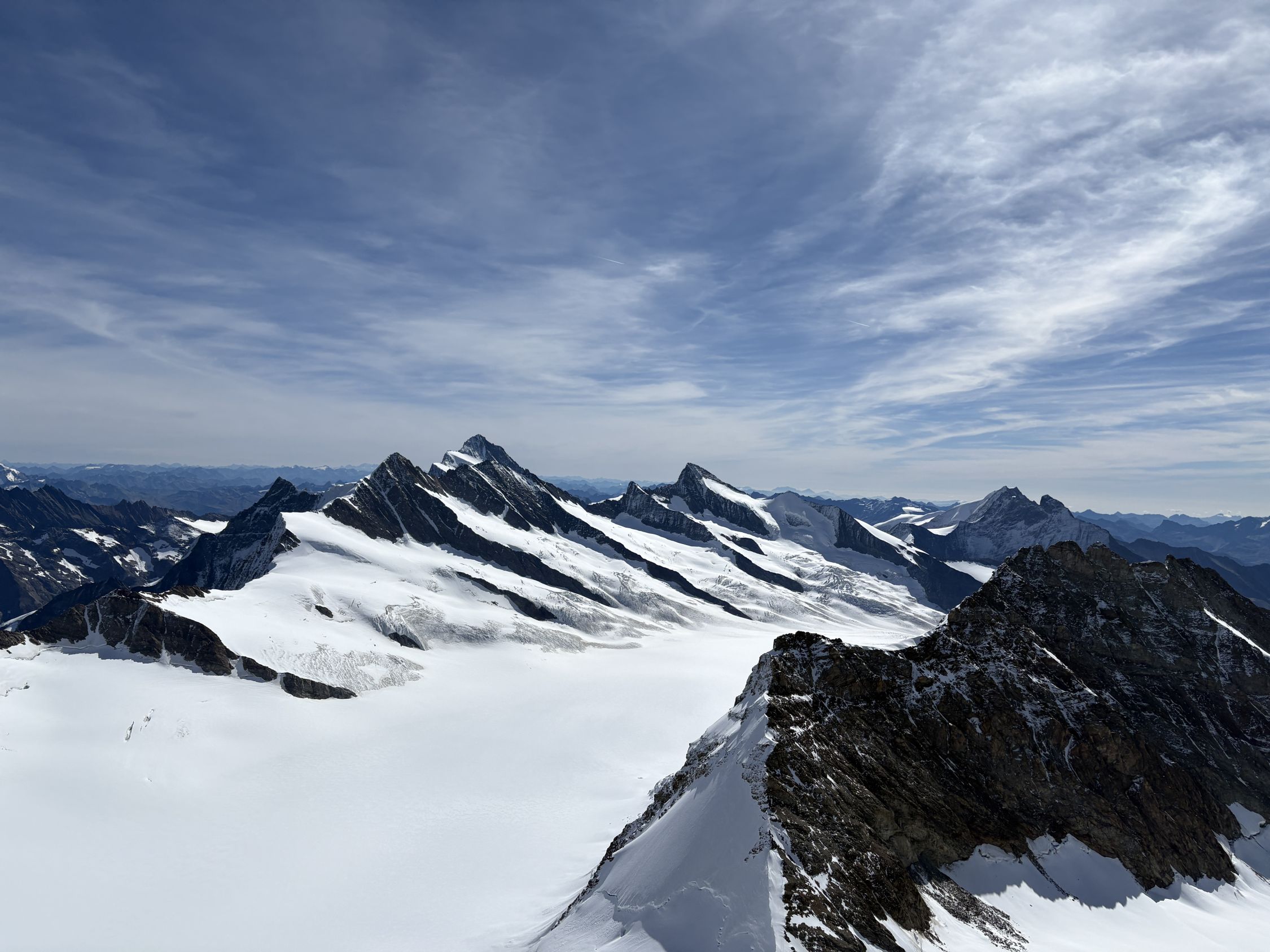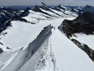Feinstes Wetter und Aussicht heute. Unten Fels gut zu klettern, oben gute Schneeauflage an den Graten.