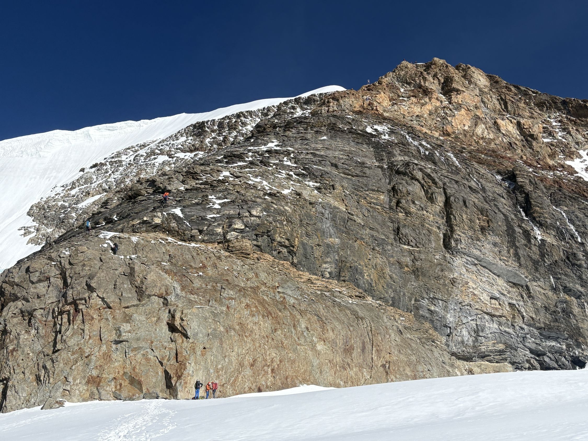 Als wir in den Schnee nach den ersten Kletterstellen kamen, beobachtete eine Gruppe bereits einen Gleitschirmflieger der mit Pickel die Südwand an steiler Stelle im oberen Teil hochstieg, und seinen Gleitschirm hinter sich hochzog. Alle hofften, dass er wieder gut starten konnte von dort. Ein Helikopter kam schon für einen Kontroll/Rettungsflug, aber es schien dass der Gleitschirmflieger wohl wieder selber abfliegen konnte.