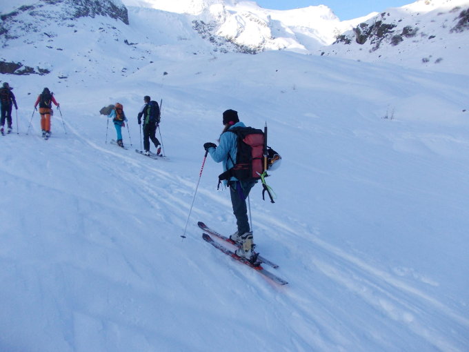 Abfahrt: Direkt Abfahrt vom Gipfel sehr schöner Sulz. In schwach geneigten Fläche vor dem Gipfel teils noch Pulverschnee. Ab hier wählte Beat die Spezialroute nach Osten an den Brunnetstock. Hier führt eine 30 - 35 gradige Rinne 20m - 50m breit runter. Am Schluss müssen kurz 20m die Ski getragen werden.