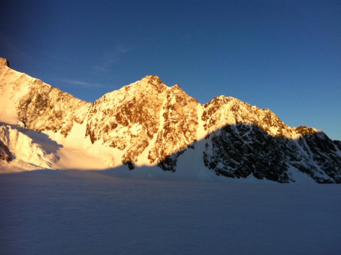 Auf der Abfahrtvariante bis 3000 nordseitig grossteils 10cm Pulver, dann kurz Lawinenschnee im grossen Couloir.
