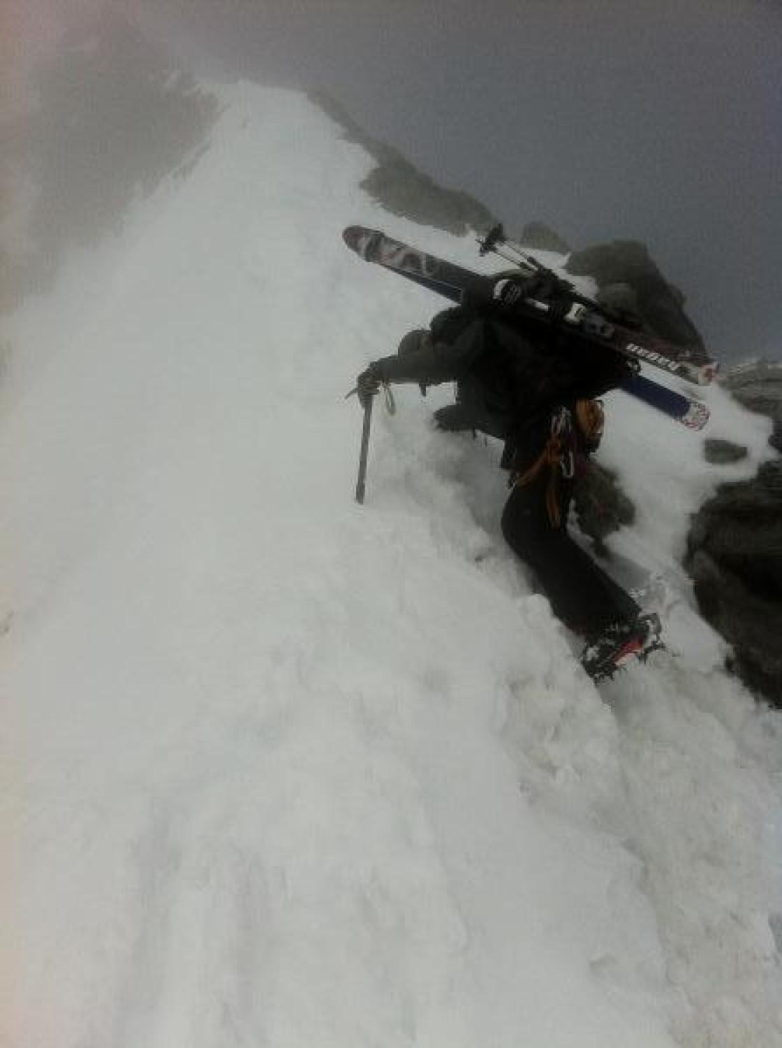 Die Gipfel ist westseitig dank vielem Schnee gut mit Pickel, Steigeisen und aufgebundenen Skis zu erklimmen.