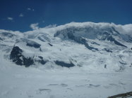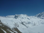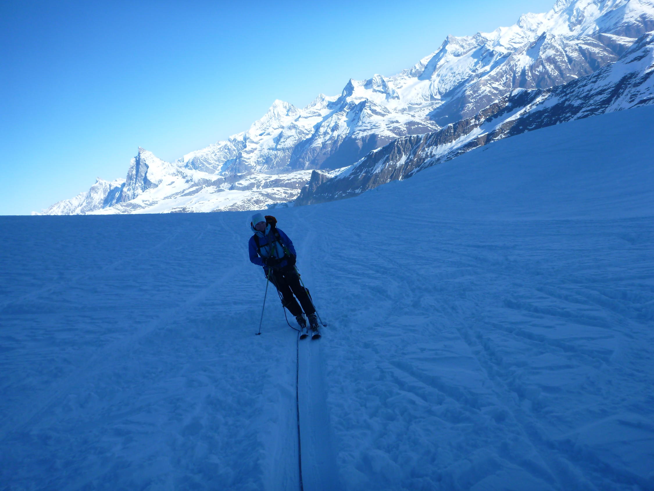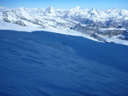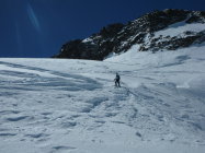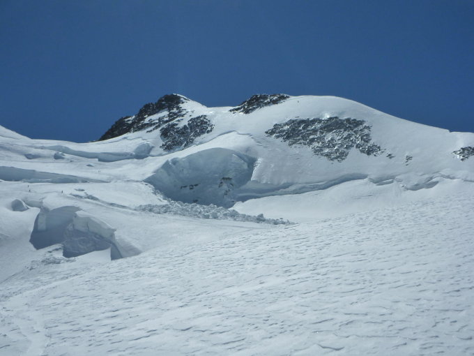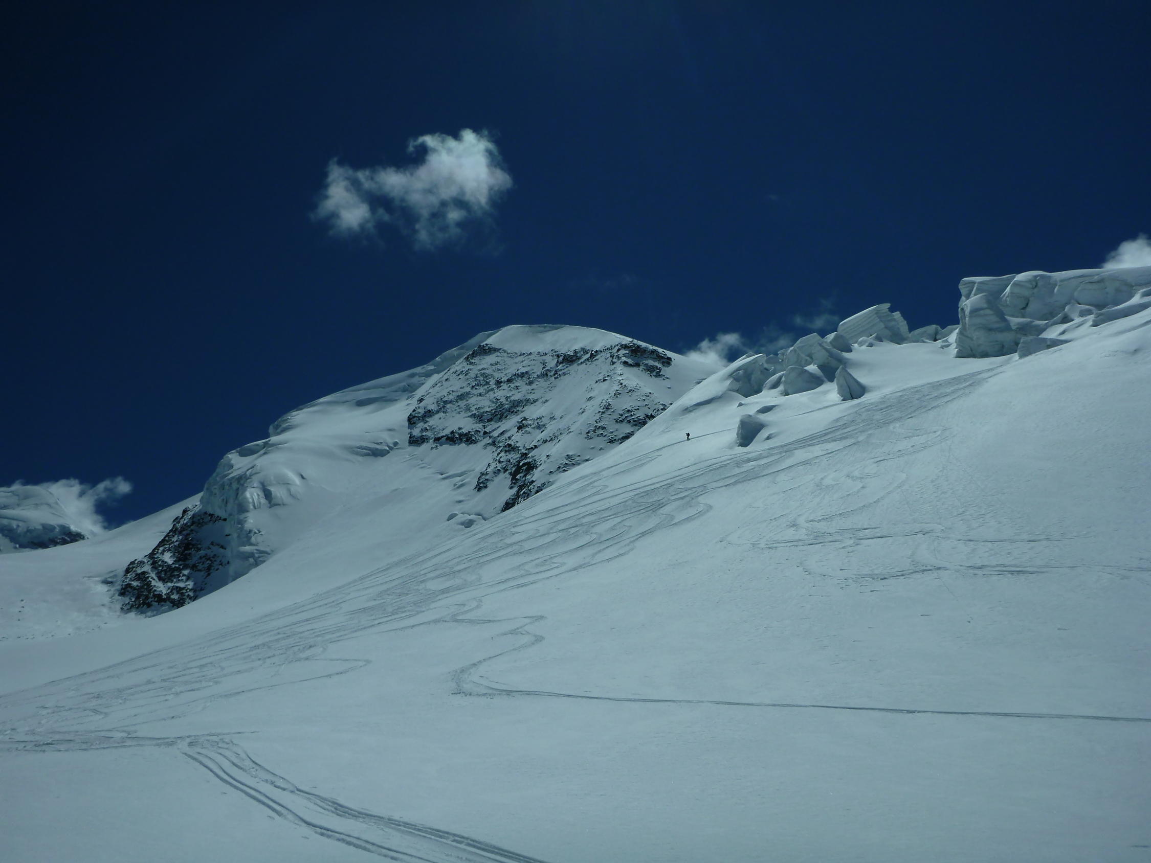 Der Gornergletscher ist gut eingeschneit. Der Uebergang vom Gornergletscher zum Aufstieg Richtung Monte Rosa Hütte ist spaltenreich, aber mit der notwendigen Vorsicht problemlos, wie meistens.