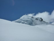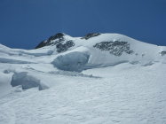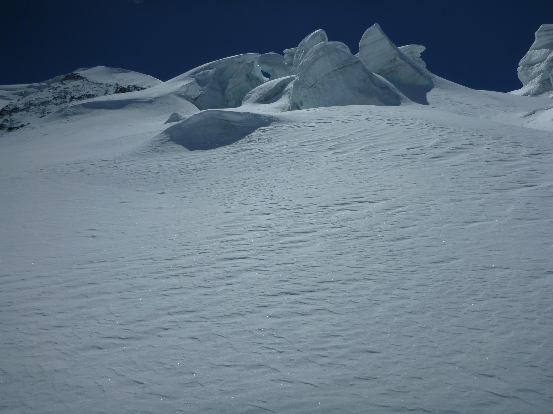 Die Spalten und Seraques oberhalb 4000 m könnnen links, oder etwas schneller, aber heikler rechts, umgangen werden. Auf einer guten Spur geht's zum Silbersatte.