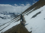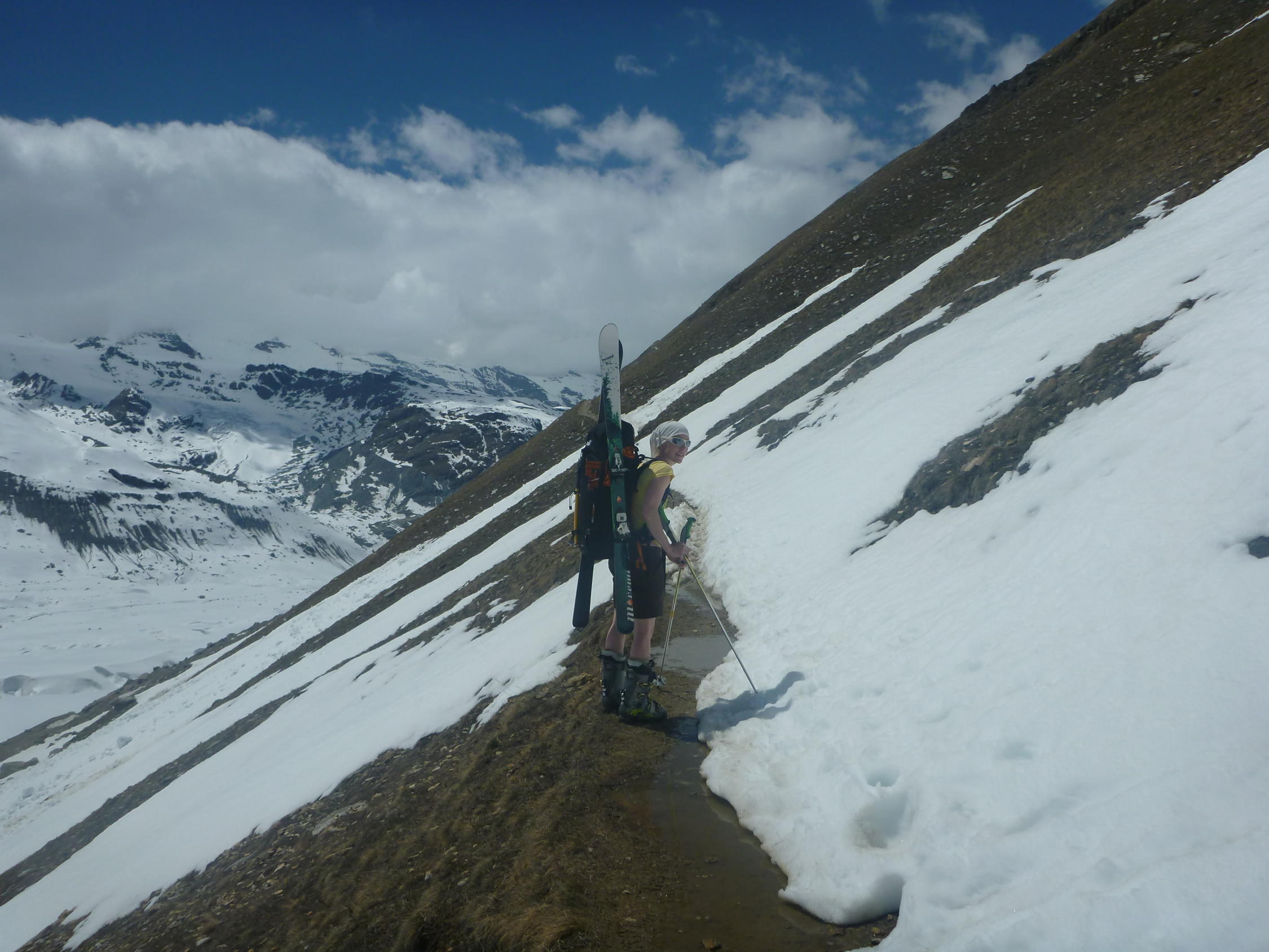 Oder man geniesst, so wie wir es gemacht haben, die Abfahrt an der Monte Rosa Hütte vorbei auf den Gornergletscher und steigt hoch zum Wanderweg nach Roten Boden. Der Weg ist etwas länger als über den Klettersteig, die Wanderung Richtung Roten Boden bleibt allerdings mit keiner Variante erspart.
