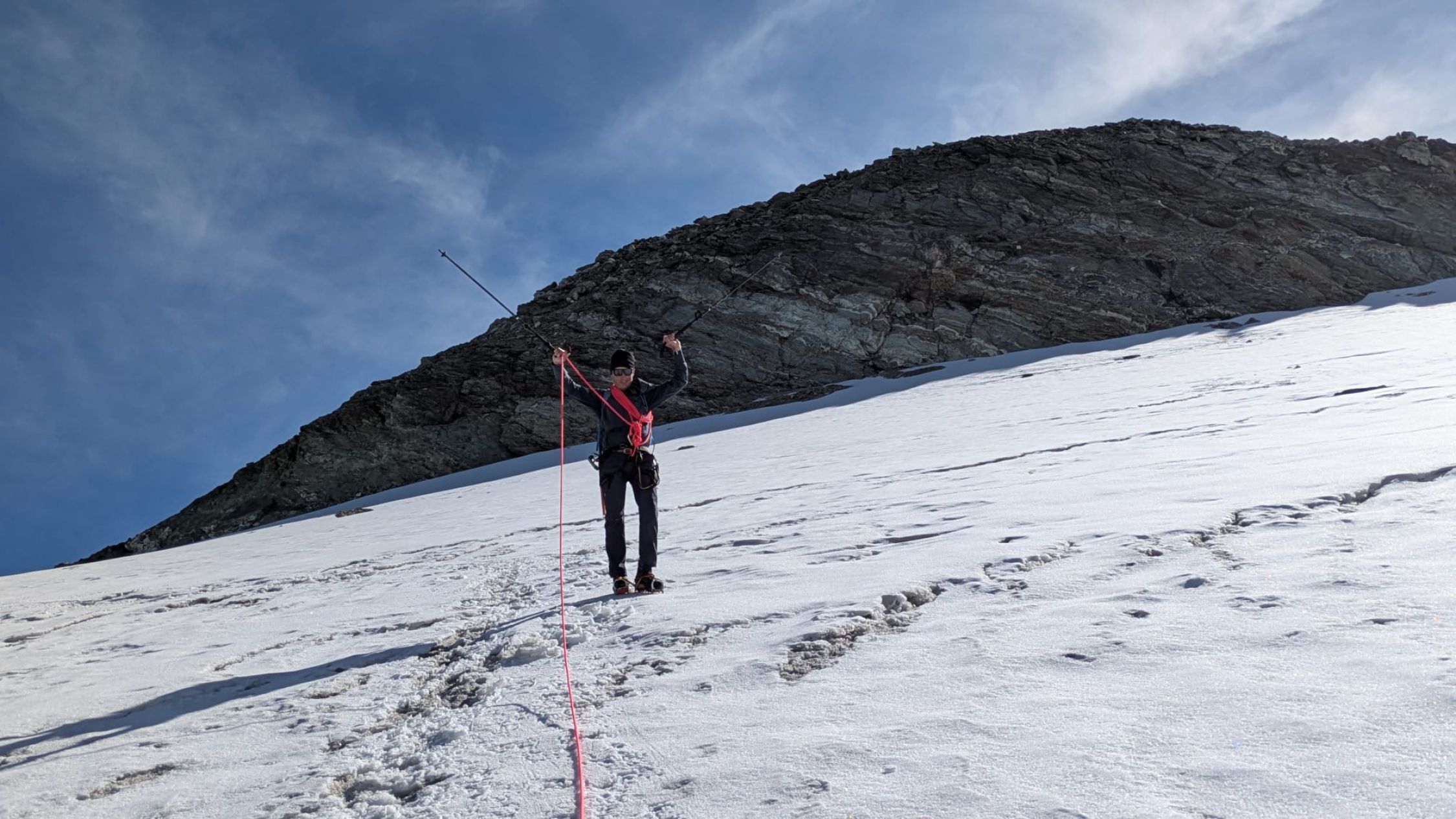 Normale Hochtouren-Ausrüstung. Grat kann seilfrei gemacht werden. Gletscherseil für den Abstieg.