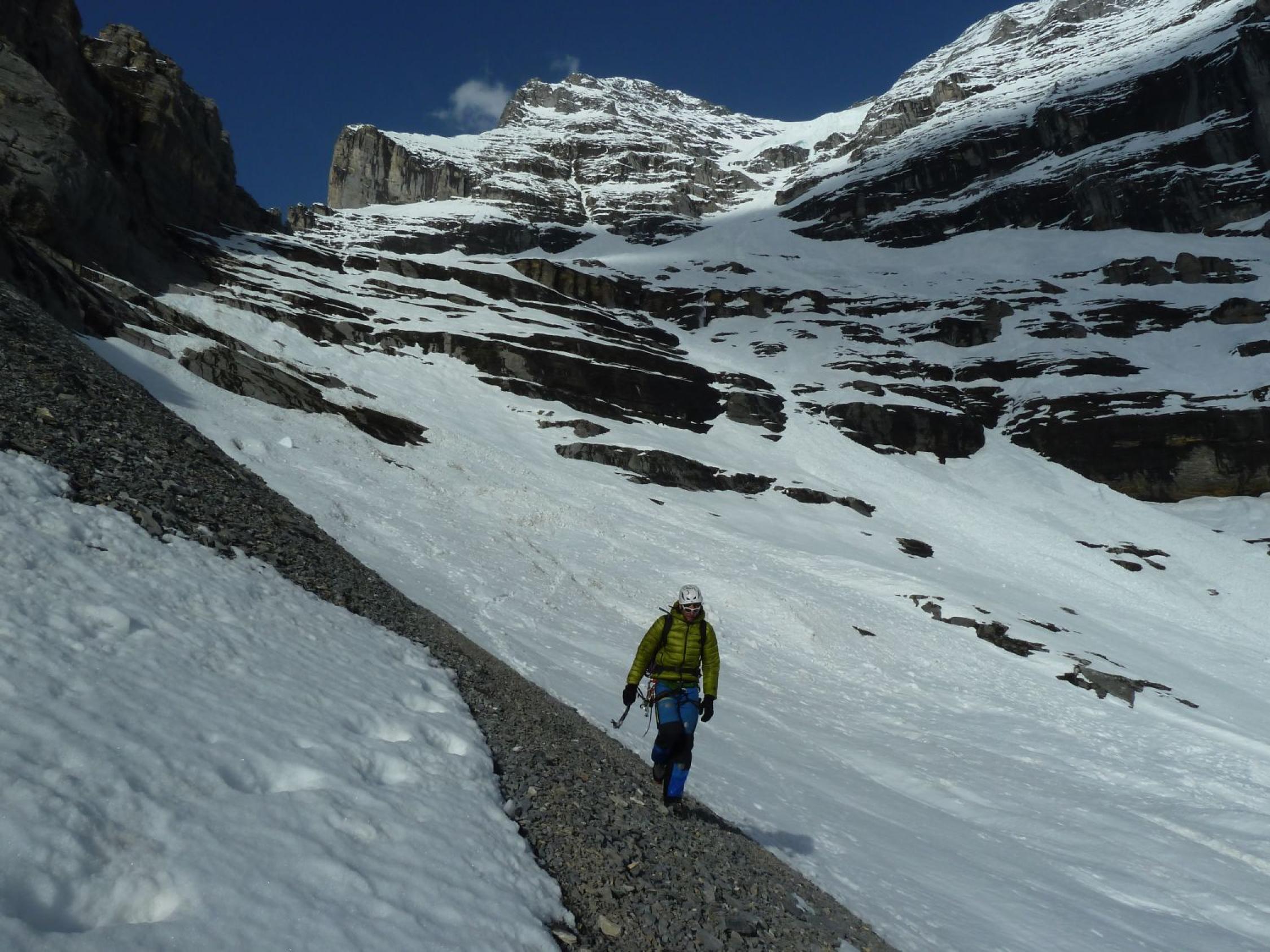 Allerdings waren die Verhältnisse nur bis zu einer gewissen Uhrzeit sehr gut. Aufgrund grenzwertig warmer Temperaturen nahmen die Eis-Schnee-Steinschlag Aktivitäten im Tagesverlauf deutlich zu und der Schnee weichte sehr auf. Wir waren gegen 16 uhr am Todesbiwak und wollten ursprünglich noch viel weiter oben biwakieren. Wollten aber wegen dem weichen Schnee und den zunehmenden Aktivitäten nicht mehr weiter.