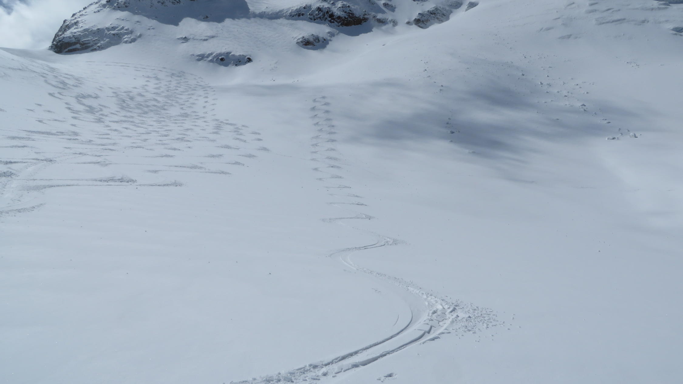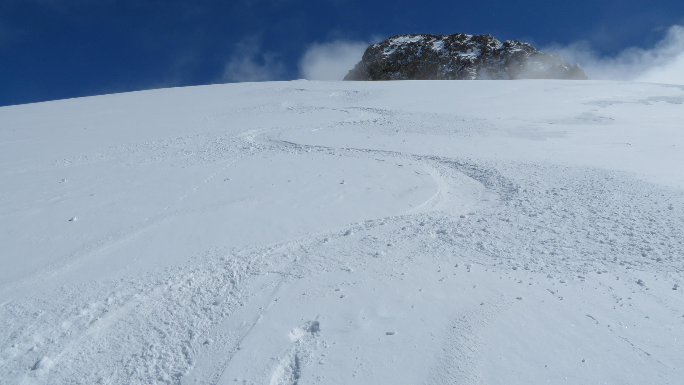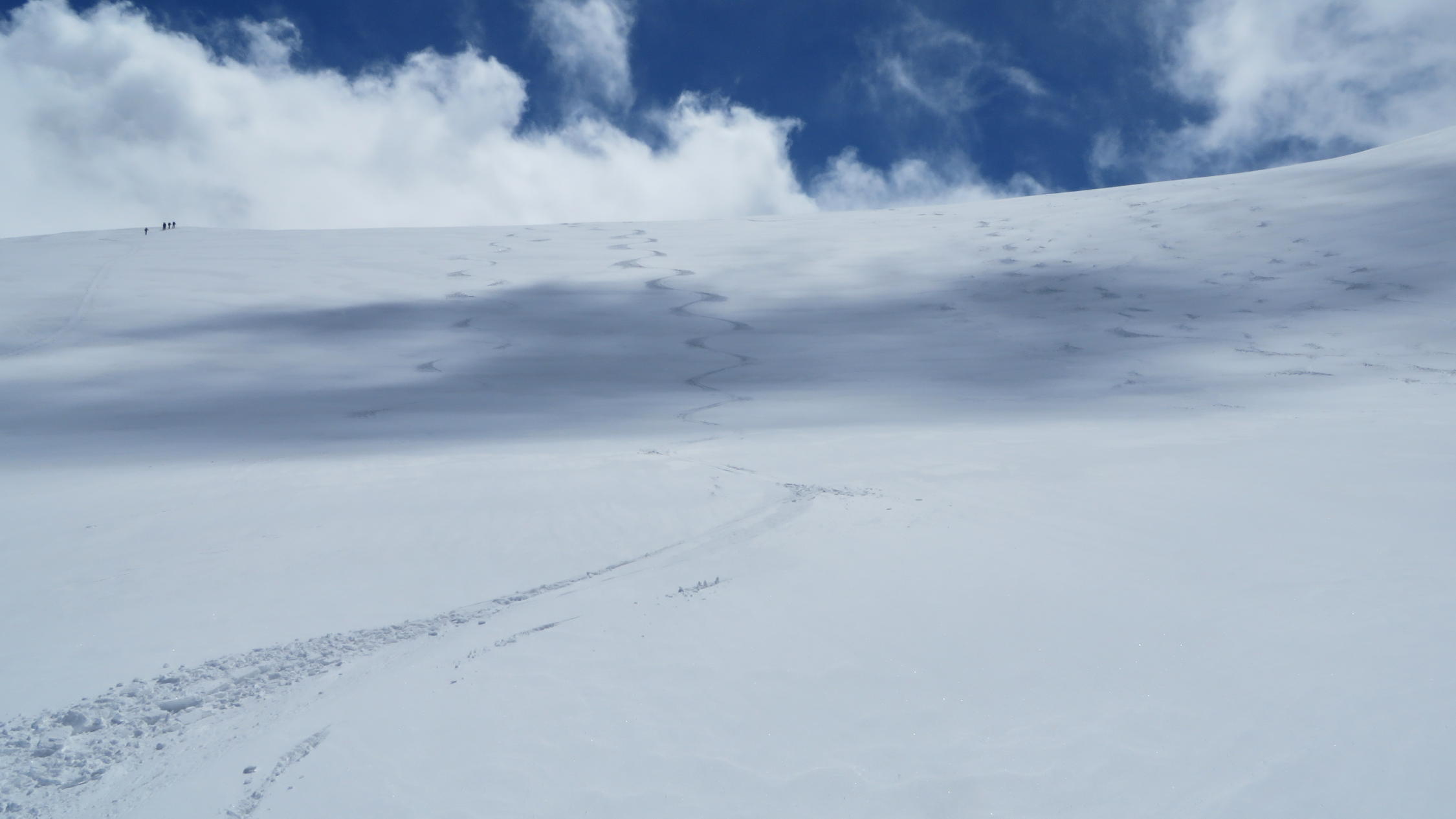 Die Schneeverhältnisse waren heute gut oberhalb 2500m 5-15cm Pulverschnee mit tragender Unterlage,zwischendurch Gipfelhang abgeblasen und hart. Unterhalb feuchter Pulver und ganz unten klebriger Nassschnee.