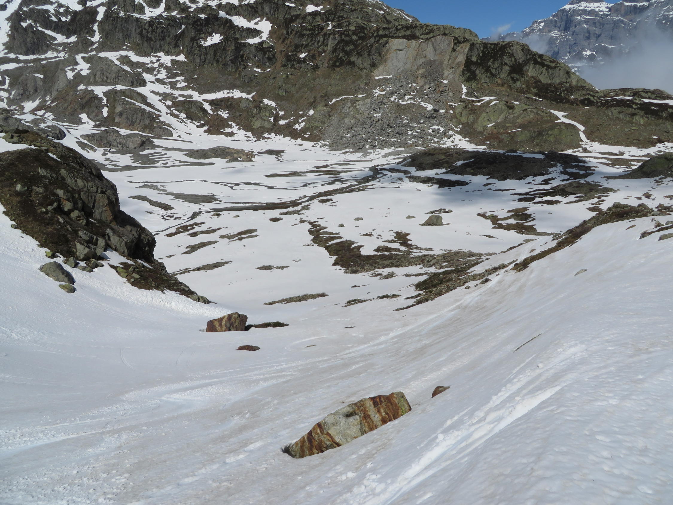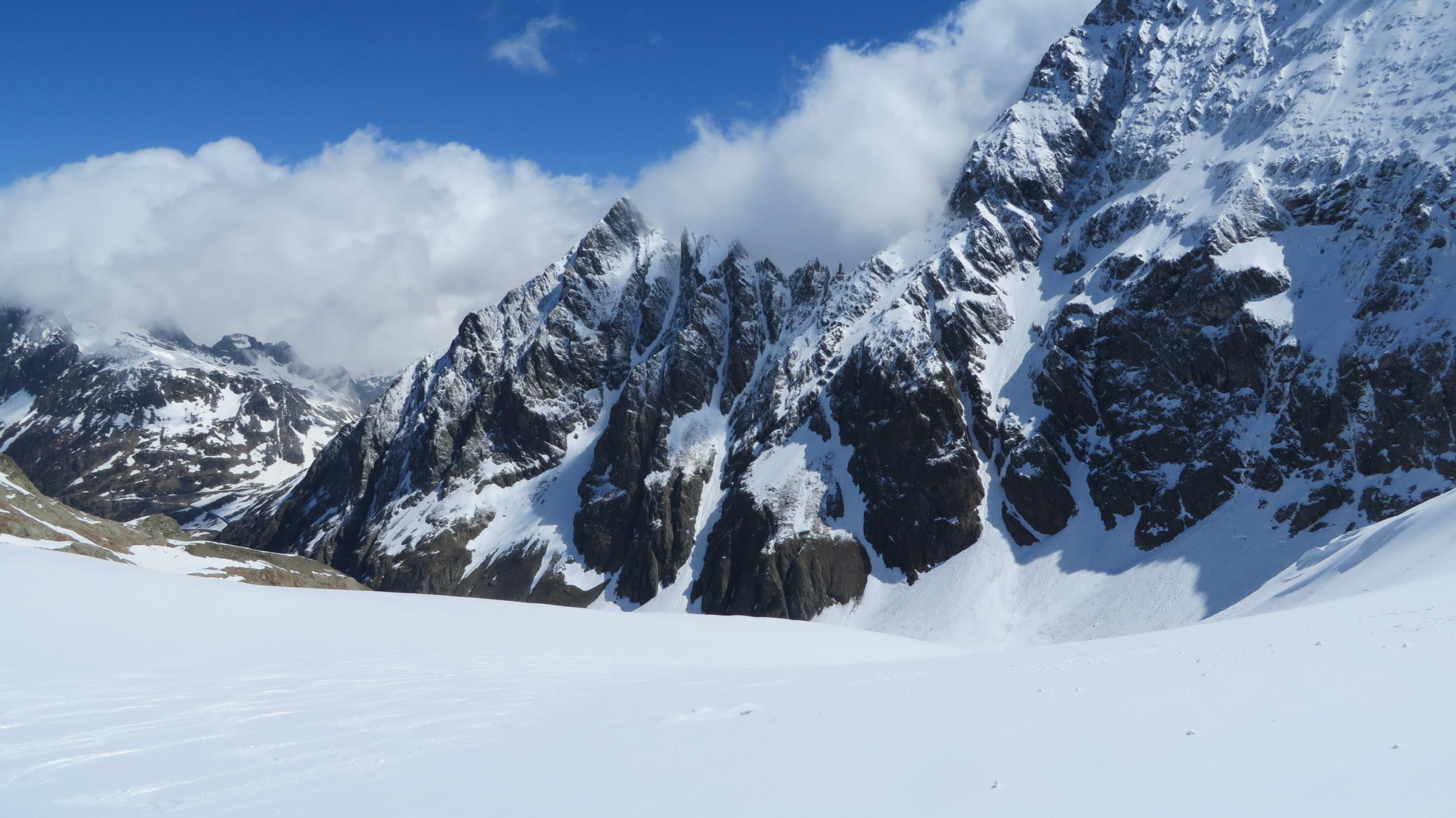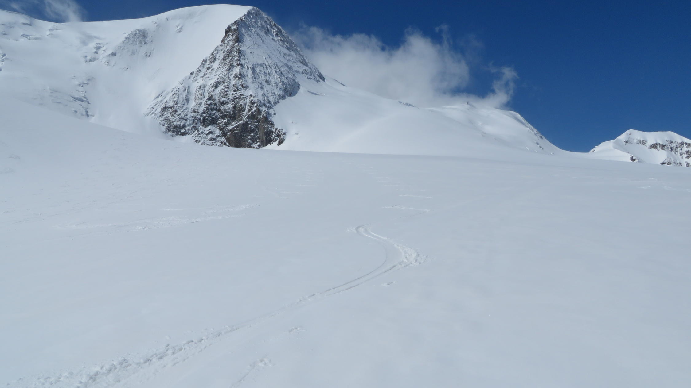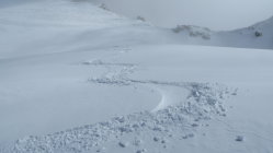Die Schneeverhältnisse waren heute gut oberhalb 2500m 5-15cm Pulverschnee mit tragender Unterlage,zwischendurch Gipfelhang abgeblasen und hart. Unterhalb feuchter Pulver und ganz unten klebriger Nassschnee.