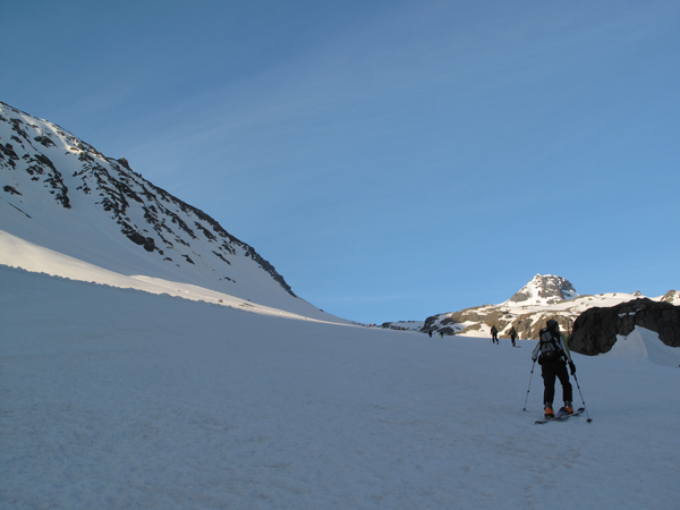 Abfahrt vom Gipfel in Richtung Osten zur Lücke Punkt 2982 m. Super Verhältnisse auf der Abfahrt um ca. 10:00 Uhr.