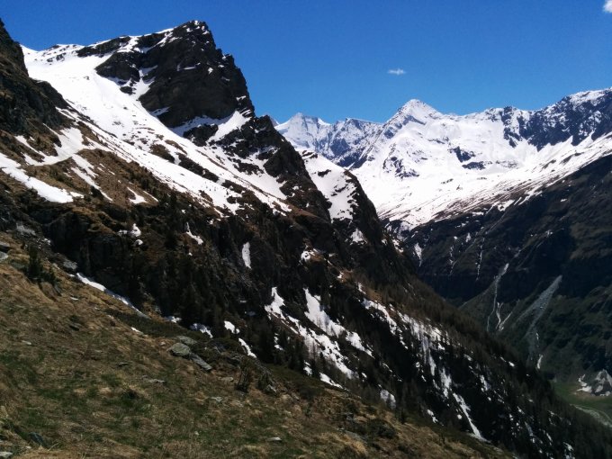 Unten wenig Schnee. Wir haben uns für den Sommerweg Richtung Cabane de Tracuit entschlossen und konnten die Ski erst ab ca 2400m anschnallen. Da wir spät unterwegs waren und ein Zelt dabeihatten, entschlossen wir uns noch vor dem Col de Tracuit zu biwakieren. Der Turtmanngletscher ist noch sehr gut eingeschneit und eigentlich unbedenklich. Kurz vor dem Gipfel haben wir uns für den Weg rechtsherum (W-seitig) entschieden, weil das flacher aussah. Dafür muss man aber dort über stellenweise pickelharten Harsch traversieren und steigt am Ende heikel über eine steiler Wassereisstelle mit dünner Schneeauflage. Linksherum ist es auf jeden Fall einfacher.