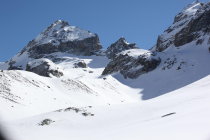 Auf dem Glacier Bas d' Arolla noch ausreichend Schnee, dann nochmals ca. 10 min tragen der Skis auf komplett aperem Wanderweg, anschliessend noch jede Menge Schnee im Aufstieg zur Bertolhütte sowie auf dem Glacier du Mont Miné.