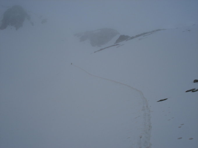 Start am 6.30 Uhr am Furkapass bei 0 Grad Temperatur, leider dichter Nebel, Schnee nicht gefrohren, am Gipfelgrat dann Schnee gut verfirnt,