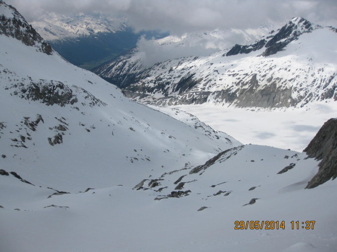 Prima Schneeverhältnisse auf der ganzen Route. Hart und griffig. In den Steilhängen, bei Sturz Abrutschgefahr ins Felsige beachten! Harscheisen und Steigeisen zwingend mitnehmen.