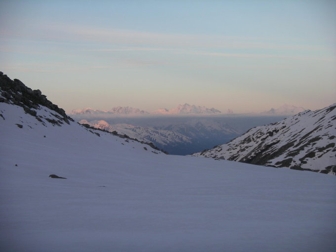 Heute schätzungsweise knapp 50 Skitourengeher am Berg, man hat sogar schon eine Dreierseilschaft "Tenü Sommer" auf dem Gletscher gesichtet!