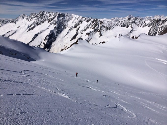 Besser geht es nicht! Wenige cm Pulverschnee auf harter, gleichmässiger Unterlage, Fahrspass schlechthin! Flacheren Teil der Gwächtenhorn Nordseite ebenfalls gefahren, griffige Unterlage mit Pulverauflage. Einzig die Steilstufe auf 2300 m apert langsam aus, Blankeis kommt dort zum Vorschein.