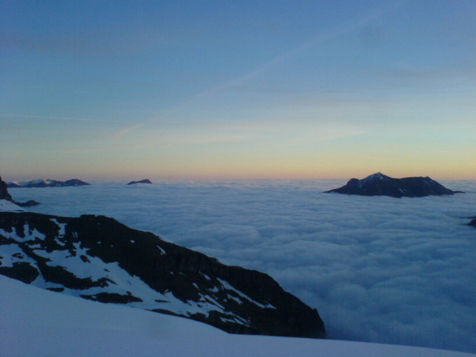 Alles in allem: Traumhaft! Start im Bundläger kurz vor 5h morgens, haarscharf über der Nebelgrenze. Hohtürlihang tragend gefroren, ab 2500 dünne Pulverauflage. Gletscher gut eingeschneit. Im Schlusshang ein wenig herumgewühlt, dafür mit Skis vom Gipfel abfahren können.