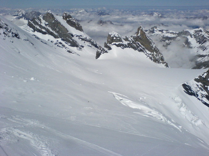 Abfahrt: Gipfelhang teils gedeckelt, dann fantastische Verhältnisse auf dem Gletscher: seidenfeines Pülverli nahtlos in butterzartes Sülzli übergehend…Unterhalb des Hohtürlis im Bereich des Sommerweges auf einen Schlag faul; Nassschneerutsche am Laufmeter ausgelöst. Zum Glück glitt nur jeweils die oberste Schicht ab, für Spektakel war dennoch gesorgt…Unterhalb 2500m dank anderer Exposition wieder besser zum Fahren.