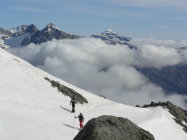Topverhältnisse auf der ganzen Route. Zum Berghaus hinunter noch viel guter Schnee, zur Passhöhe auf der italienischen Seite des Grates noch durchgehend Schnee, nicht mehr sehr lange. Abfahrt über den Altberg heute sensationell gut bis zur ersten Kurve bei den Serpentinen.