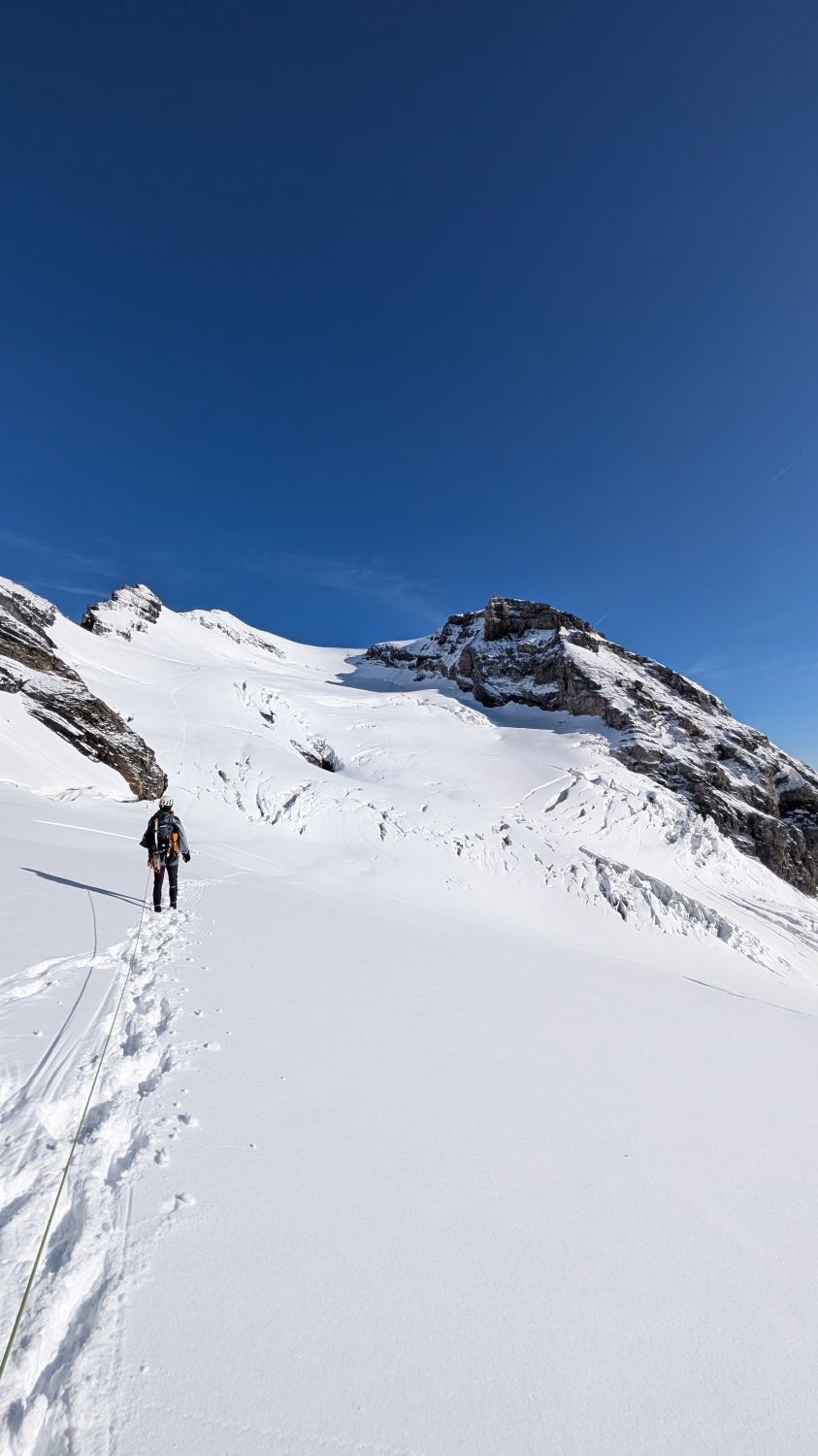 Ab Porta da Gliems etwas absteigen, und auf den Normalweg von der Fridolinshütte treffen. Gletscher ist gespurt. Viel Schneeauflage, Gamaschen hilfreich.