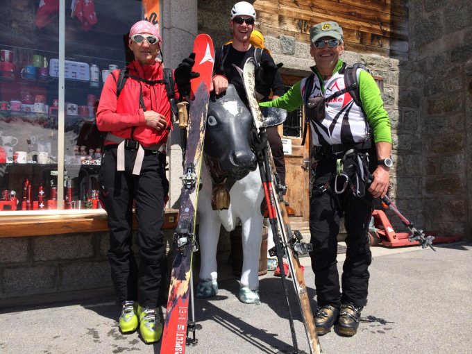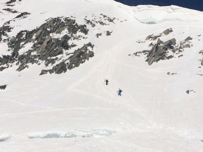 Start tiefenbach (2120 m) 5:15 +2 grad. Skitragen auf Wanderweg Richtung Albert-Heim bis 2400 m, dann durchgehend harte, tragende Oberfläche, harsteisen sind hilfreich. Geht momentan aber auch als sommertour mit Steigeisen, so jetzt auch definitiv besser als im Sommer, alle Spalten zu! Zustieg zum nordgrat etwas südlich vom skidepot ( dort gibt es kein marodes Seil mehr, sondern solide eisentritte, die den Übergang in die Felsen erleichtern (hilft bei offenem Schrund allerdings auch wenig...) gemacht, dort einfacher, aber objektiv gefährlicher, man bewegt sich unter der Wächte. Grat guter trittschnee. Abfahrt direkt vom Gipfel südseitig, sehr harte unterlage, gut fahrbar, sturz hat dort aber ernsthafte Konsequenzen! Abfahrt bis Belvedere möglich, erste Eisberge kommen aber hervor. Um 11 noch gut fahrbar.