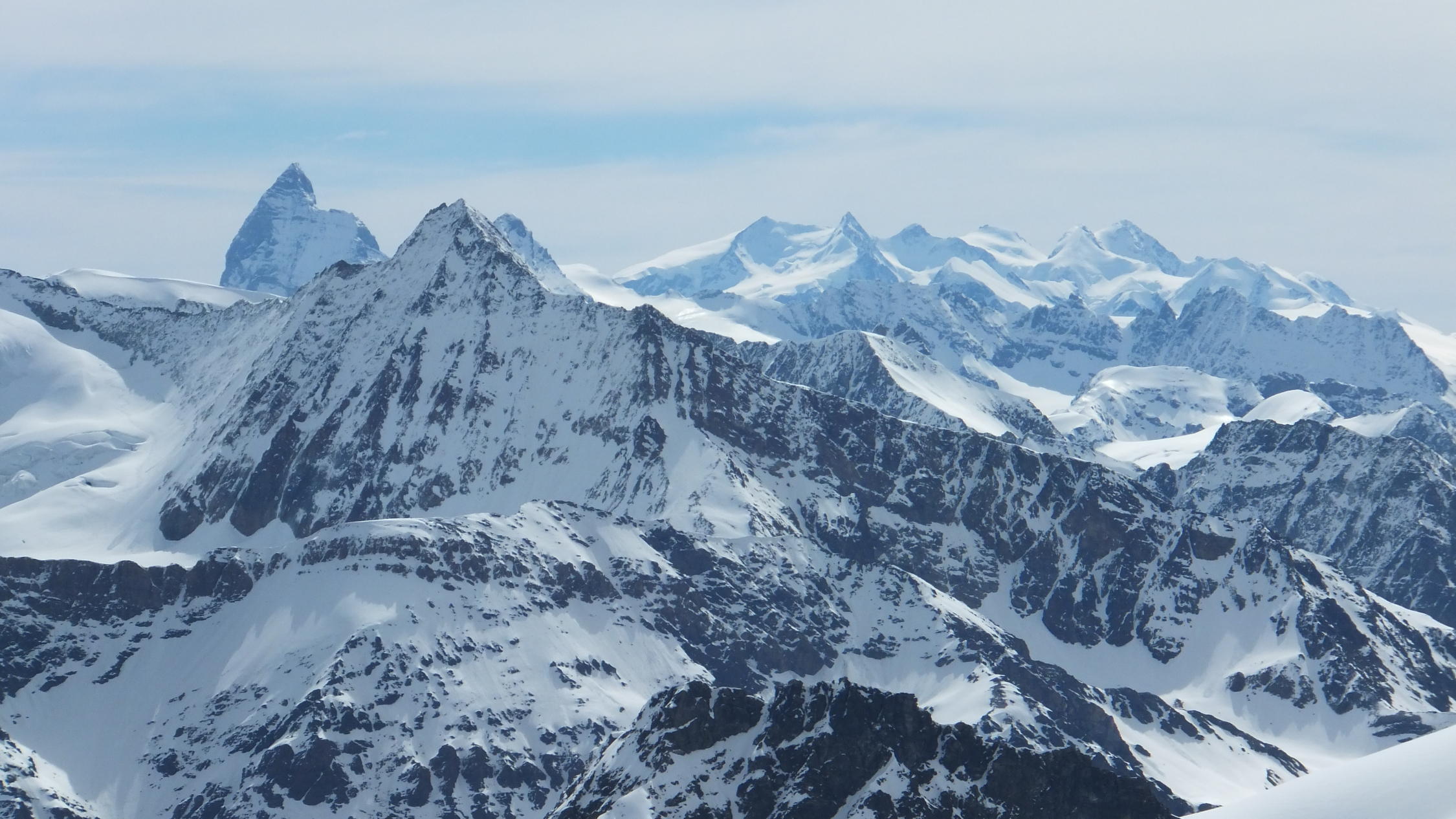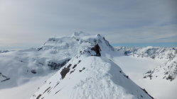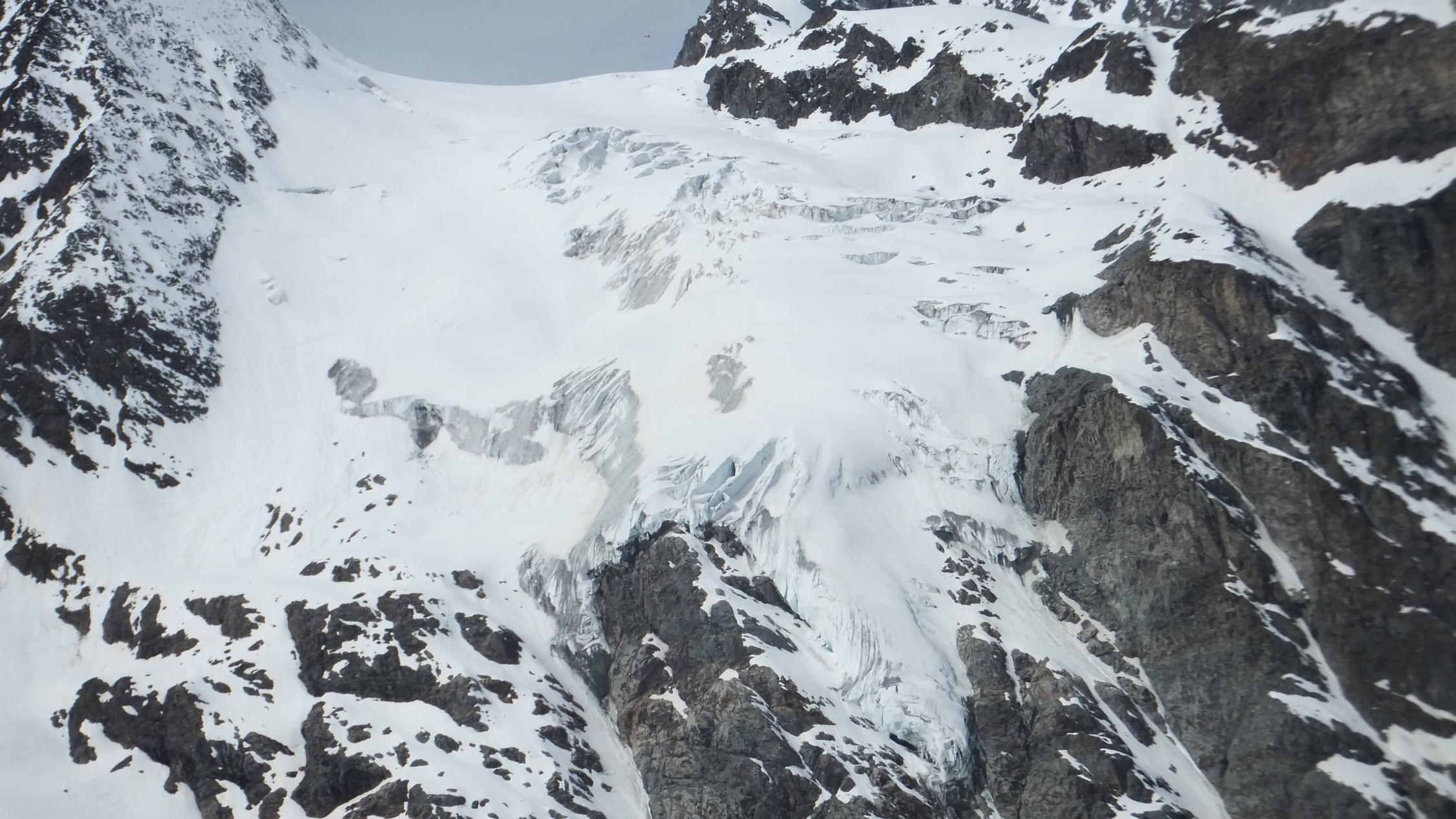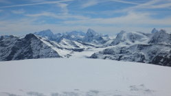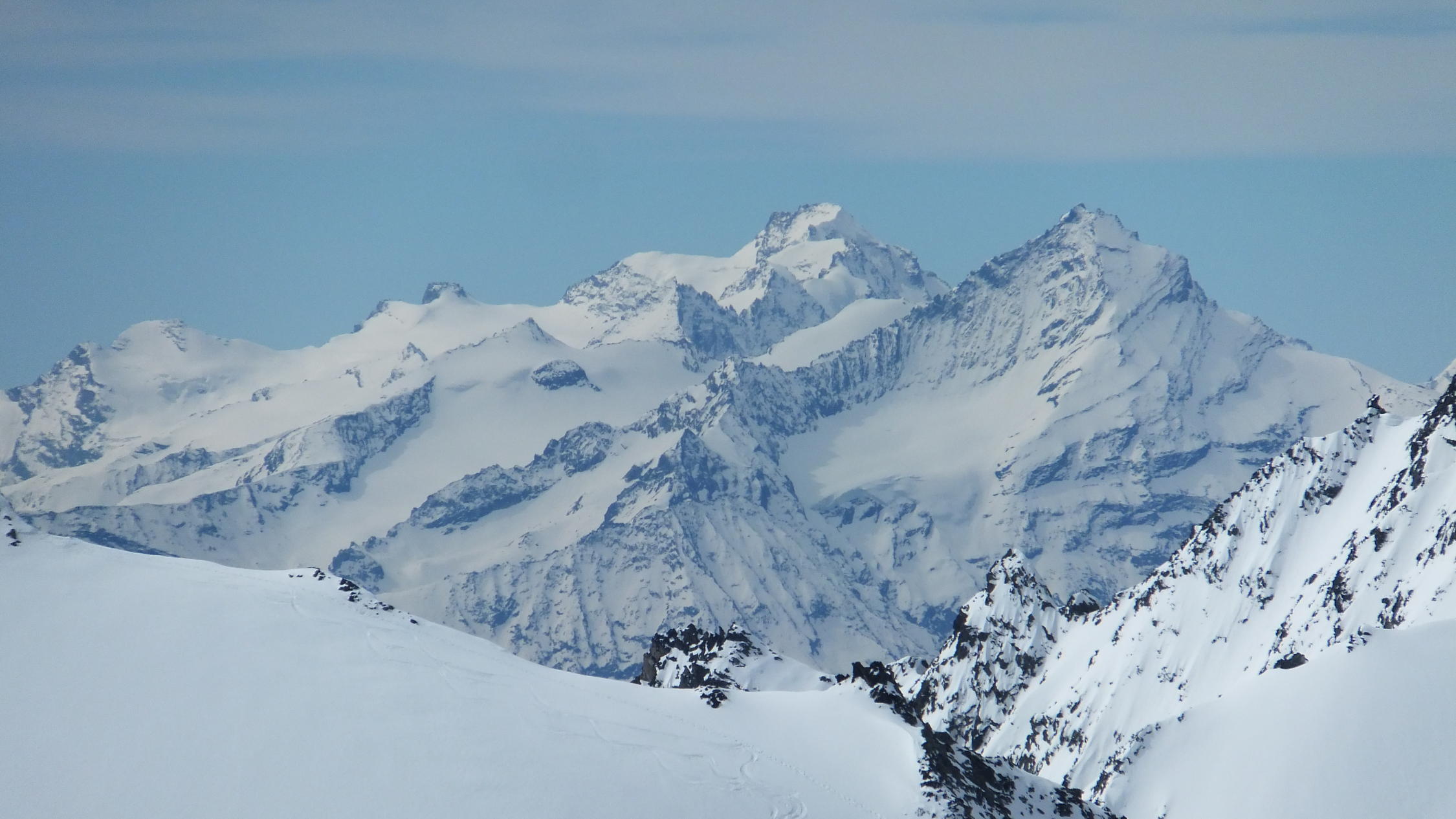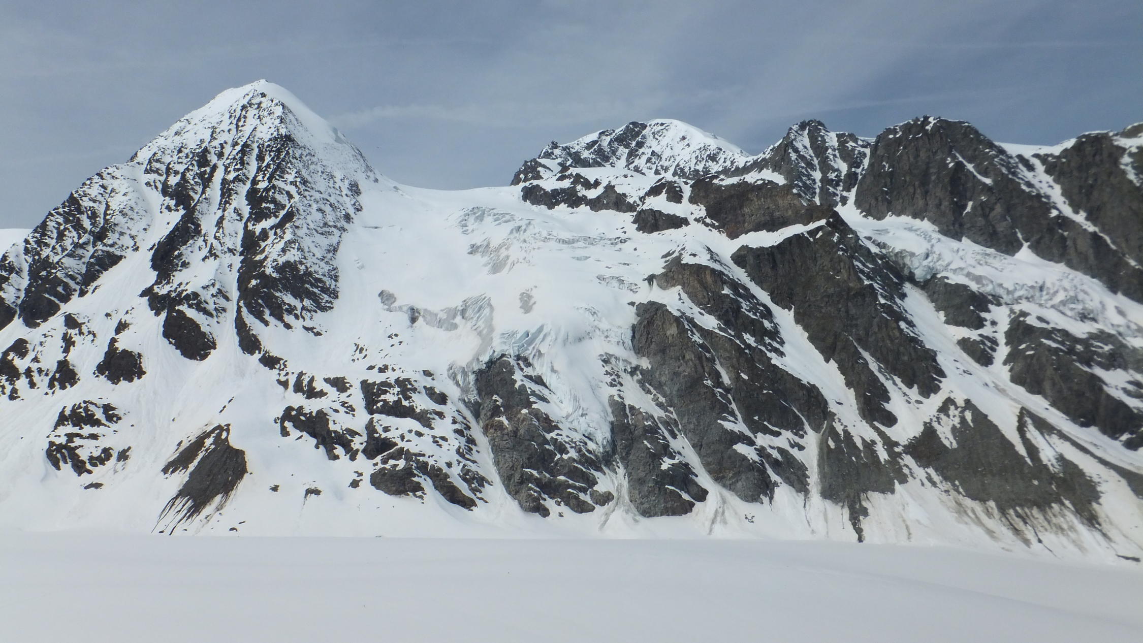 Aufstieg zum Petit Combin und Abfahrt durch ein Couloir. Im Butterfirn weiter über den Follatsgletscher. Im Steilstück weich, aber gut zu fahren. Querung über den Corbassieregletscher zur Hütte.