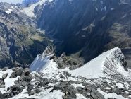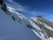Oben vor dem Schlussanstieg Punkt 3404, nochmal sehr loses Gestein, Kletterei ||+, dafür kein Schnee oder Eis. Oben im letzten Felsabschnitt Kletterei |||, schwieriger Empfunden als angegeben mit Blankeis, nicht zu umgehen, keine Absicherung möglich. Danach auf dem Firn teils Blankeis, gut umgehbar. Zeit bis zum Gipfel 9 Std.