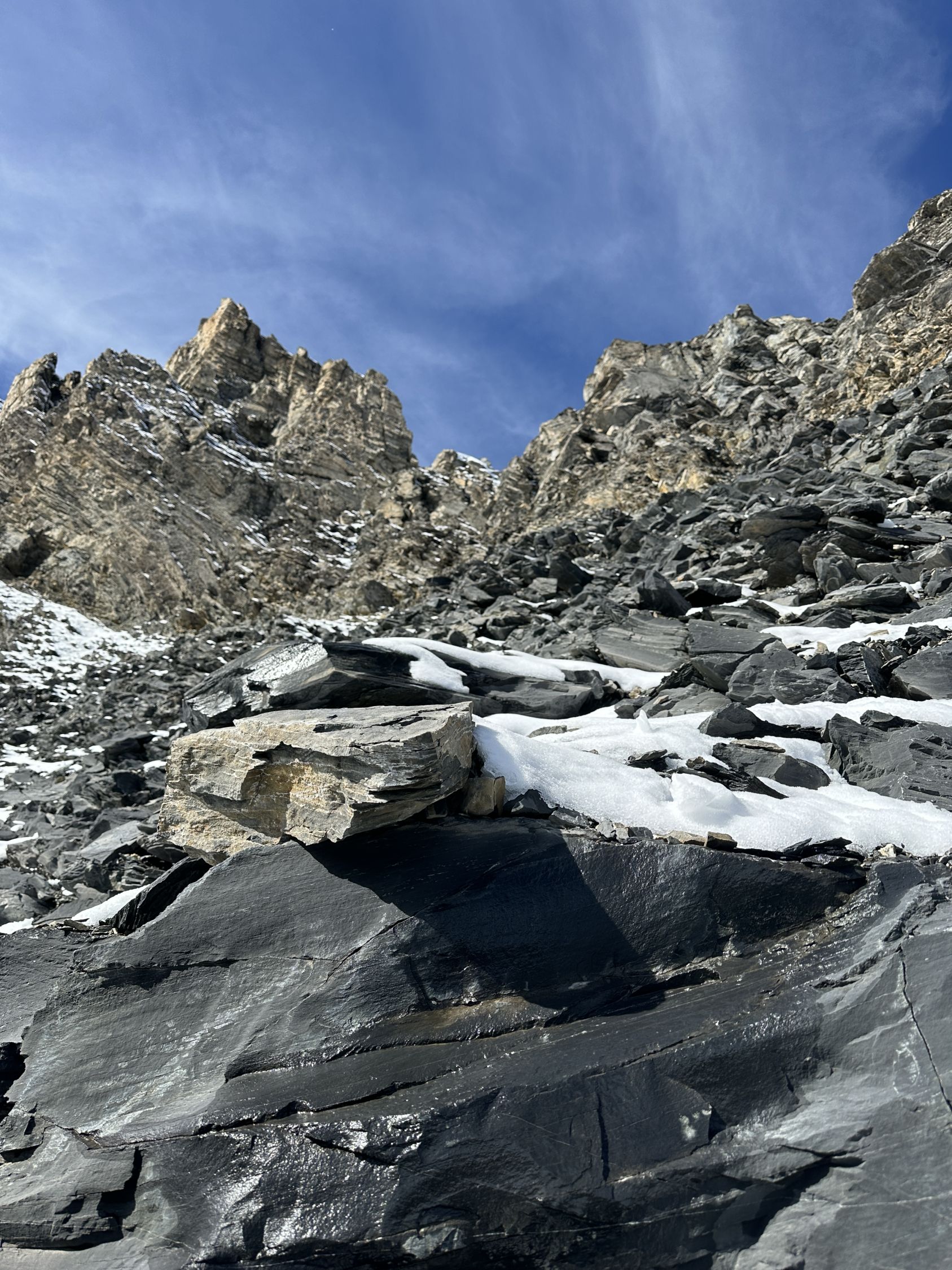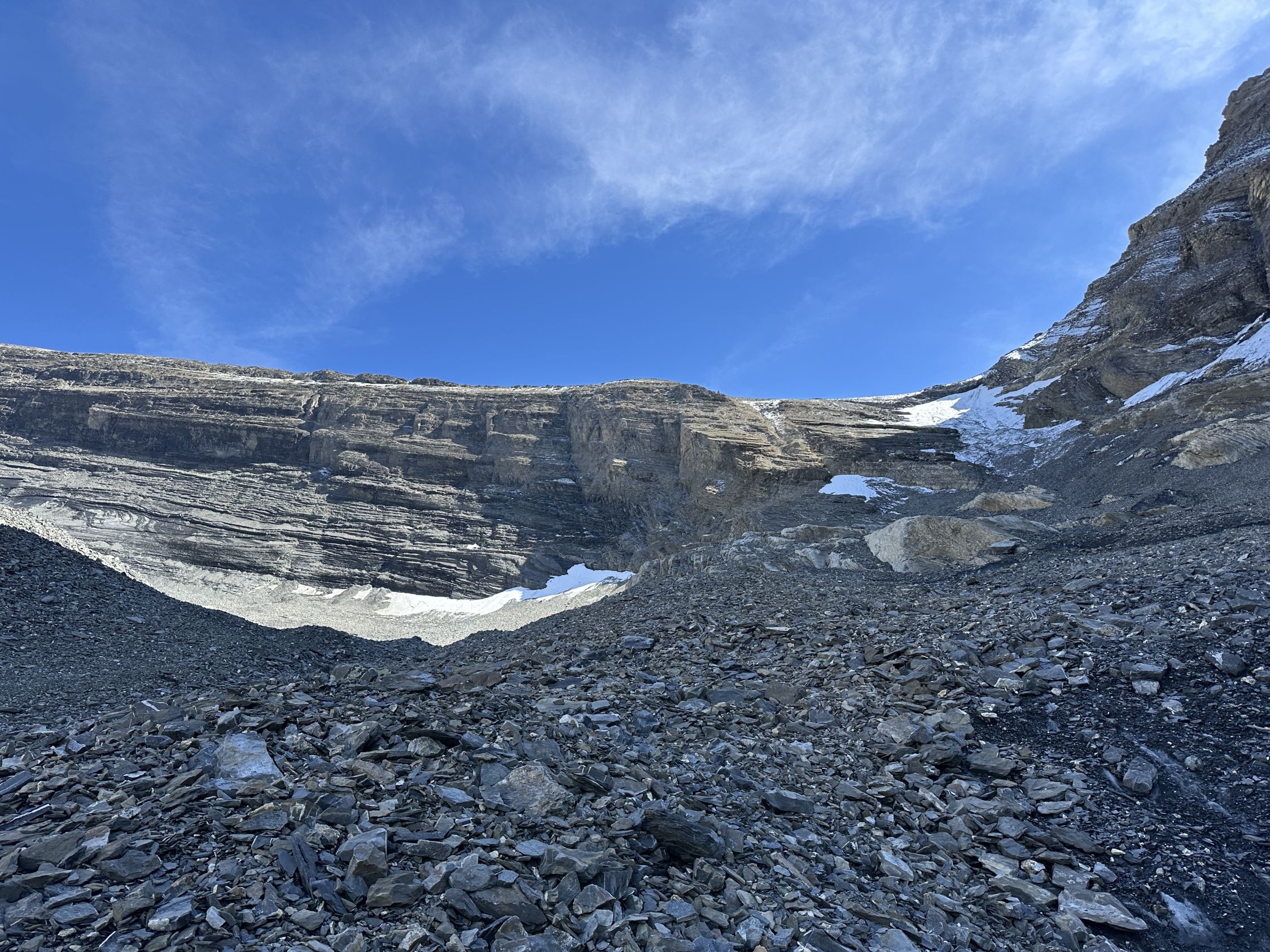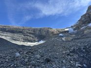 Immer wieder sichtbare Markierungen in Weiss oder rot (Pfeile) Wegfindung grundsätzlich gut, jedoch sehr zeitraubend. Übergang zum Couloir gut machbar, im Couloir kein Schnee oder Eis drin. Durch den Schnee auf dem losen Gestein besserer Halt als erwartet. Jedoch immerwieder Steinschlaggefahr.
